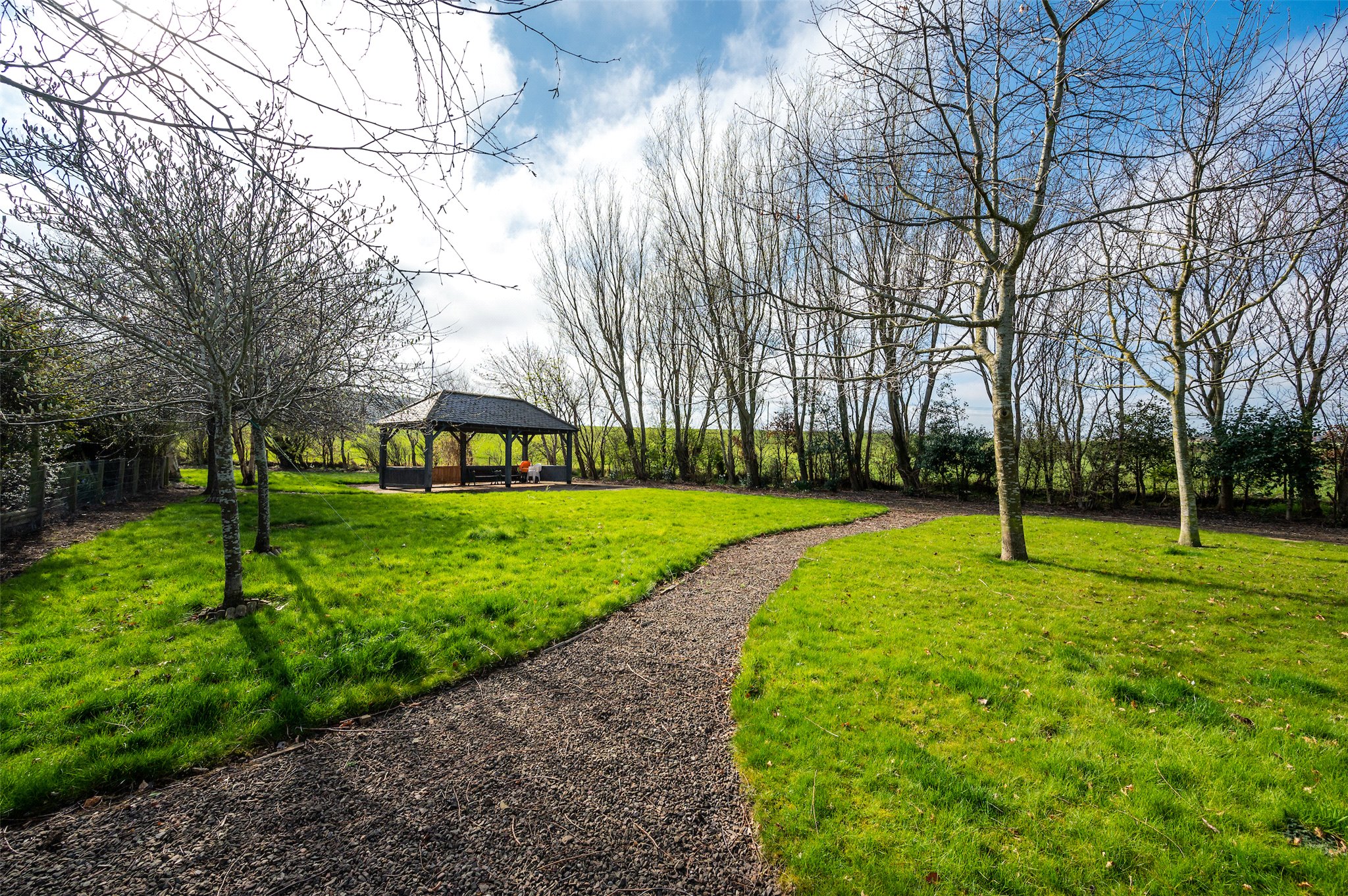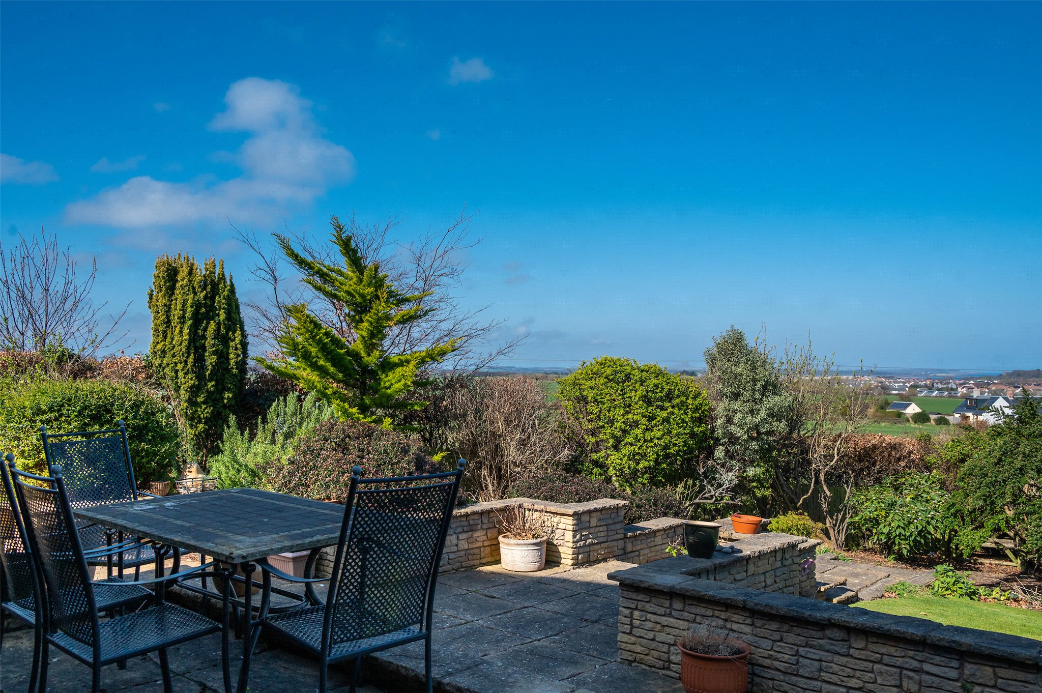 Garden: A private front garden with stunning views down to the coast, predominantly laid to lawn with a raised patio area, herbaceous border and interspersed with specimen trees.