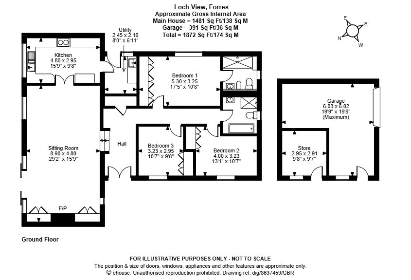 - Ground Floor: Reception Hall leading to large Sitting Room, with double doors connecting to Kitchen and Utility. Three Bedrooms, one en suite, Family Bathroom