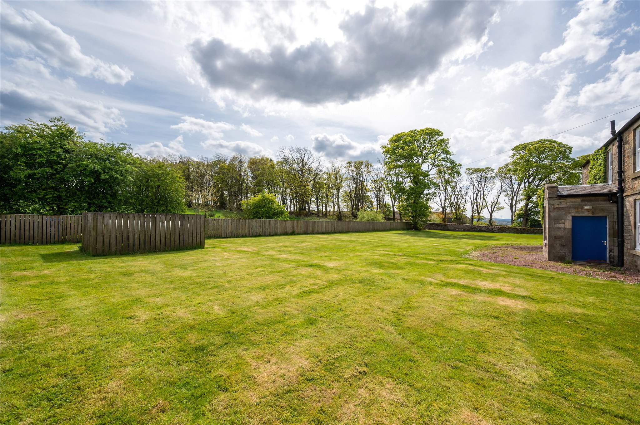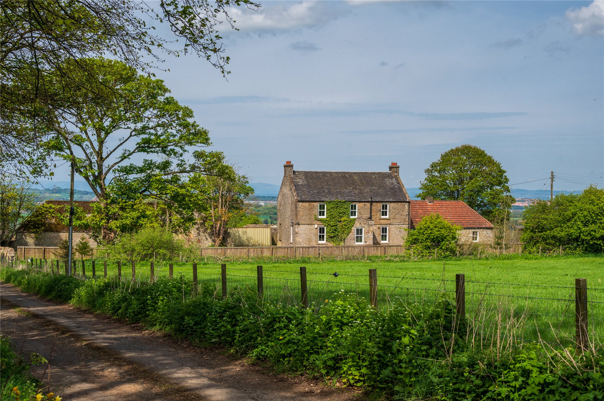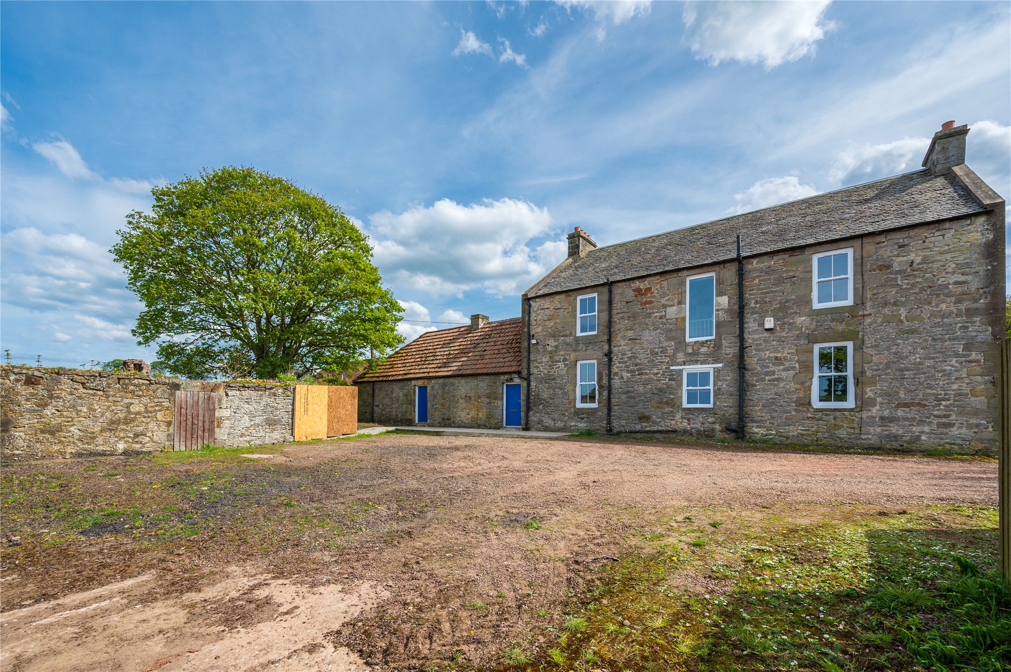 Private driveway leading to rear of the plot where there is a large car parking and turning area. There is also a collection of former steading buildings, which present scope for development – subject to obtaining all necessary permissions and consents - or could be cleared to create an expansive garden area governed by striking, far-reaching views across the undulating countryside.