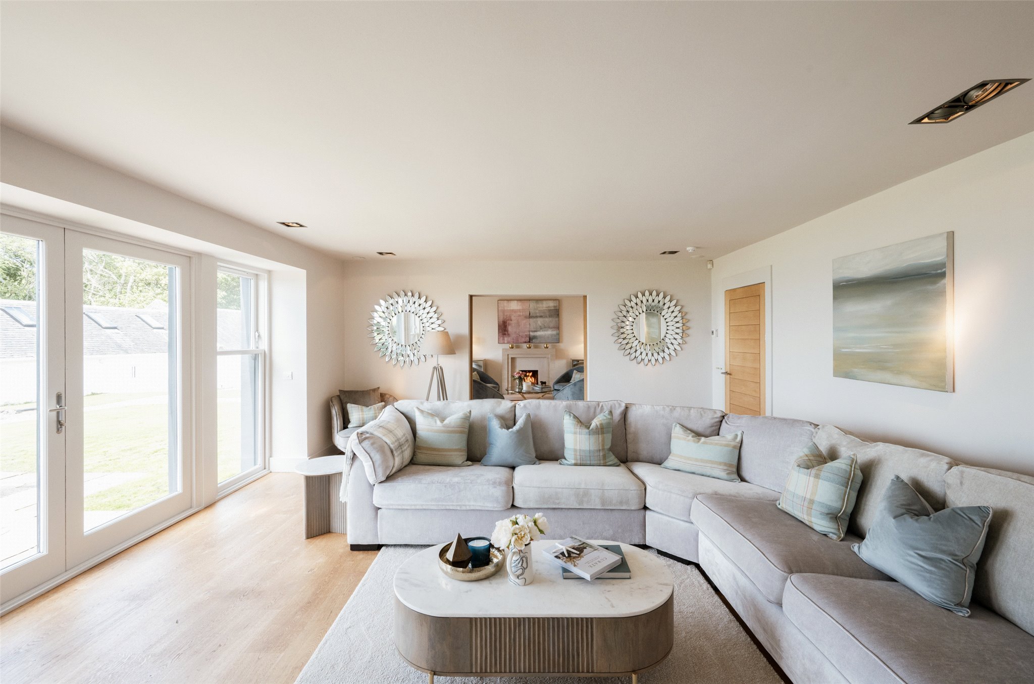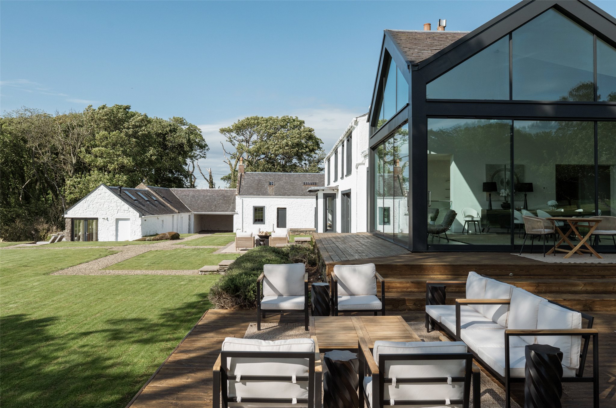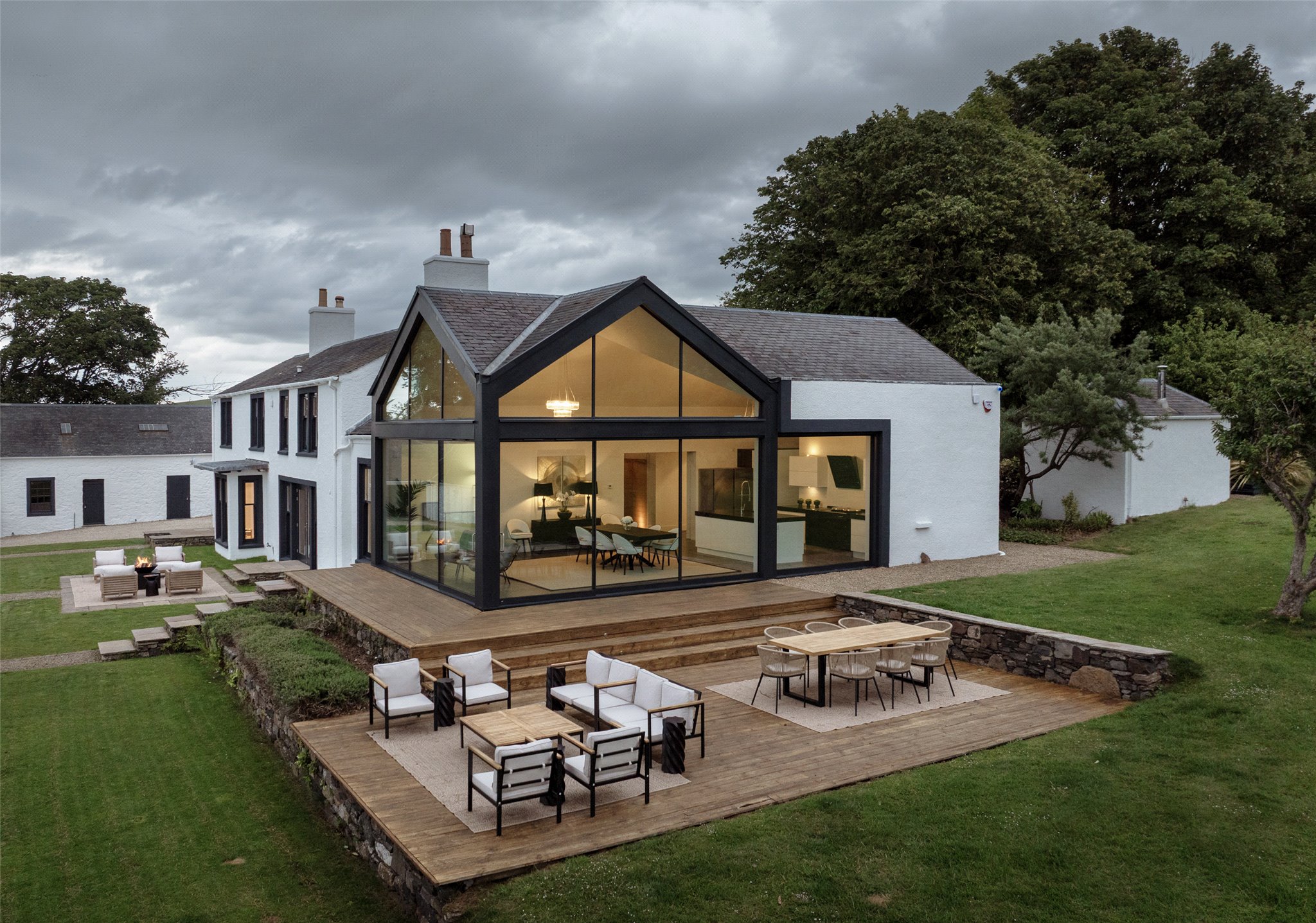 The main house includes six bedrooms, four of which are en suite. The design pays respect to the original farmhouse while incorporating modern features such as underfloor geothermal heating and woodburning fireplaces. The lounge and snug complement the open-plan areas, providing spaces for both entertaining and quiet relaxation.