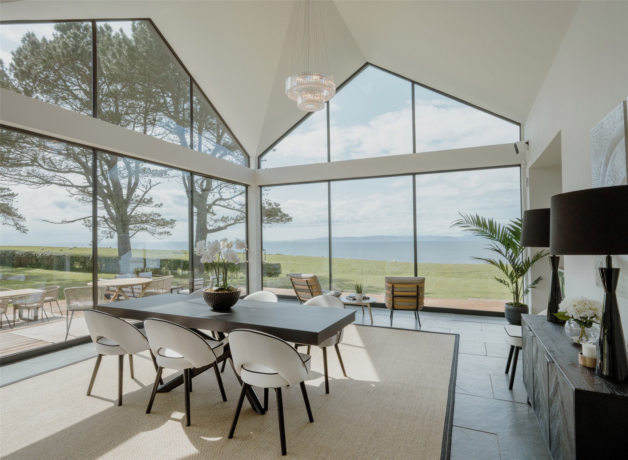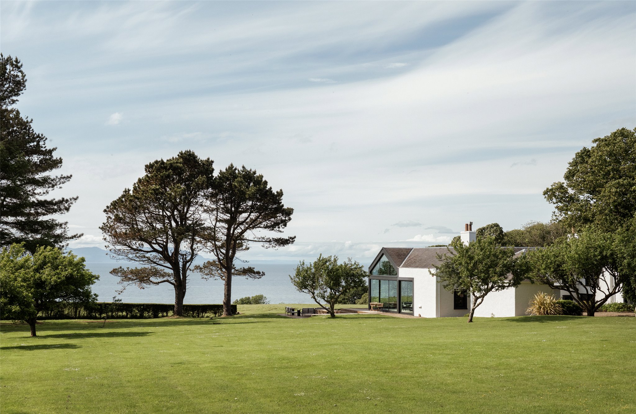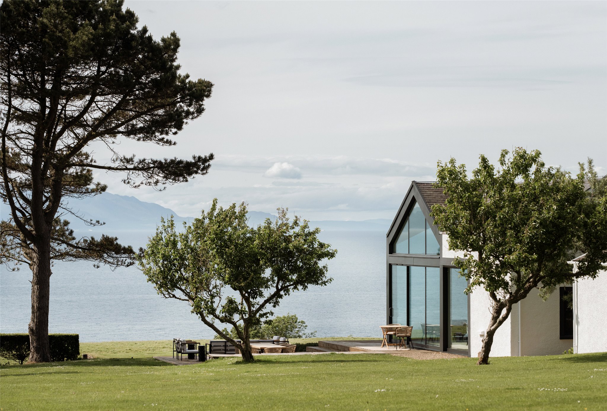At the heart of Drumbain is an open-plan glass-walled kitchen and dining space, where floor-to-ceiling windows provide uninterrupted views across the Firth of Clyde. From calm morning mists to dramatic weather sweeping across the water, the setting changes with the seasons. The south and west-facing timber terrace opens directly from the living area, offering an ideal space to enjoy the coastal environment.