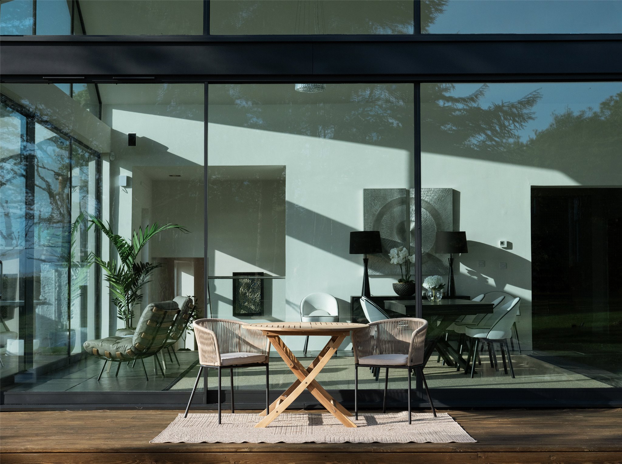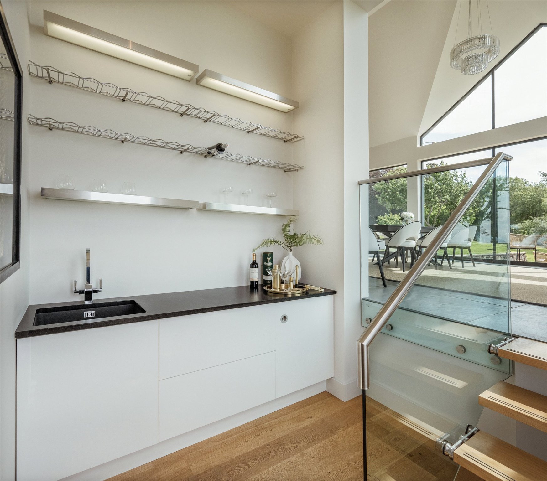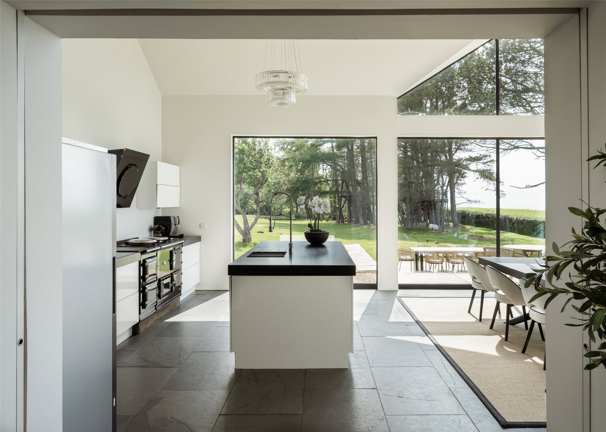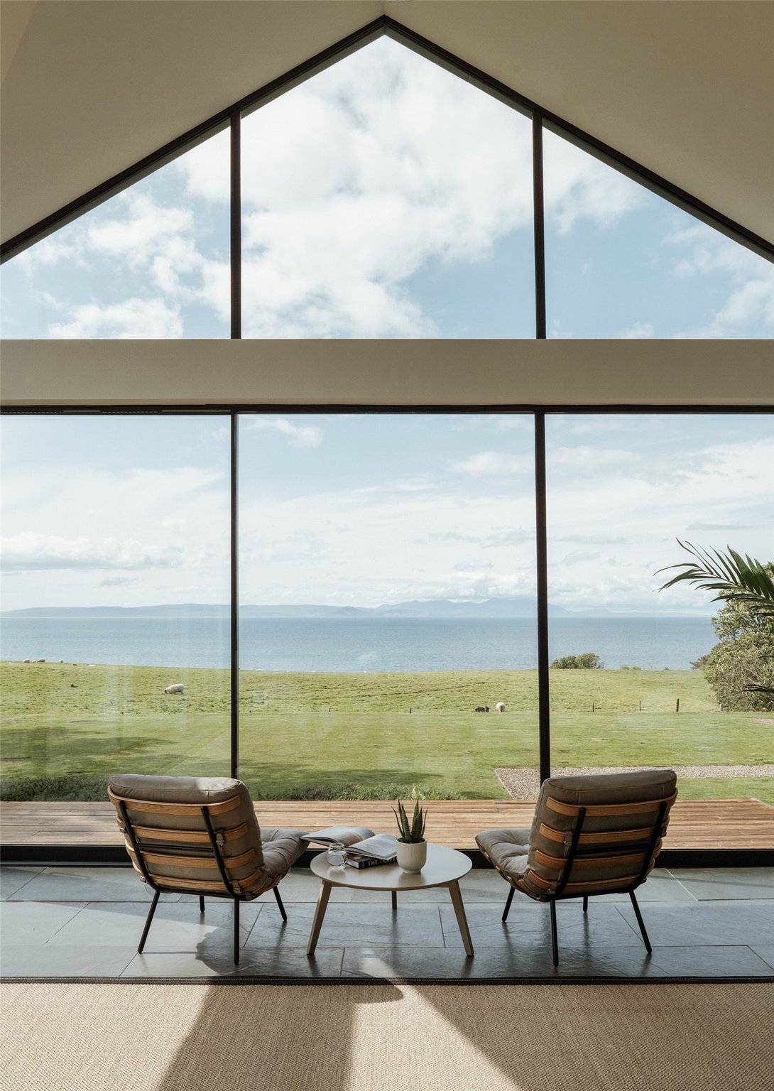 At the heart of Drumbain is an open-plan glass-walled kitchen and dining space, where floor-to-ceiling windows provide uninterrupted views across the Firth of Clyde. From calm morning mists to dramatic weather sweeping across the water, the setting changes with the seasons. The south and west-facing timber terrace opens directly from the living area, offering an ideal space to enjoy the coastal environment.