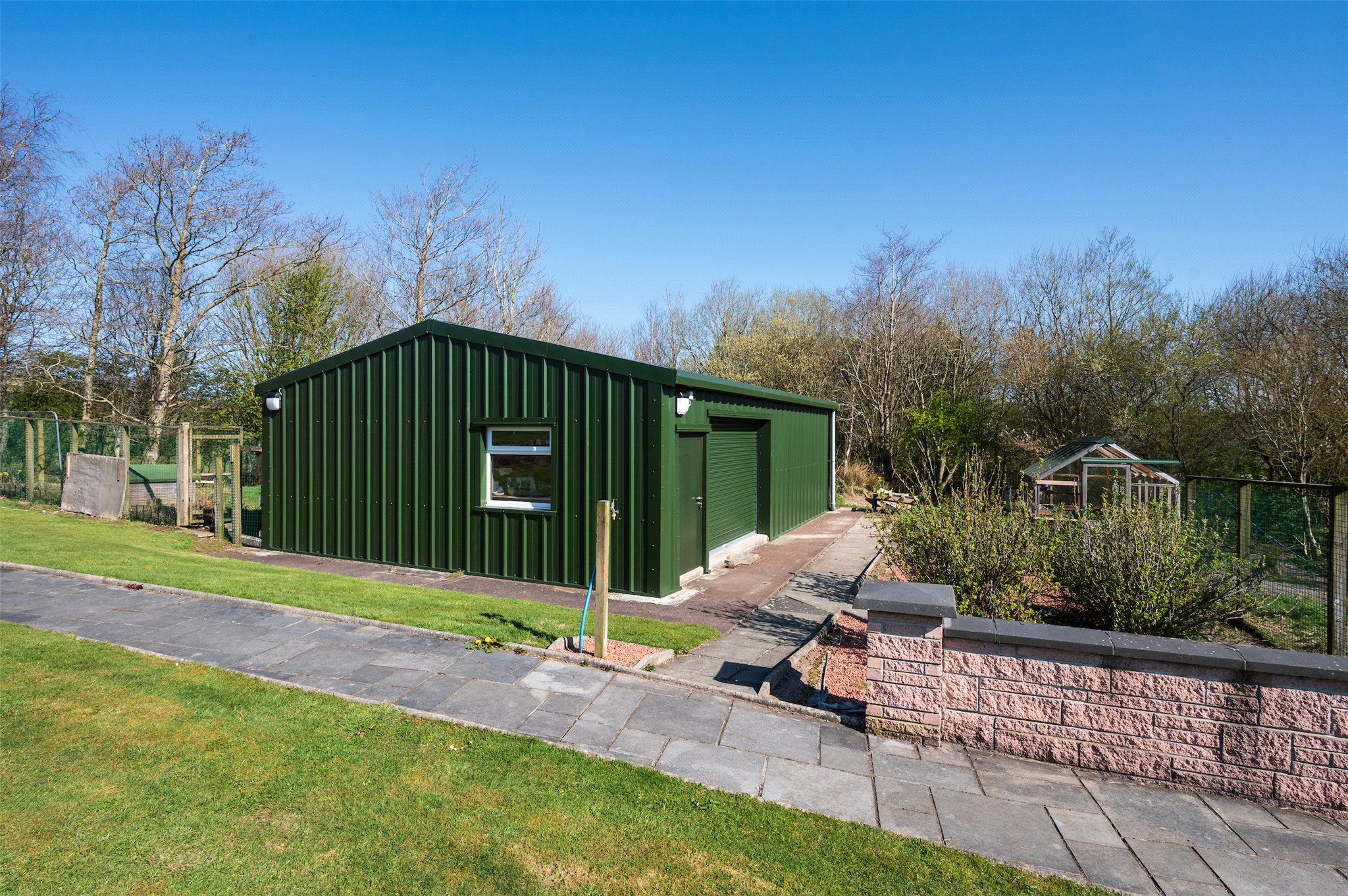 Outbuildings: Large Shed/Store/Workshop, BBQ Hut linked with an Entertaining Hut and Greenhouse.