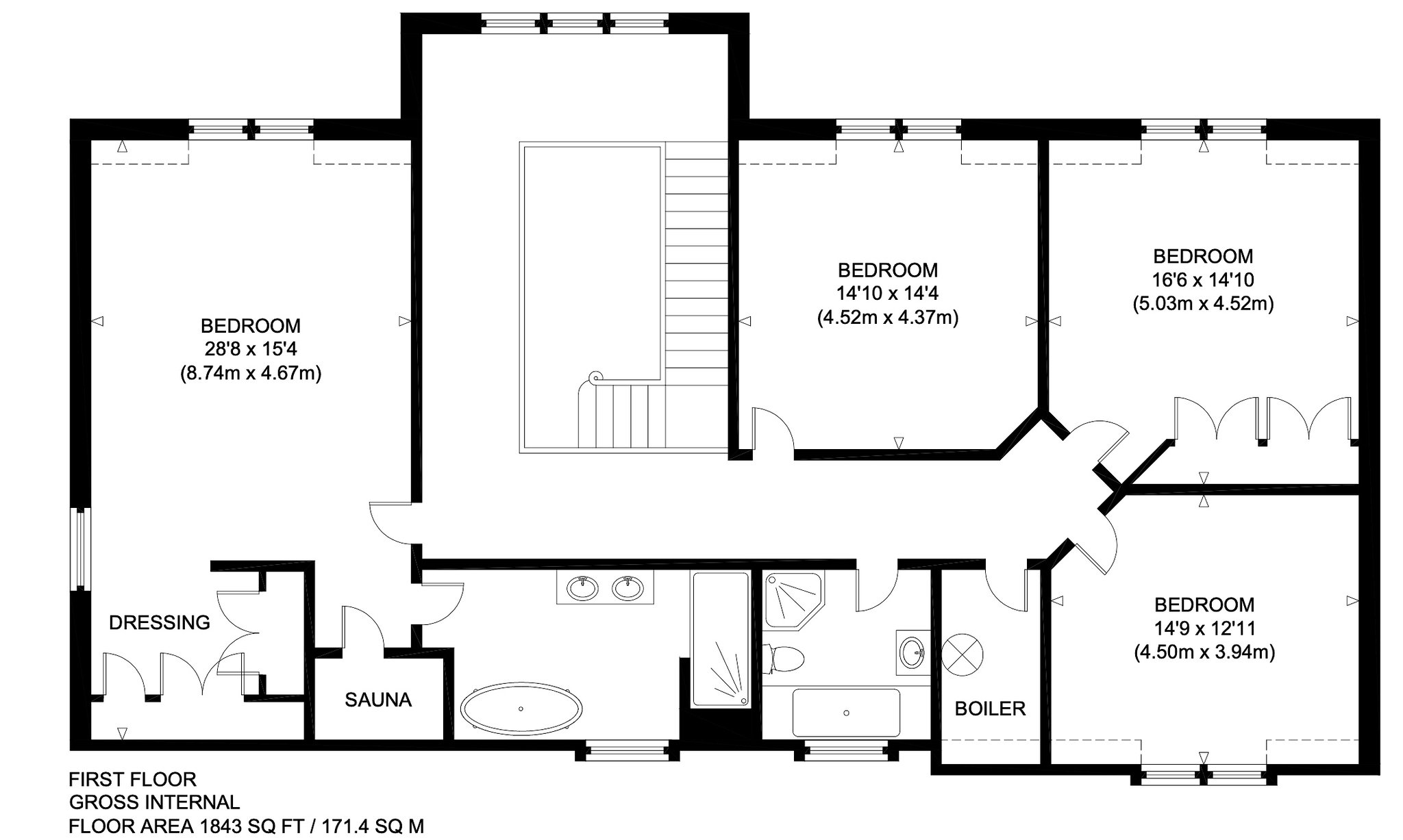 First Floor: Landing, Principal Bedroom with Dressing Room, Bathroom and Sauna, Three further Double Bedrooms and Family Bathroom.