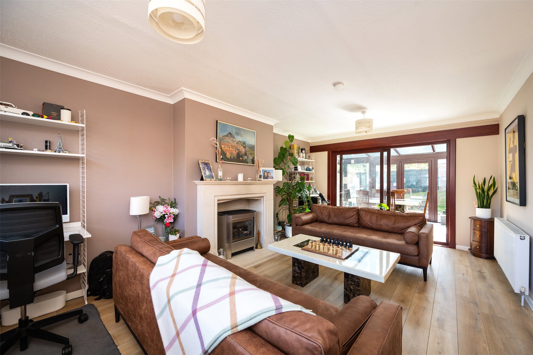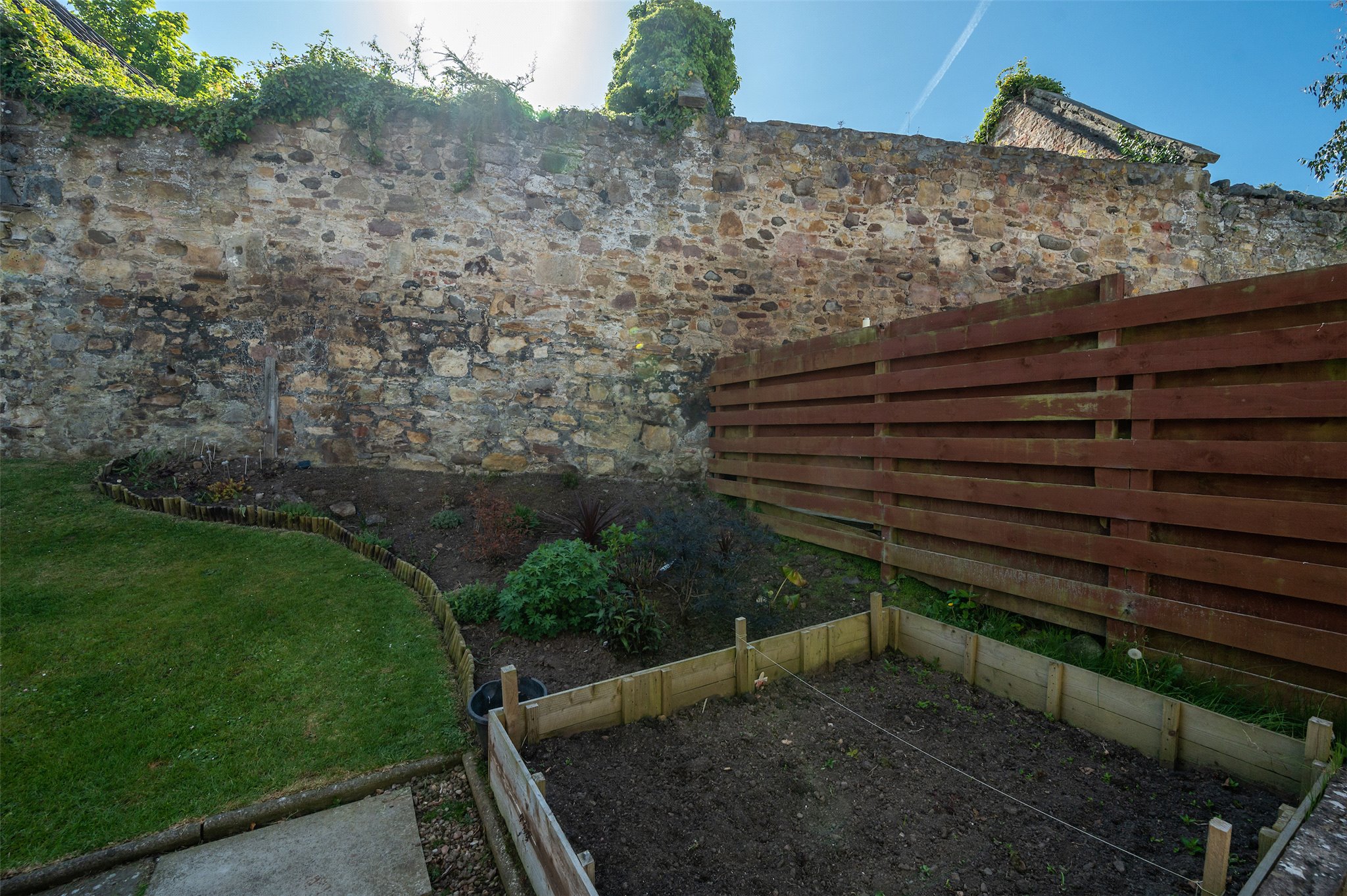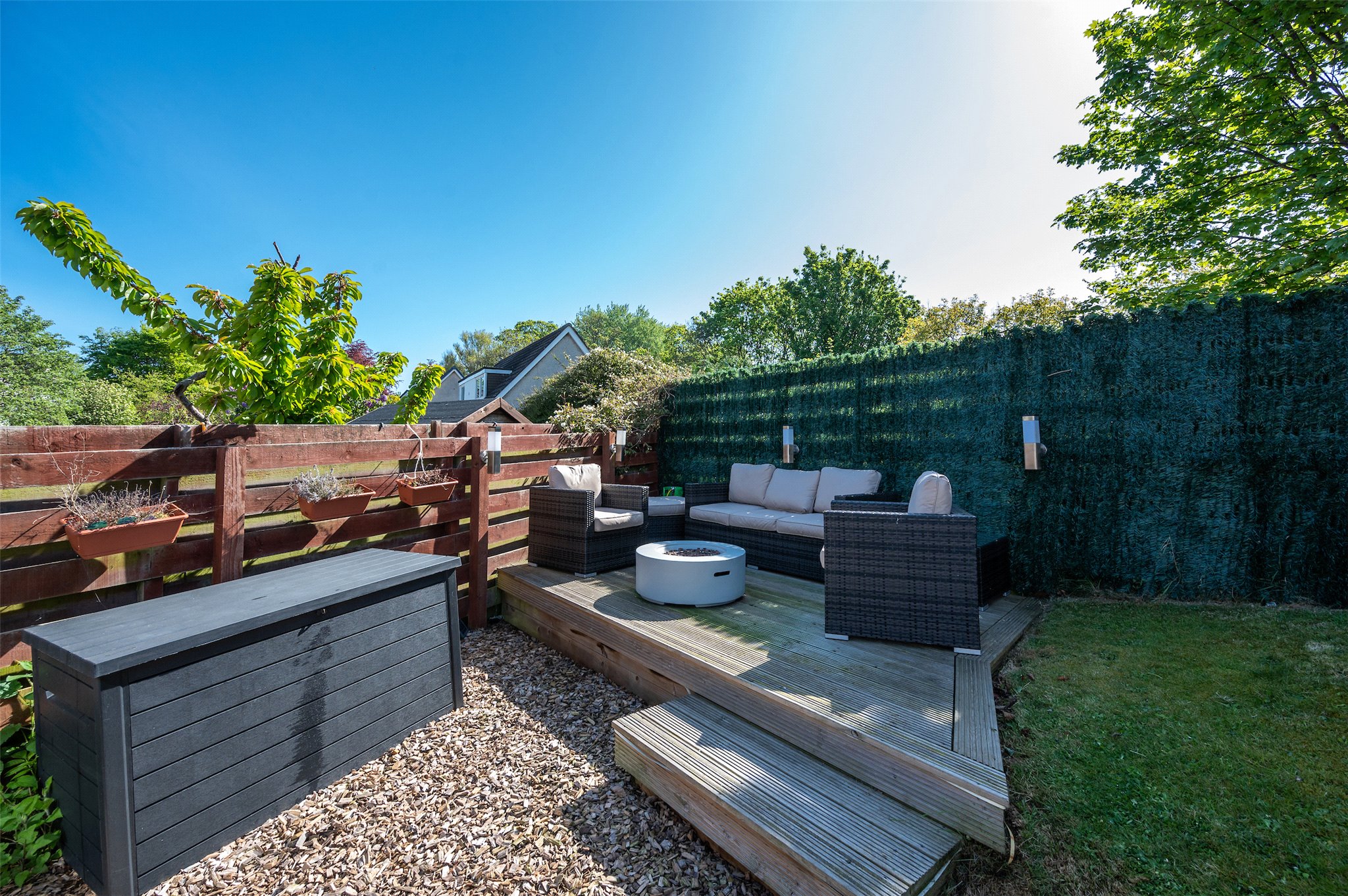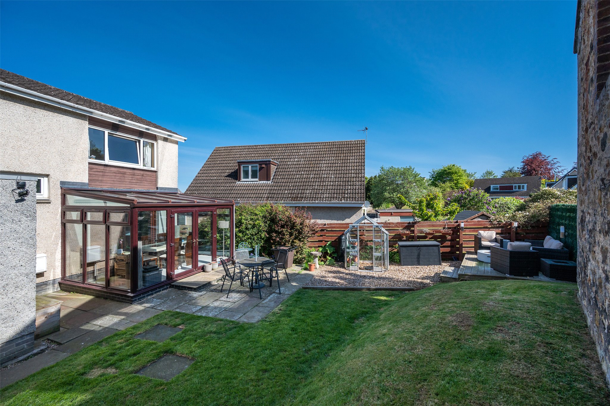 Garden: A front and rear garden, predominantly laid to lawn, with herbaceous borders, a raised vegetable bed, raised deck and extensive patio.