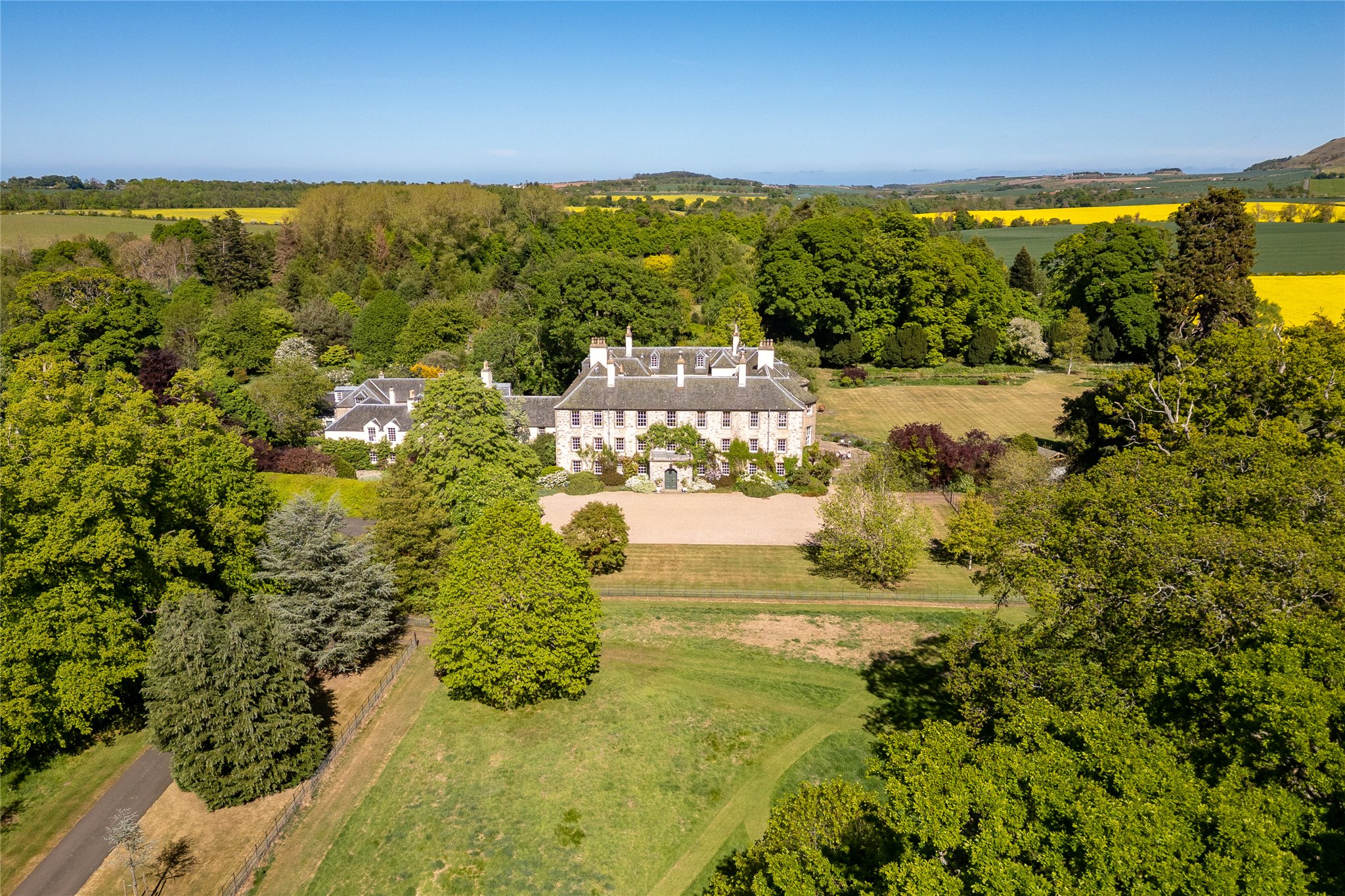 Stevenson House is a beautifully restored 16th-century country residence, set within approximately 21.47 acres (8.68 hectares) of private grounds, including a tranquil stretch of the River Tyne. The estate offers a rare combination of seclusion and accessibility, with mature woodlands, newly planted trees, and peaceful riverside walks enhancing its serene ambiance.