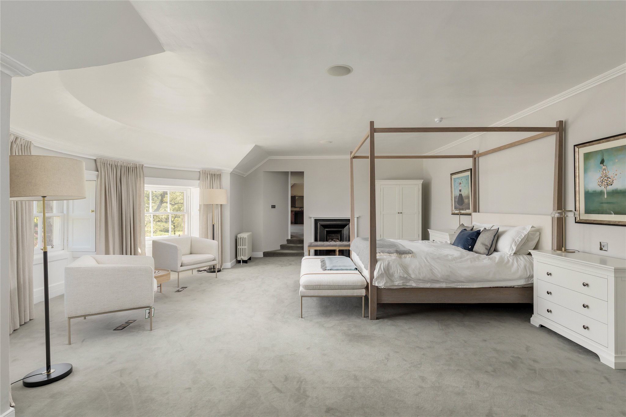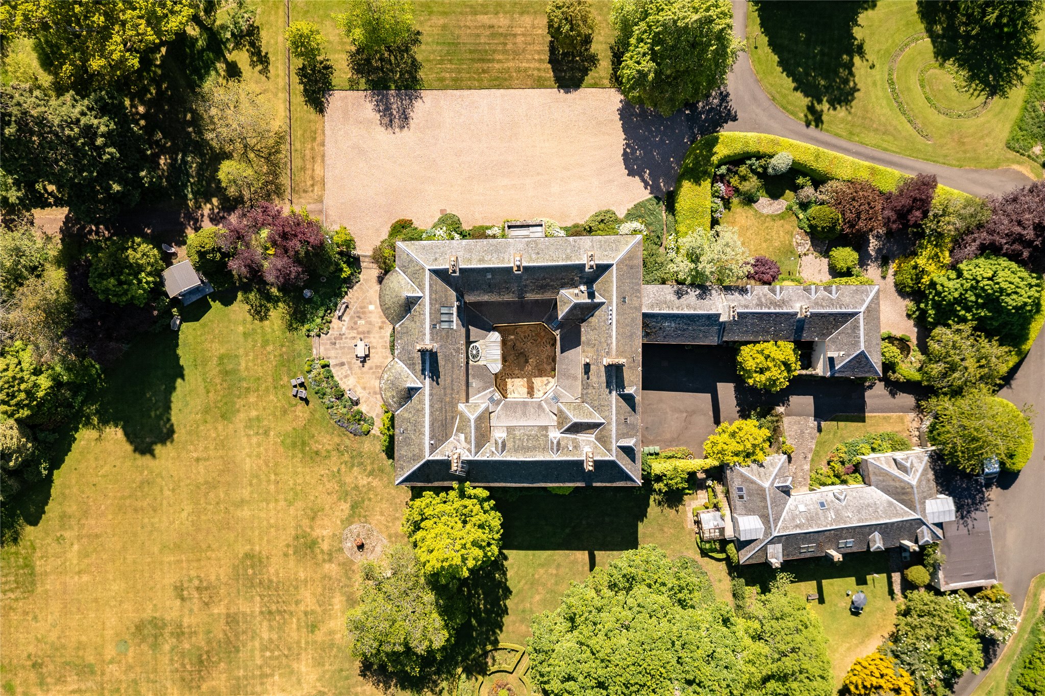The main house, dating from circa 1560, has been meticulously refurbished to a high standard and is presented in move-in condition. Its unique 'grange plan' design features a square layout around a central courtyard, rising three storeys with staircases at each corner. The first-floor reception rooms, added in the 17th century, are notably spacious and filled with natural light.