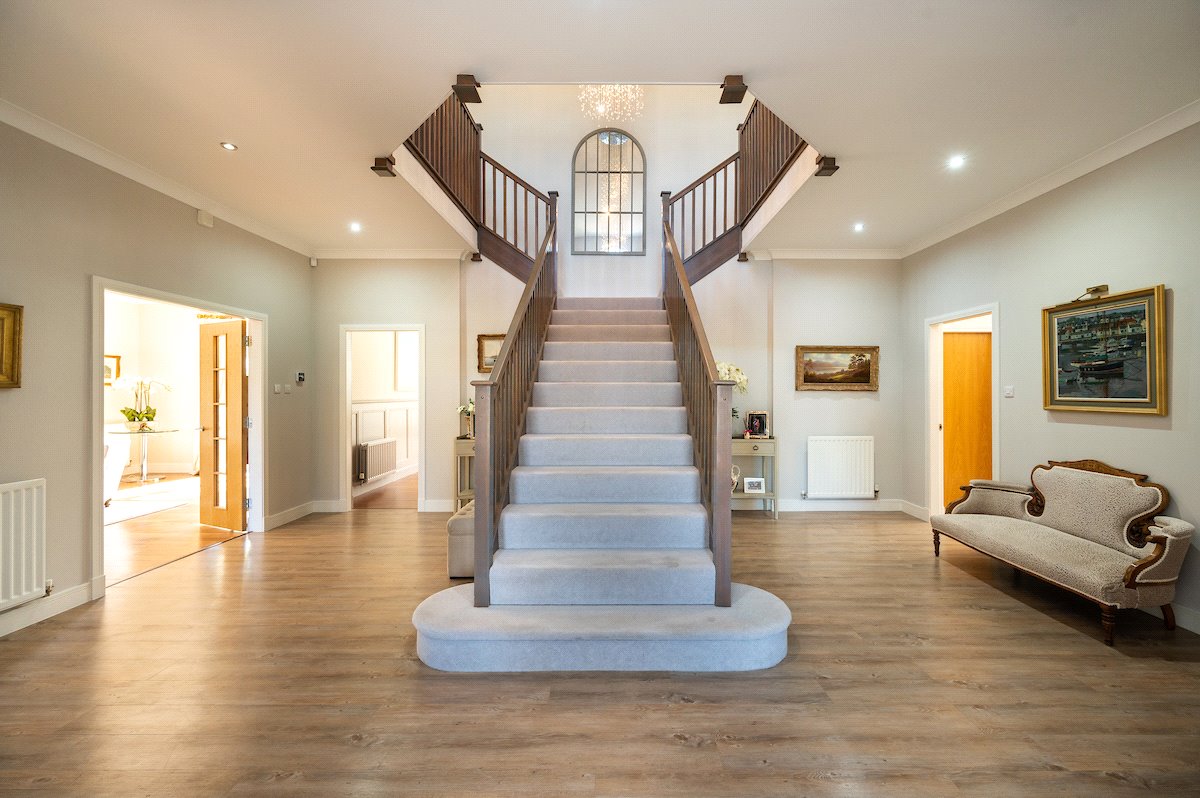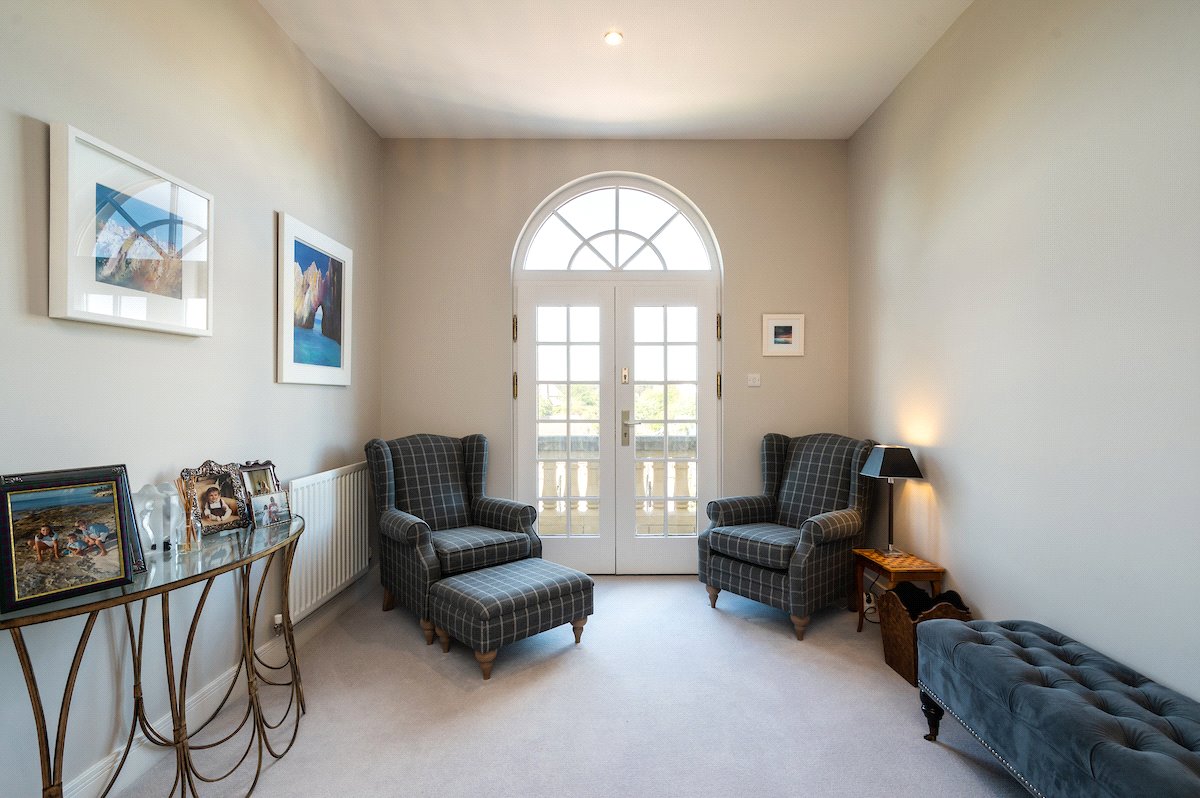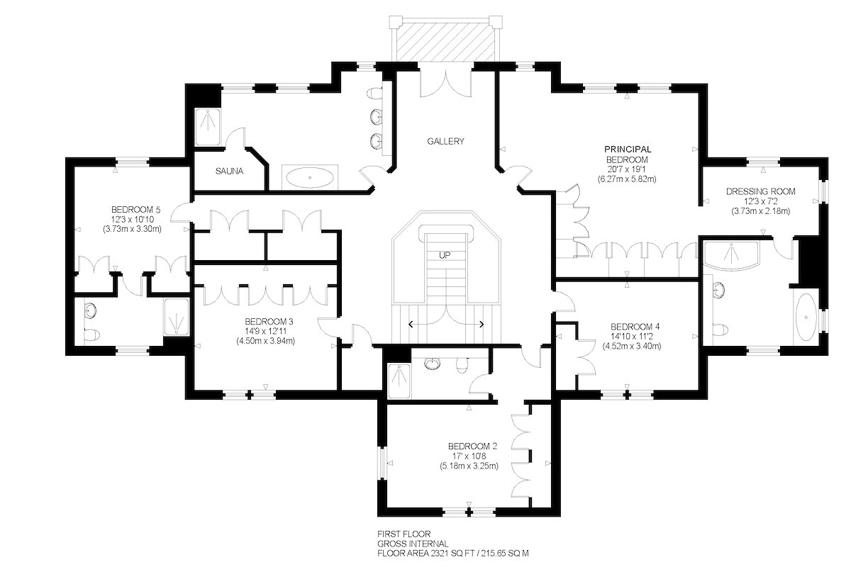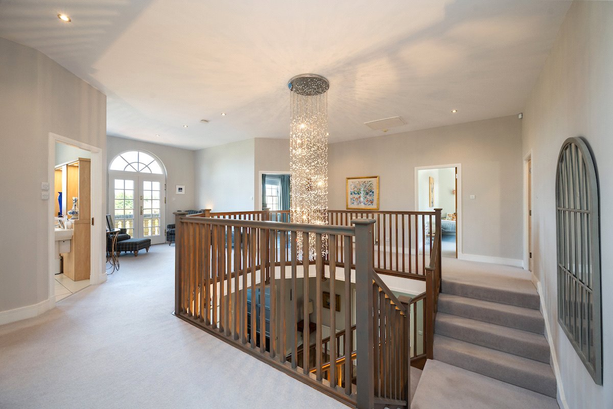 First Floor: Galleried Landing with Balcony, Principal Bedroom with Dressing Room and Ensuite Bathroom, Two Double Bedrooms with Ensuite Shower Rooms, Two further Double Bedrooms and a Family Bathroom with Sauna