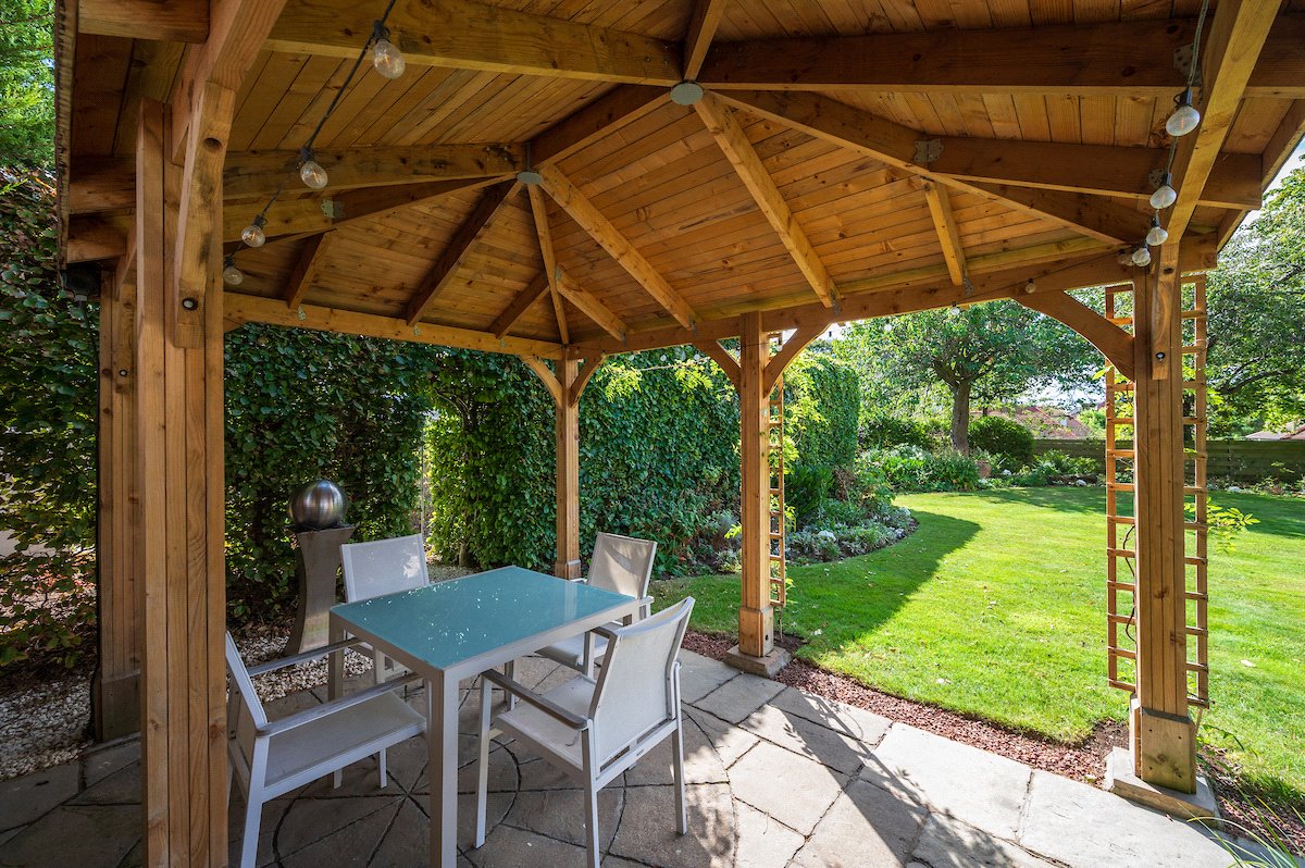 Garden: Beautiful established gardens to the front and rear with various sun terraces and an oak gazebo, together with an established fruit and vegetable garden