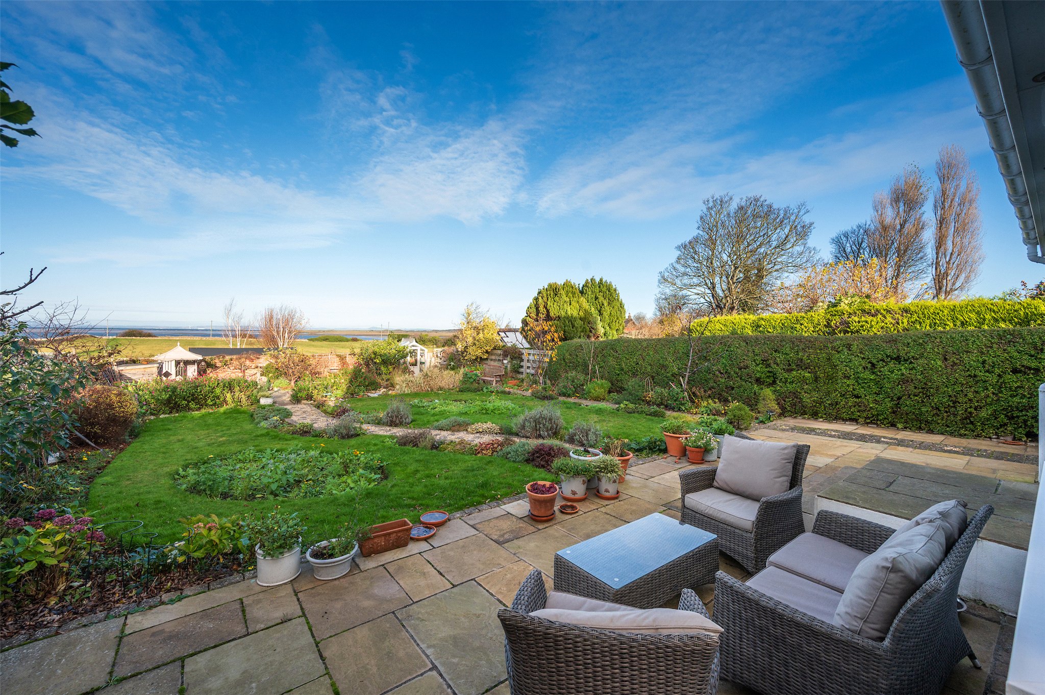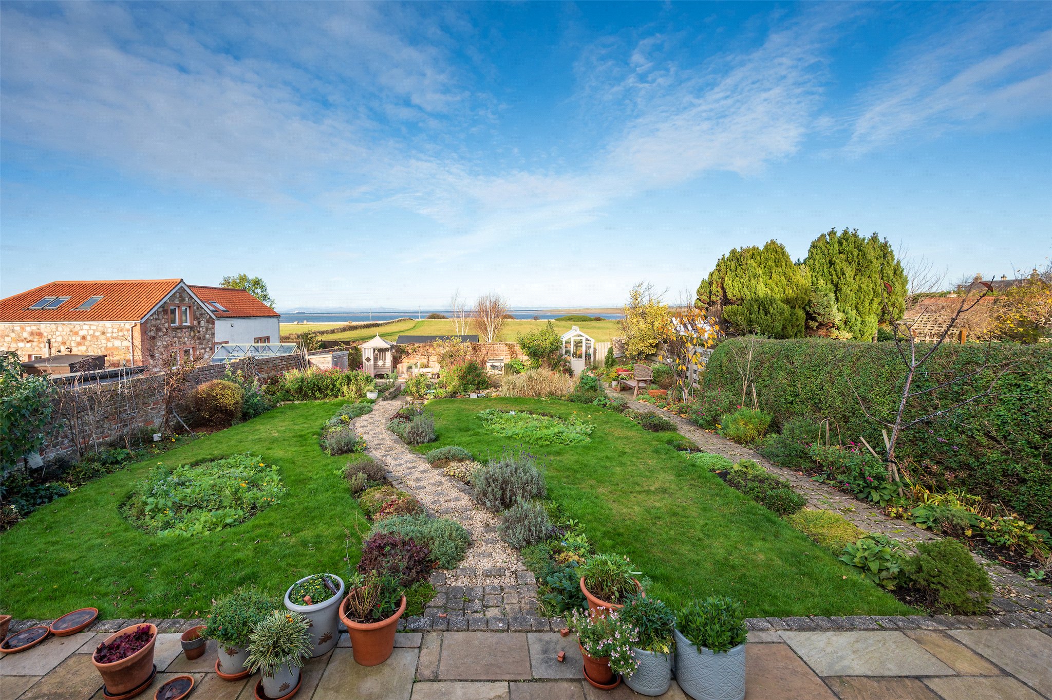 Garden: A beautifully maintained private rear garden, predominantly laid to lawn with colourful herbaceous borders, a feature pond and two patio areas perfect for alfresco dining. A pedestrian gate opens to a neighbouring field which offers direct access to Aberlady Bay.