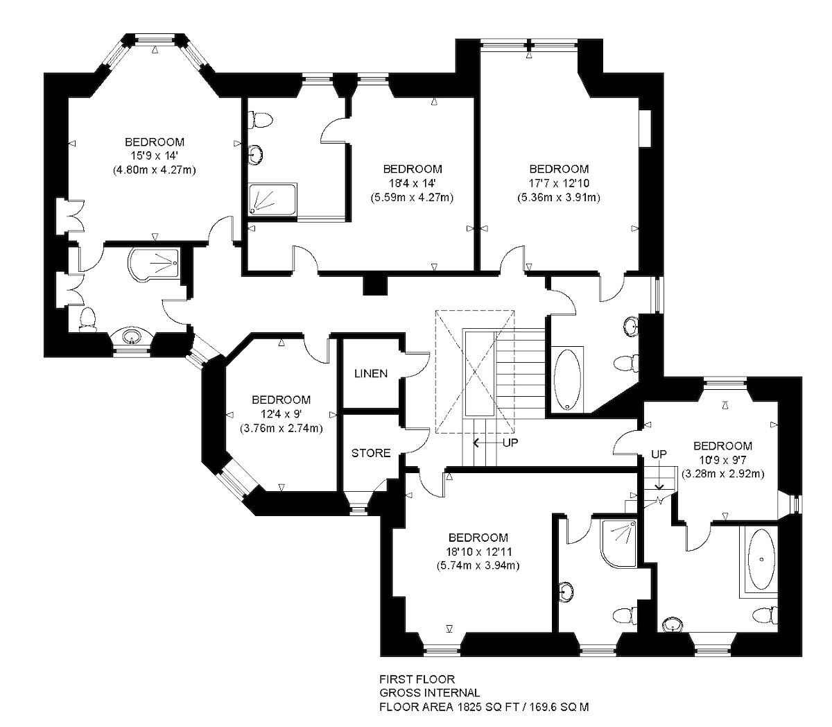 First Floor: Landing, Principal Bedroom with Ensuite Bathroom, five further Double Bedrooms; three with Ensuite Bathrooms and one with a Jack & Jill Bathroom, a Utility/Store Room and Linen Store