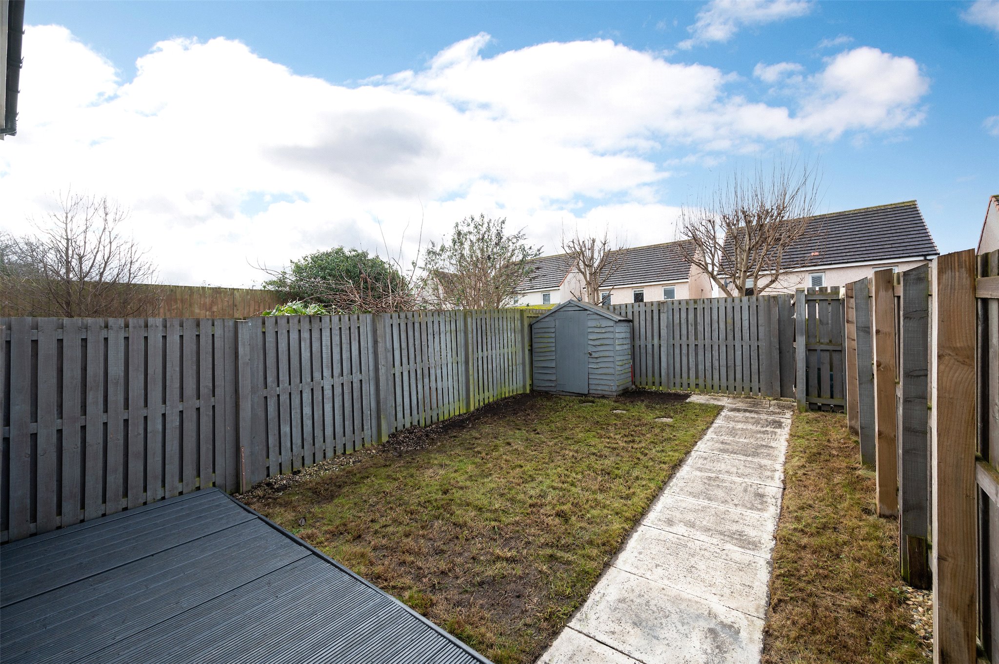 Garden: A private rear garden, predominantly laid to lawn, with raised decked area.