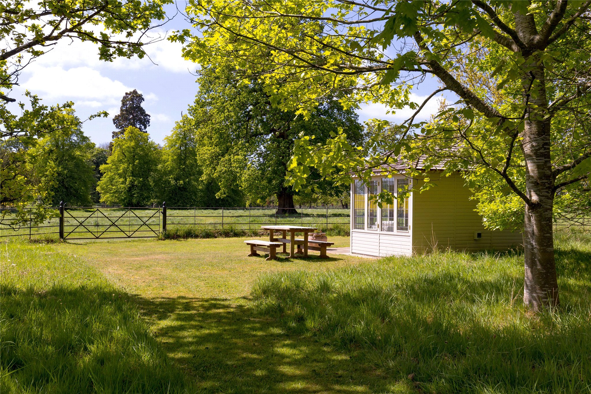 Grass paddock and parkland enclosed by wrought iron and post and rail fencing. Field Shelter and Courtyard Stable complex