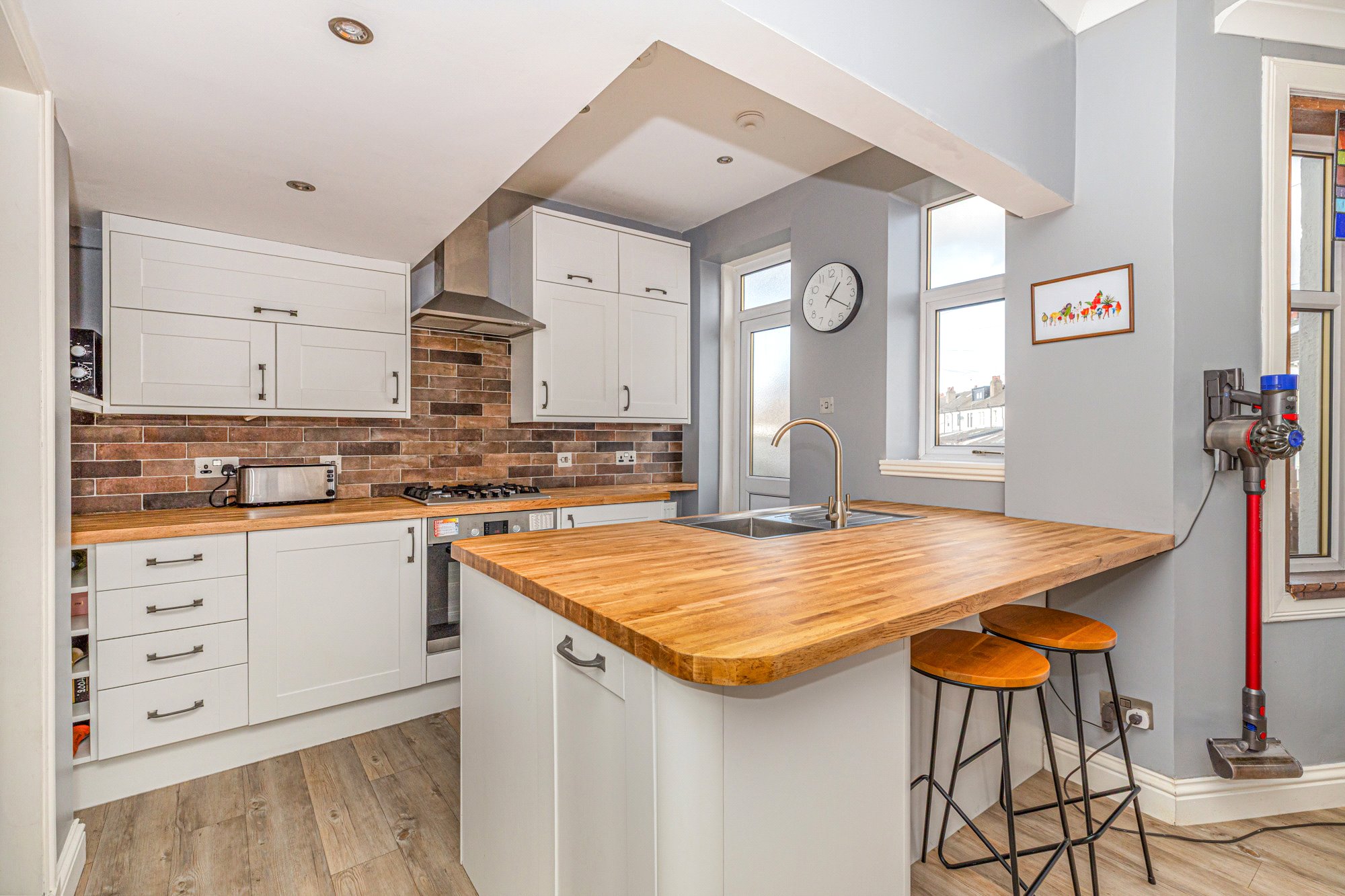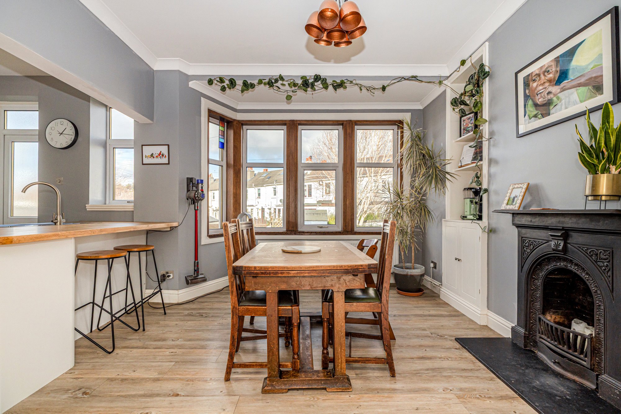 The accommodation of the house itself comprises welcoming reception hallway with understairs cupboard off, bay windowed lounge with cornice and refurbished floorboards with sliding door access through to the dining sized kitchen with bay windowed dining area, kitchen with a range of integrated appliances, base and wall mounted units, tiled splashback, hardwood worktop, breakfast bar and feature fireplace.