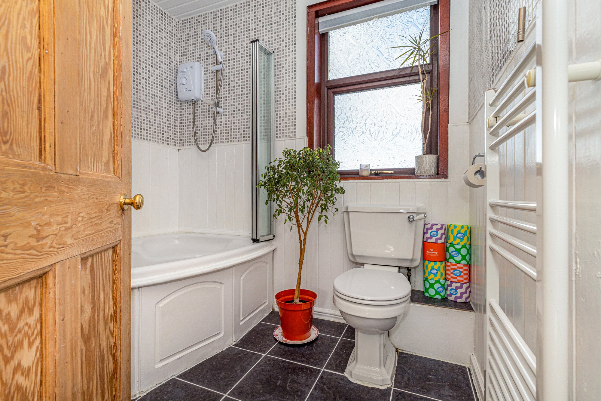 Upstairs the accommodation comprises double sized bedroom one, second double sized bedroom with two sets of integrated wardrobes, third bedroom that could easily be utilised as a home office or study and a tiled bathroom with three piece suite and over bath, electric shower.