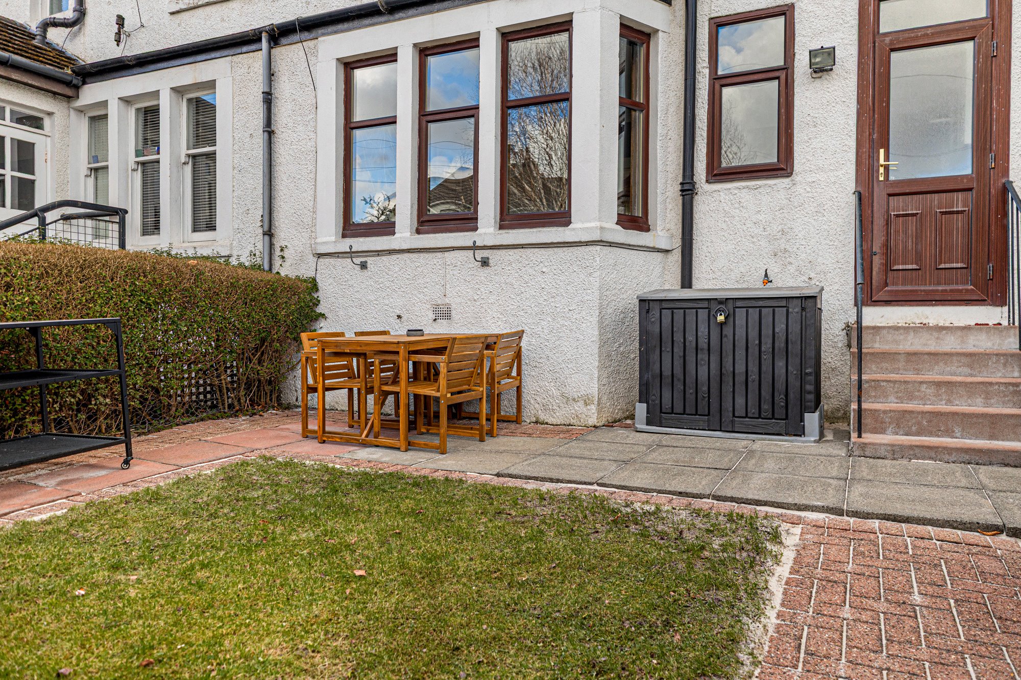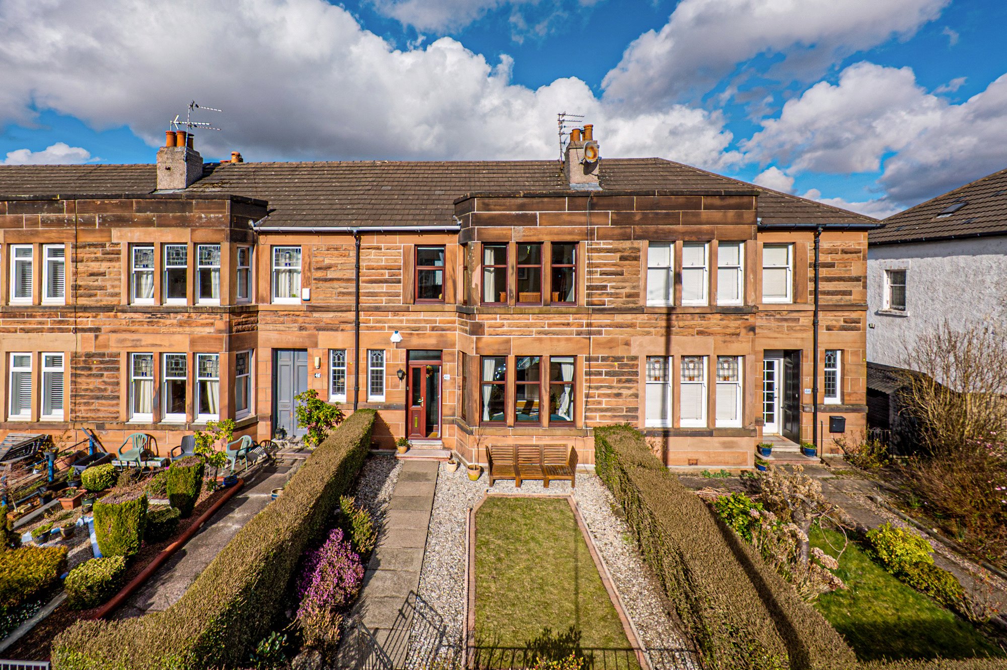 This gorgeous red sandstone fronted villa is approached via pathway flanked by lawned front garden with border, leading to the front door.