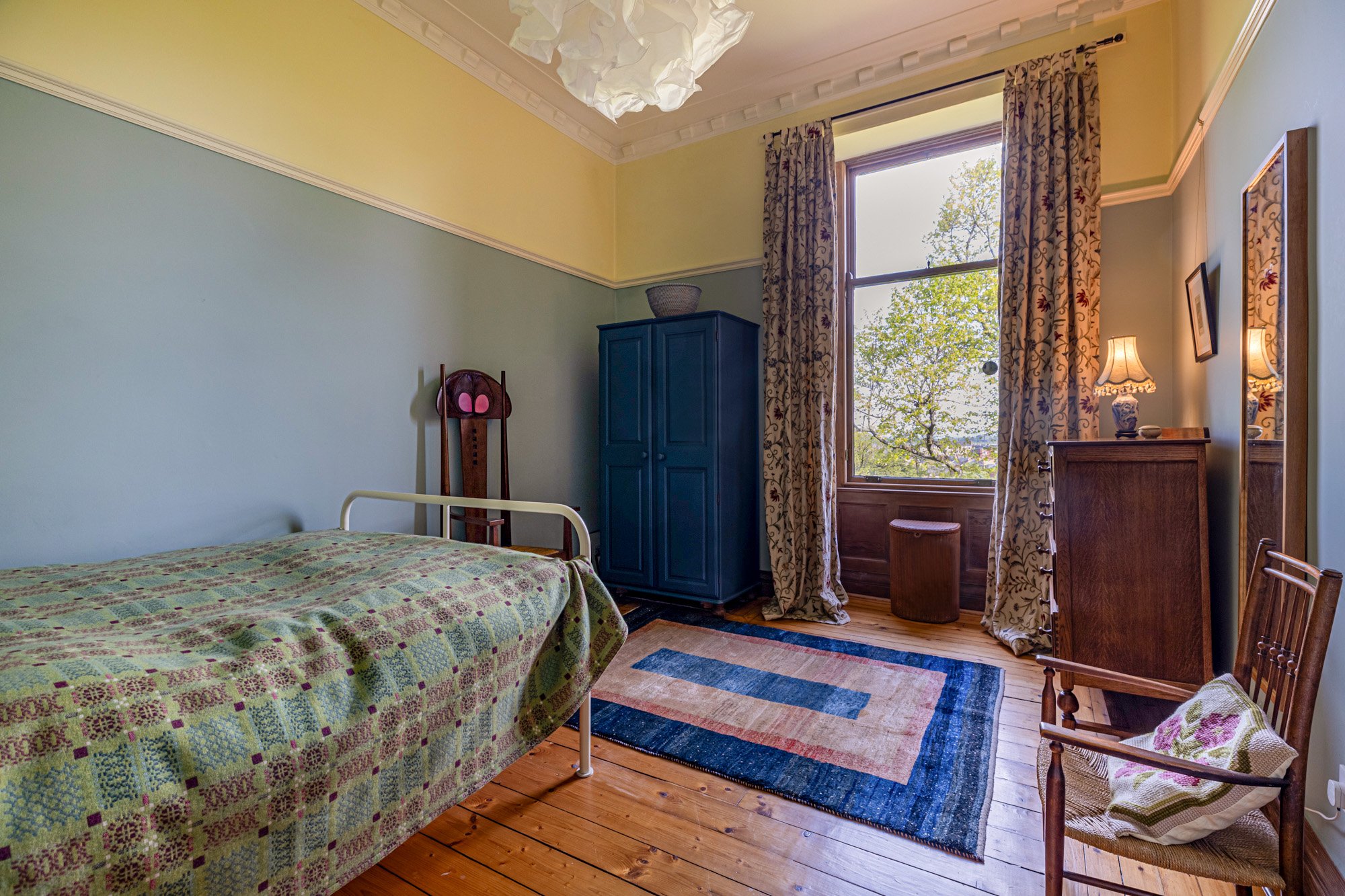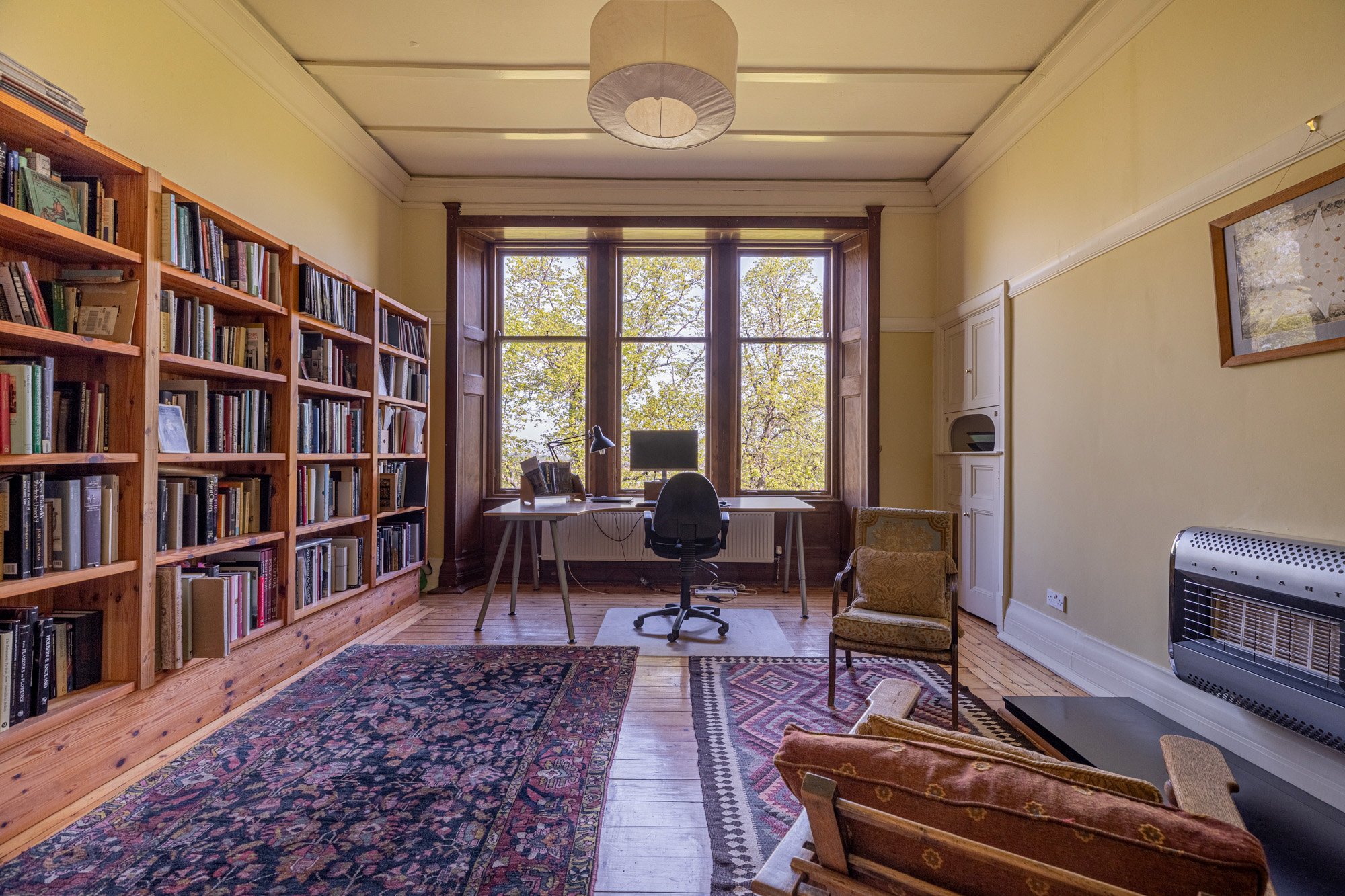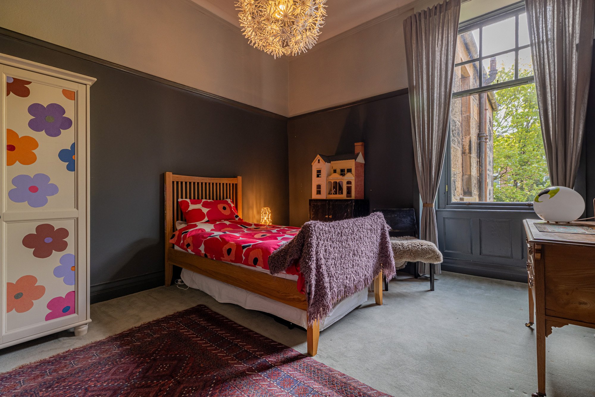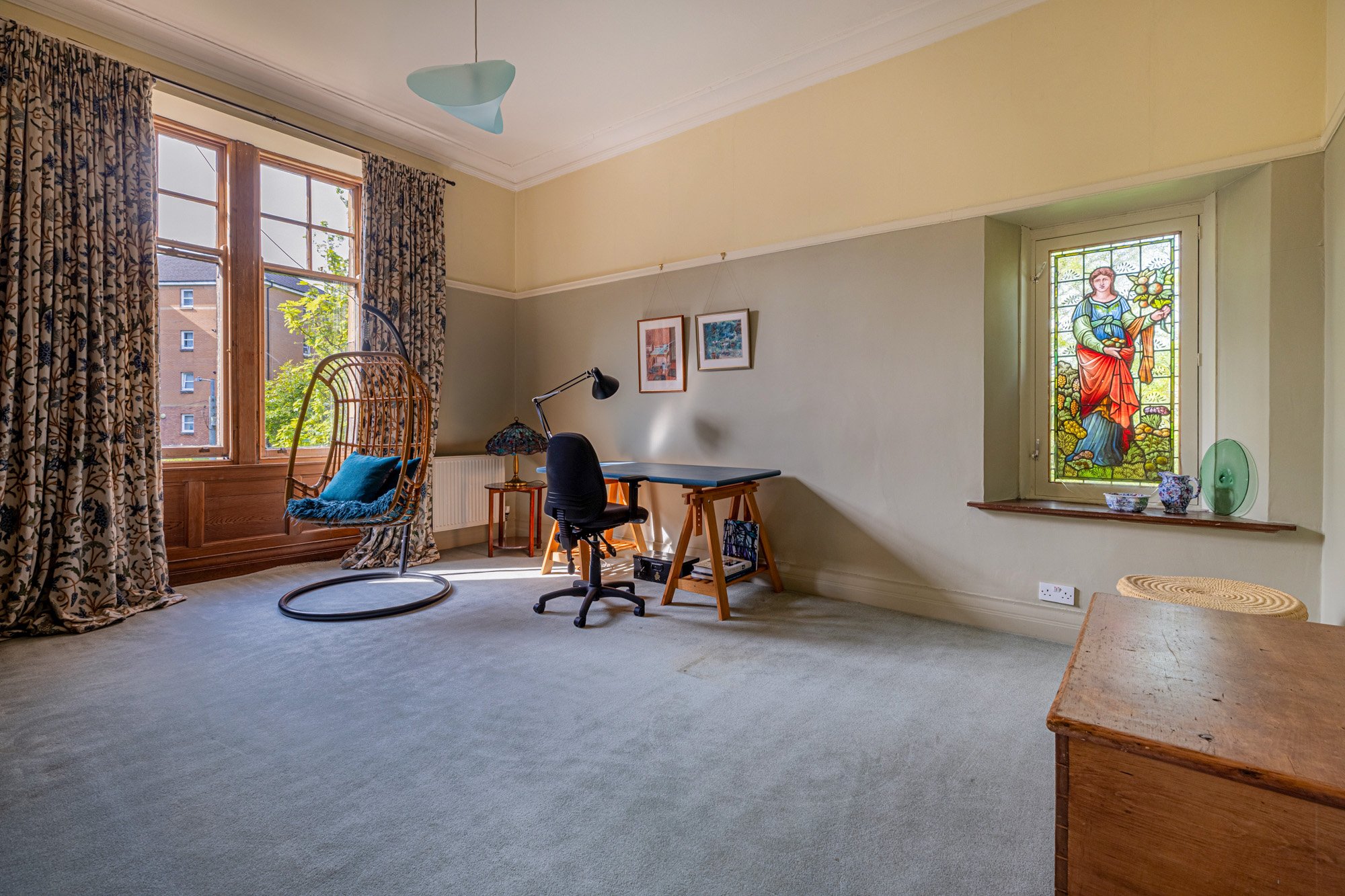 The property benefits from timber framed single glazing with draught-proofing, gas central heating, and a range of period features including original and new floorboards, stained glass, cornicing and restored woodwork. The tenement is accessed via a secure door entry system into a well-kept communal close and stairwell. Externally there is a communal rear garden. Residents also enjoy access to a private woodland walk to the front known as the Pleasure Gardens.