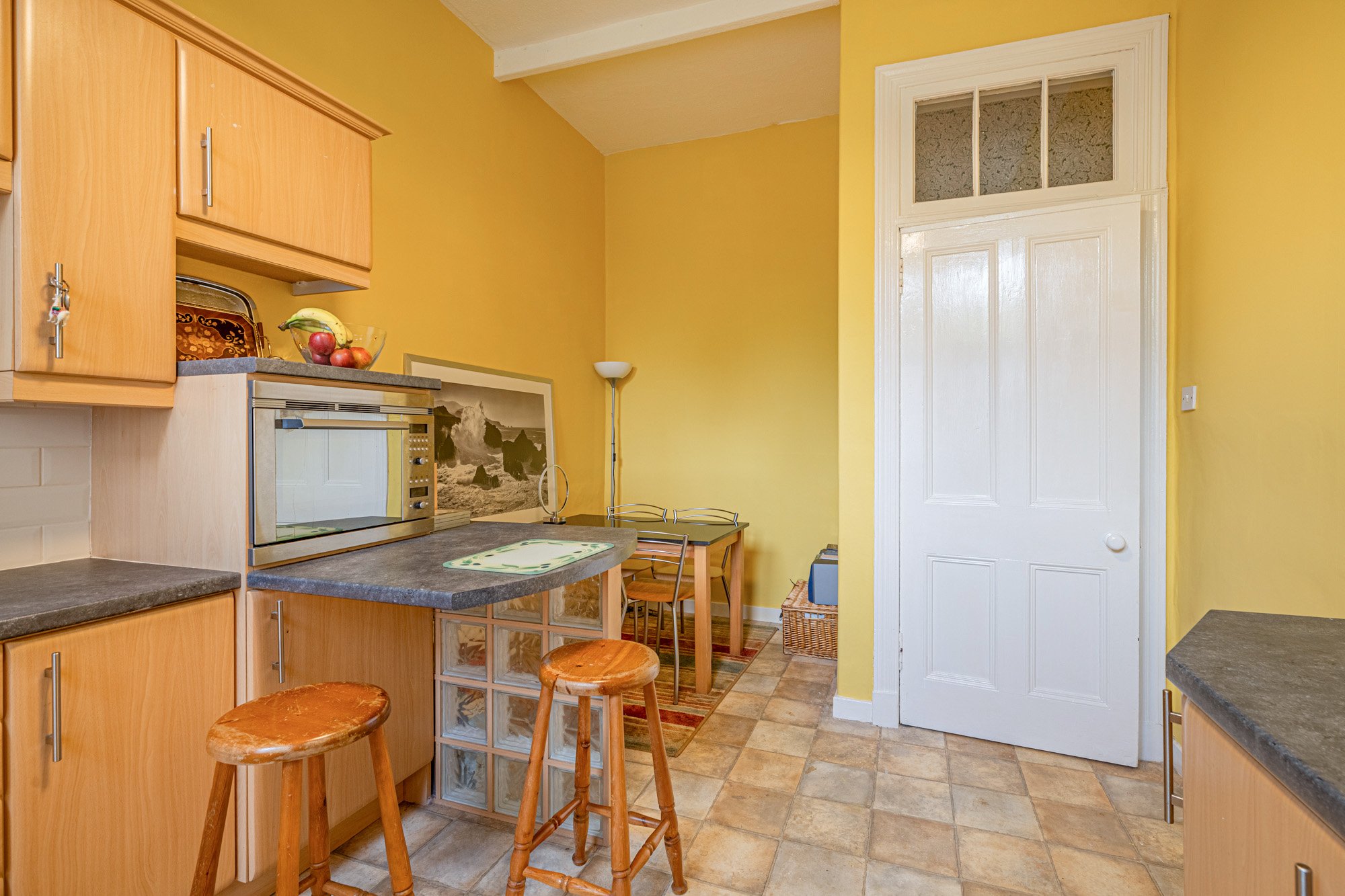 The accommodation of the flat itself comprises welcoming reception hallway with two cupboards off, bay windowed lounge with feature fireplace and cornicing, dining sized kitchen with a range of base and wall mounted units, breakfast bar and dining recess, double sized bedroom and tiled bathroom with white three piece suite and over bath shower.