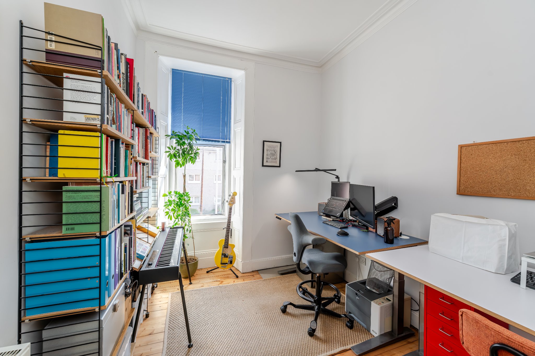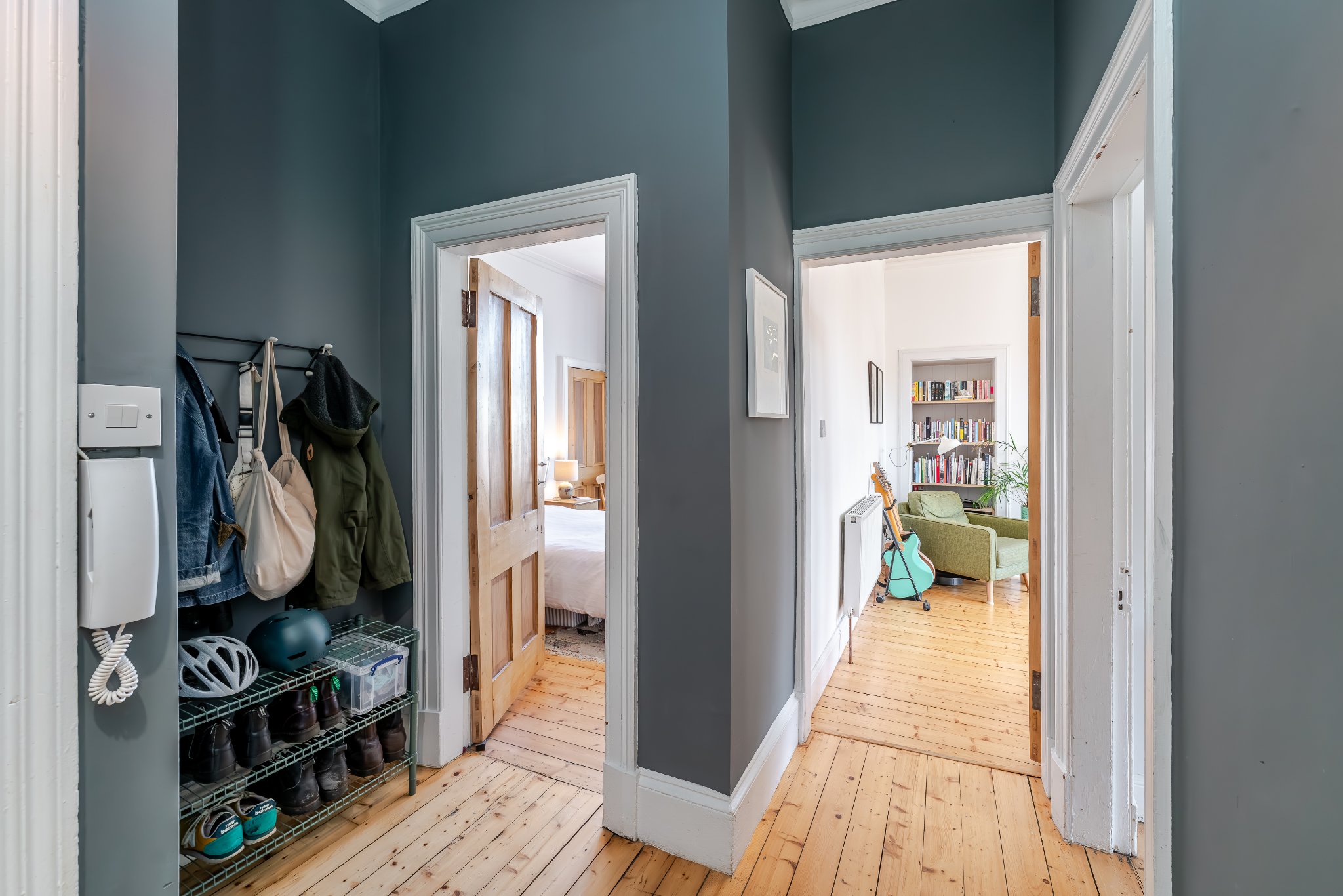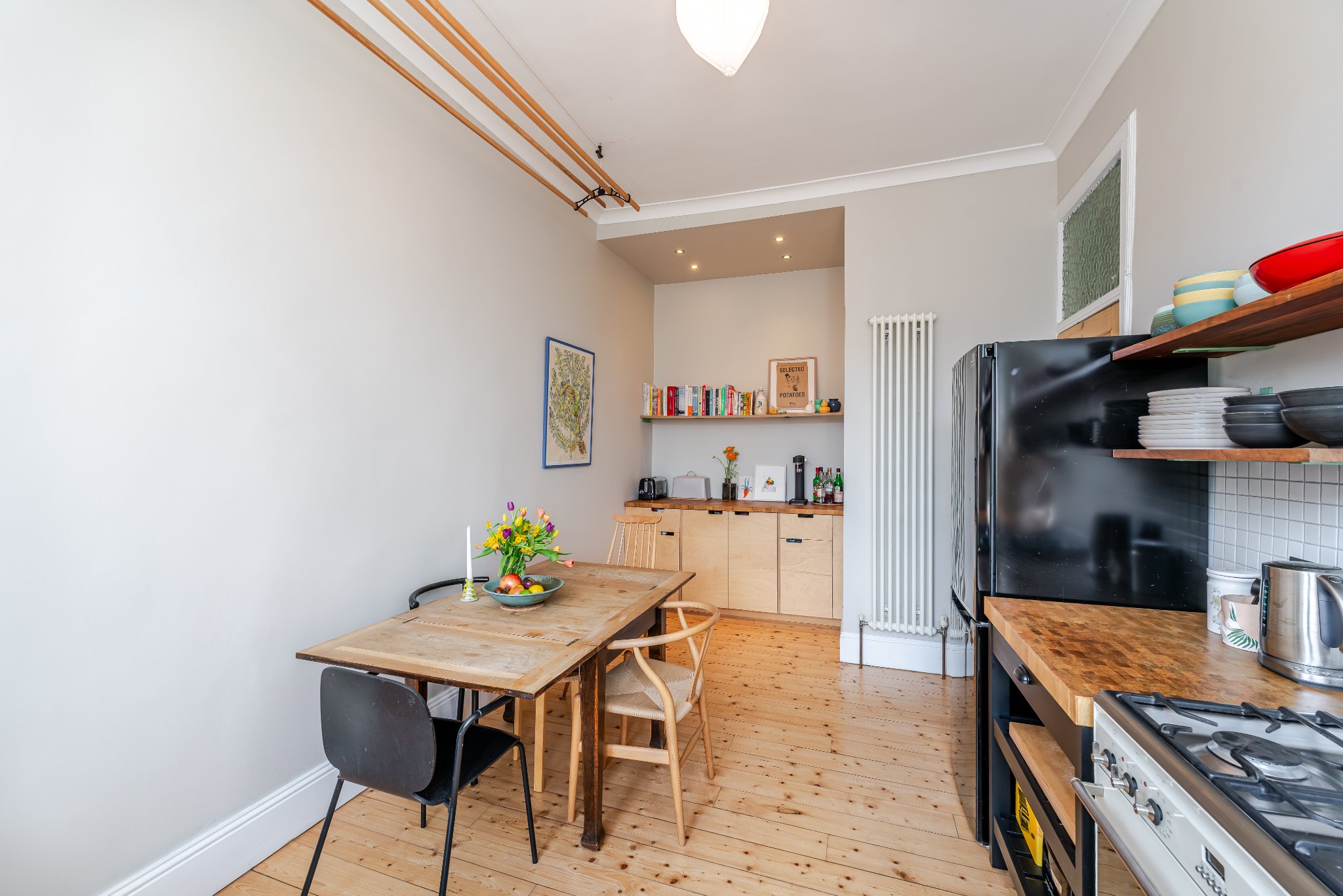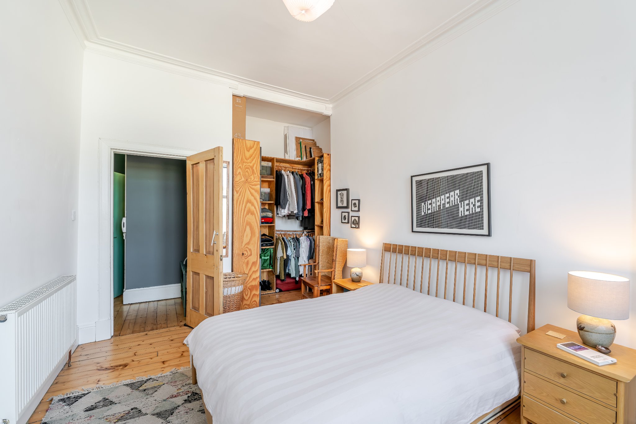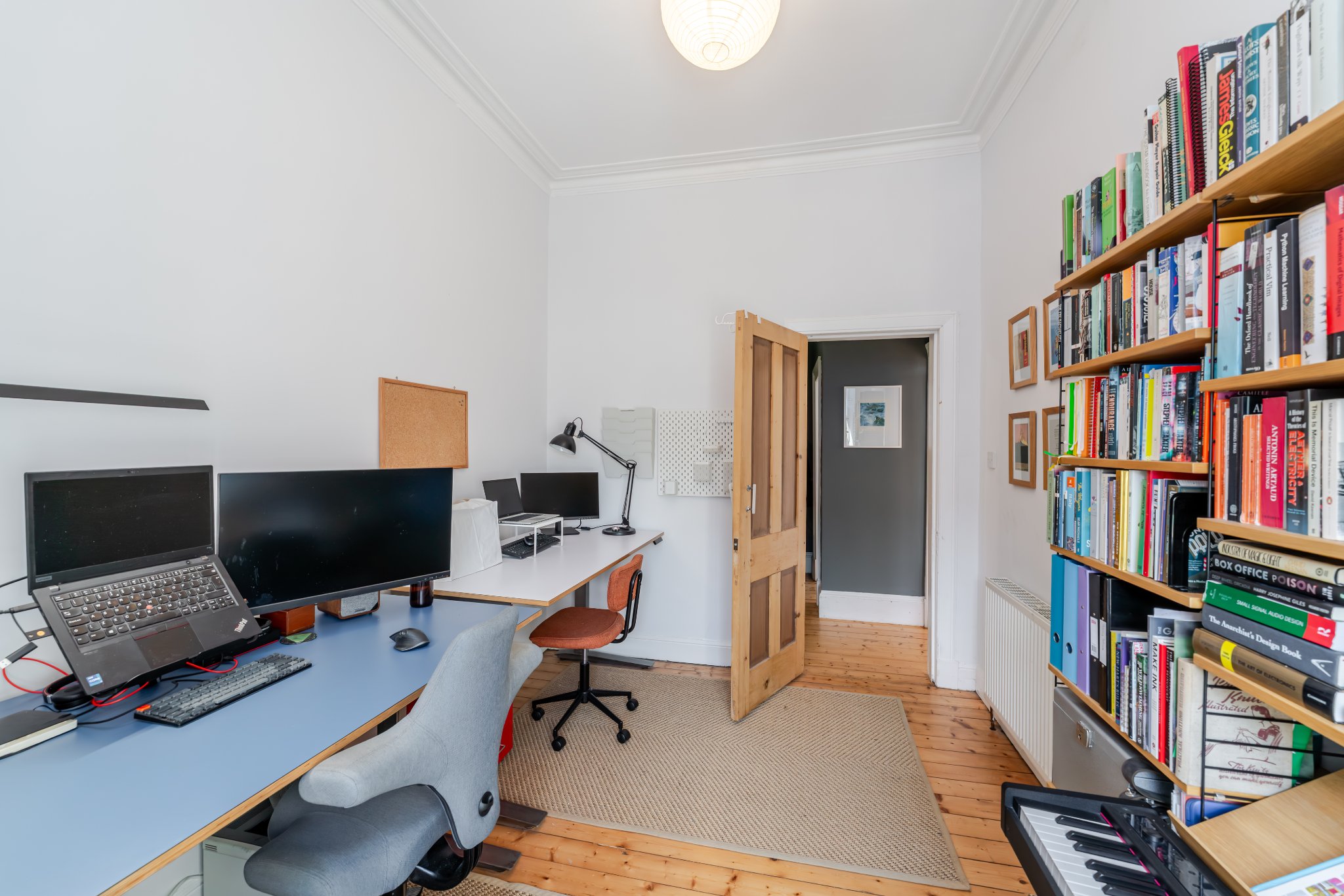 The accommodation of the flat itself comprises welcoming reception hallway with large cupboard off, bay windowed lounge with fabulous dual aspect, feature fireplace, cornice plaster and refurbished floorboards, spacious dining sized kitchen with a range of base mounted units, tiled splashback, shelving and ample space for dining table and chairs, double sized bedroom one with cornice plaster and refurbished floorboards, second double sized bedroom with the same that is currently utilised as a home office space and a tiled bathroom with three piece suite and heated towel rail.