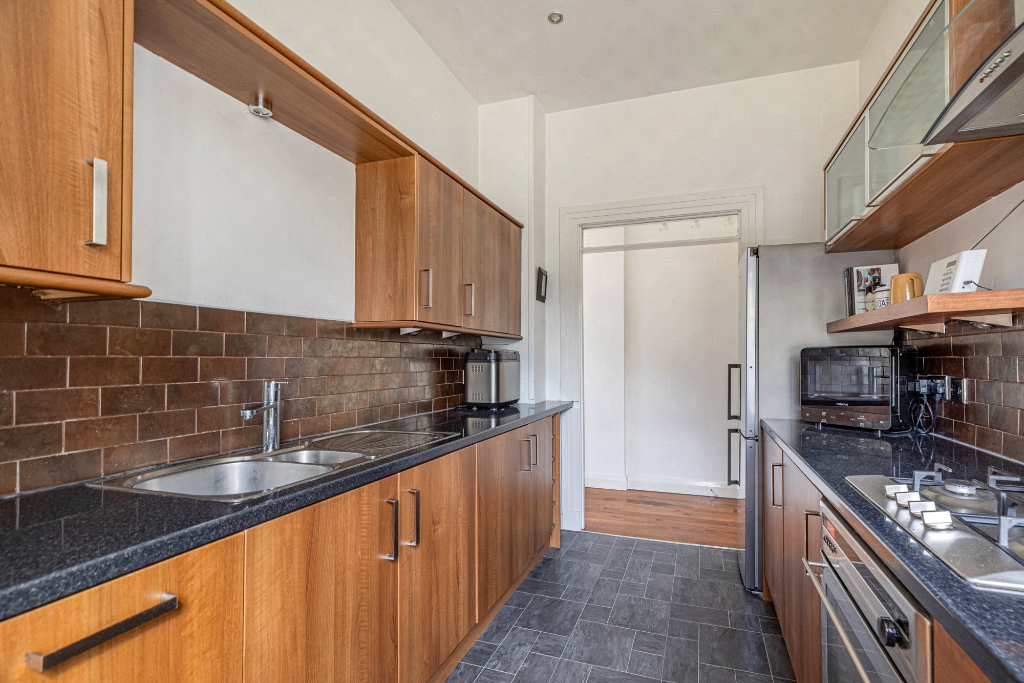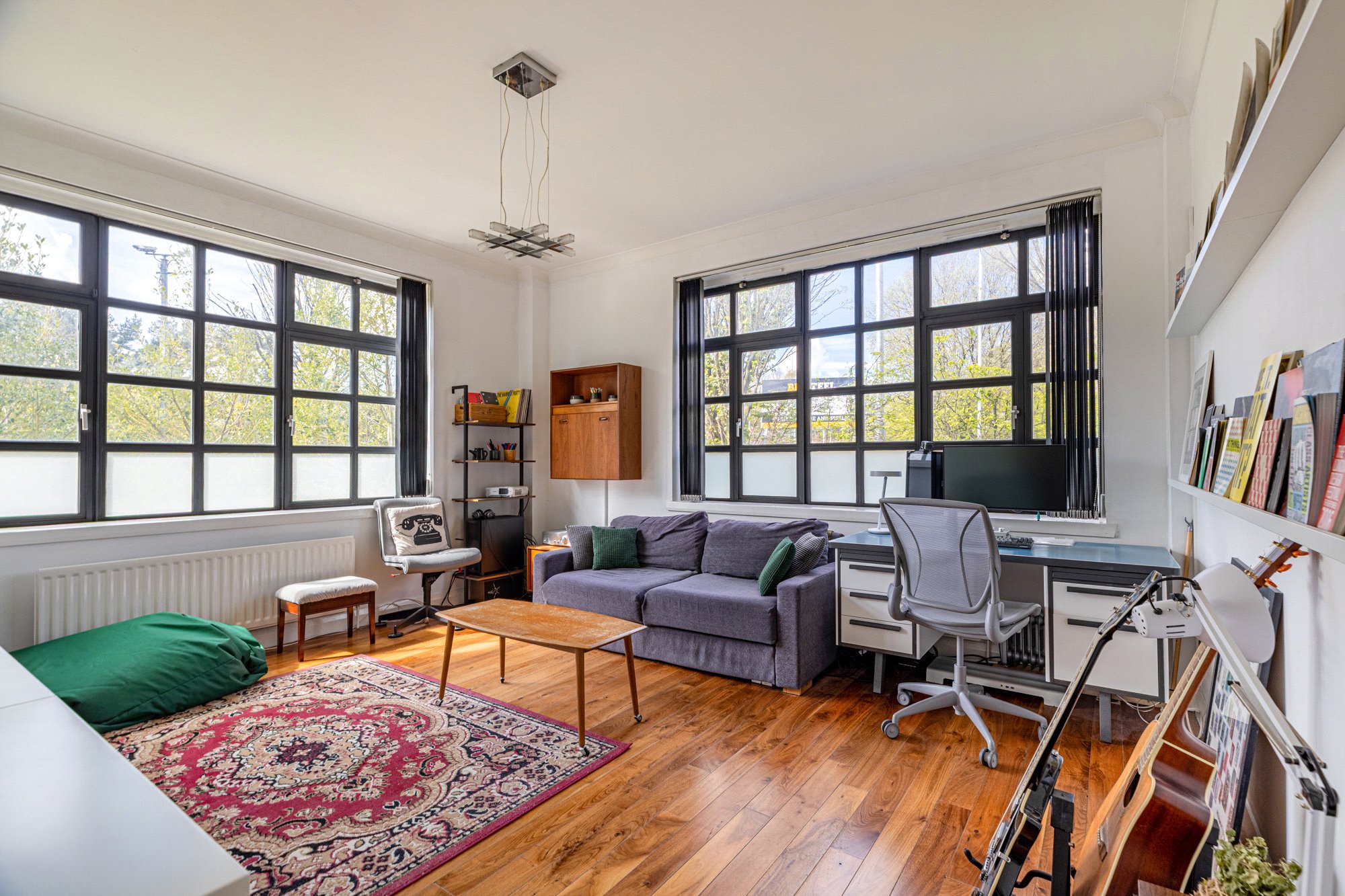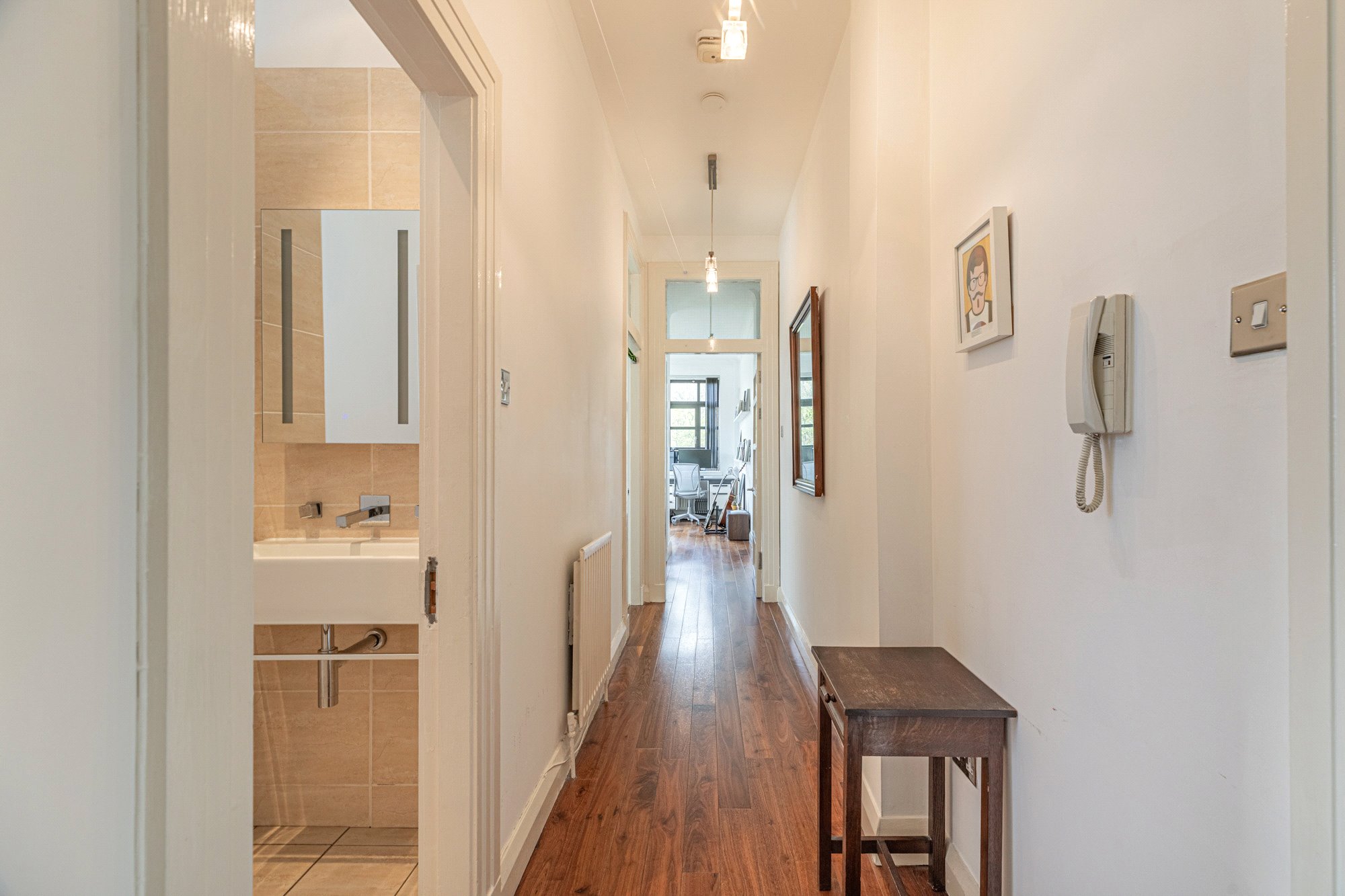 The accommodation of the flat itself comprises long reception hallway with large cupboard off, fabulous lounge with incredibly dual aspects allowing light to stream in, galley style kitchen with a range of base and wall mounted units, tiled splashback and shelving, double sized bedroom one with integrated wardrobes, second double sized bedroom that is currently utilised as a work space and a delightful tiled bathroom with white three piece suite, heated towel rail and over bath shower.