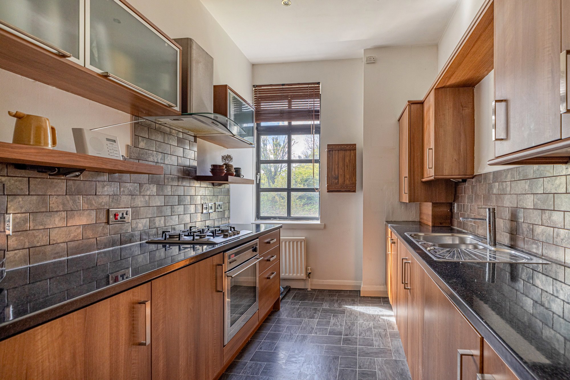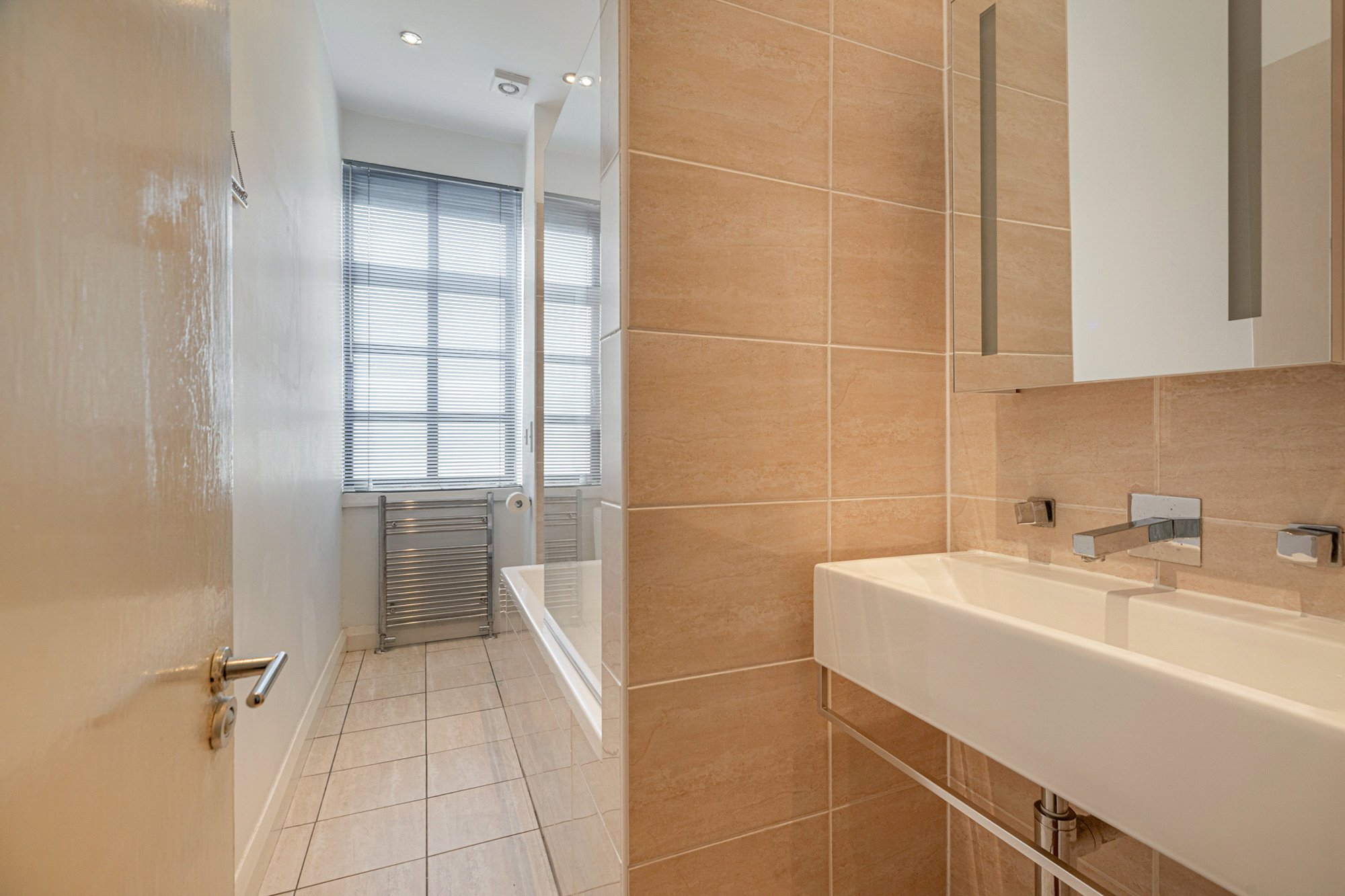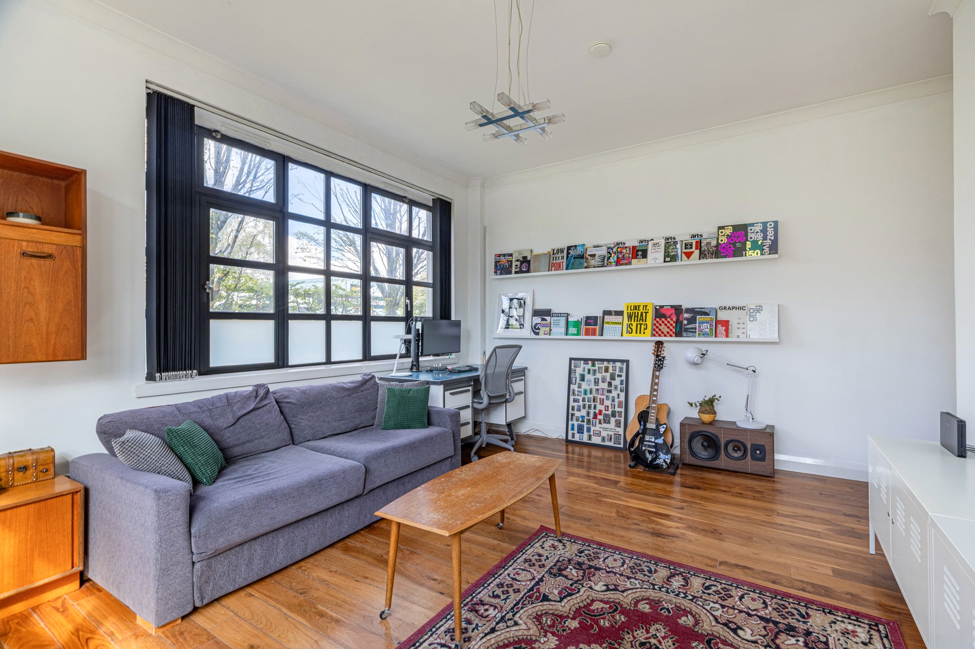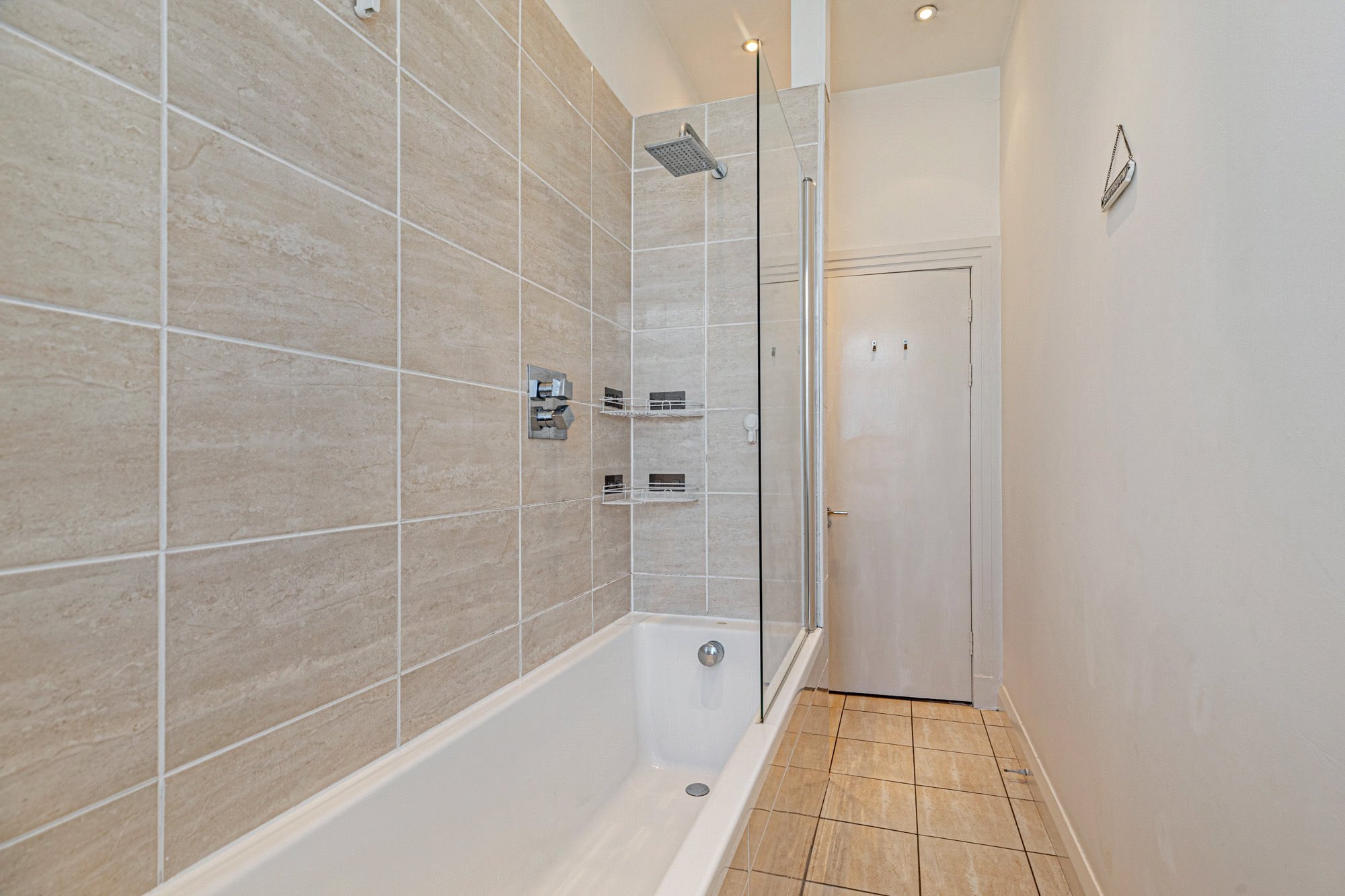 The accommodation of the flat itself comprises long reception hallway with large cupboard off, fabulous lounge with incredibly dual aspects allowing light to stream in, galley style kitchen with a range of base and wall mounted units, tiled splashback and shelving, double sized bedroom one with integrated wardrobes, second double sized bedroom that is currently utilised as a work space and a delightful tiled bathroom with white three piece suite, heated towel rail and over bath shower.