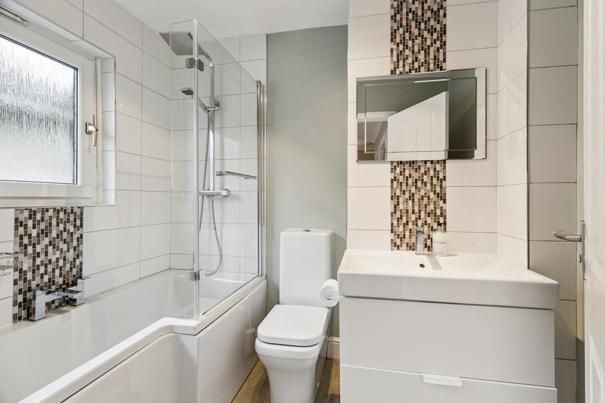 Upstairs there is bedroom one with integrated wardrobes with sliding doors and tiled en-suite shower room off with two piece suite, vanity unit and heated towel rail, second double sized bedroom with integrated wardrobes, third bedroom that could easily be utilised as a home office or study and tiled bathroom with white three piece suite and vanity unit.
