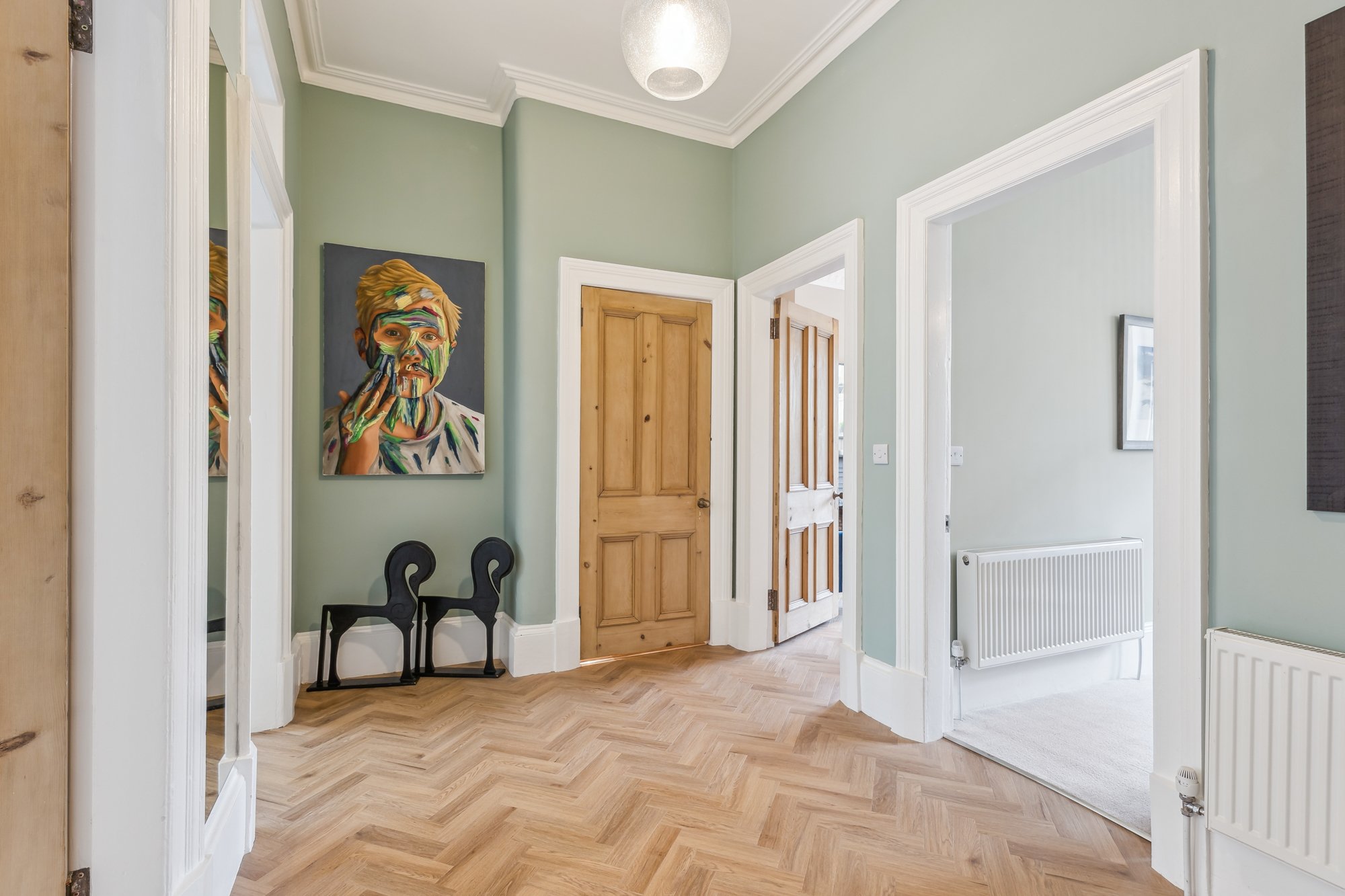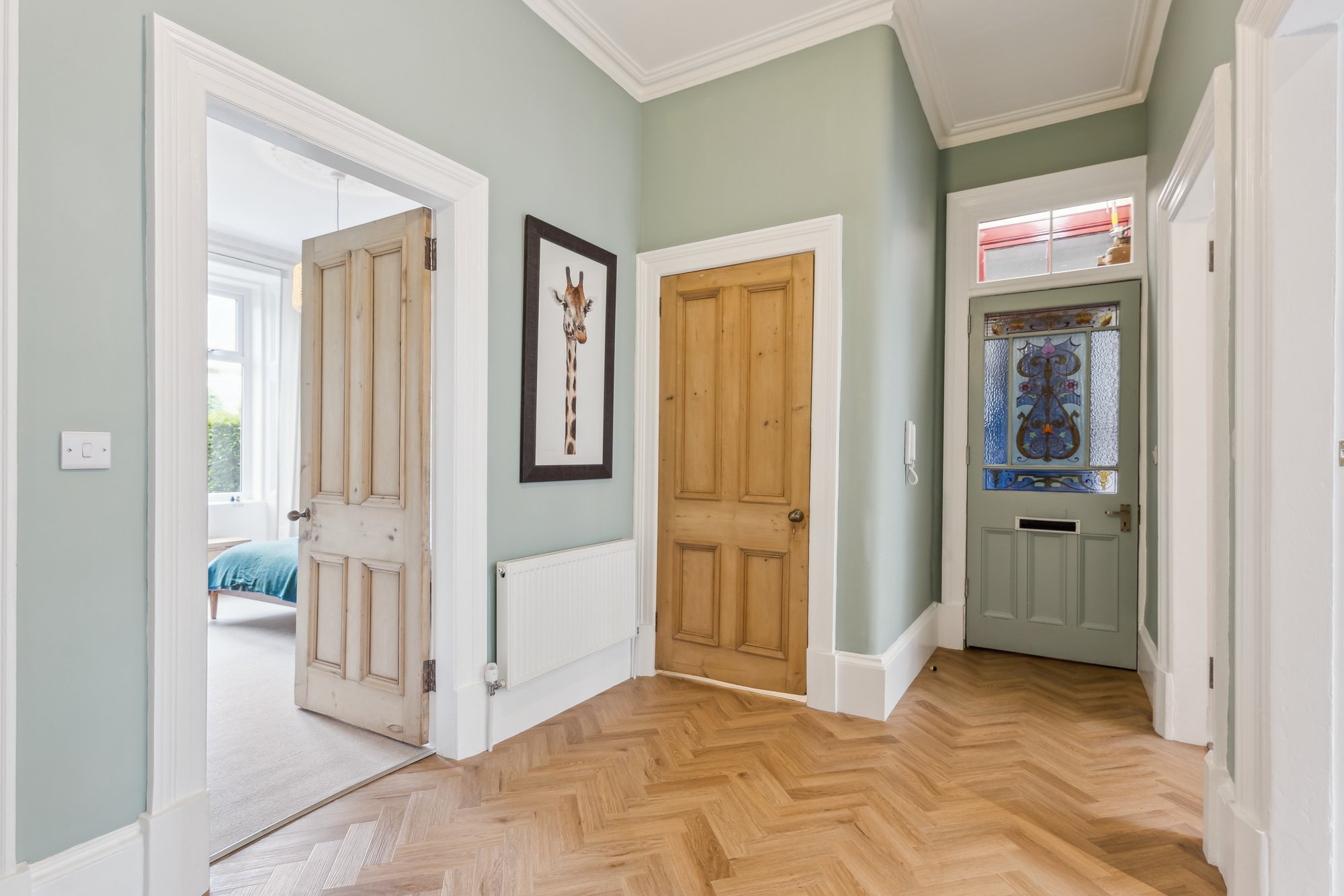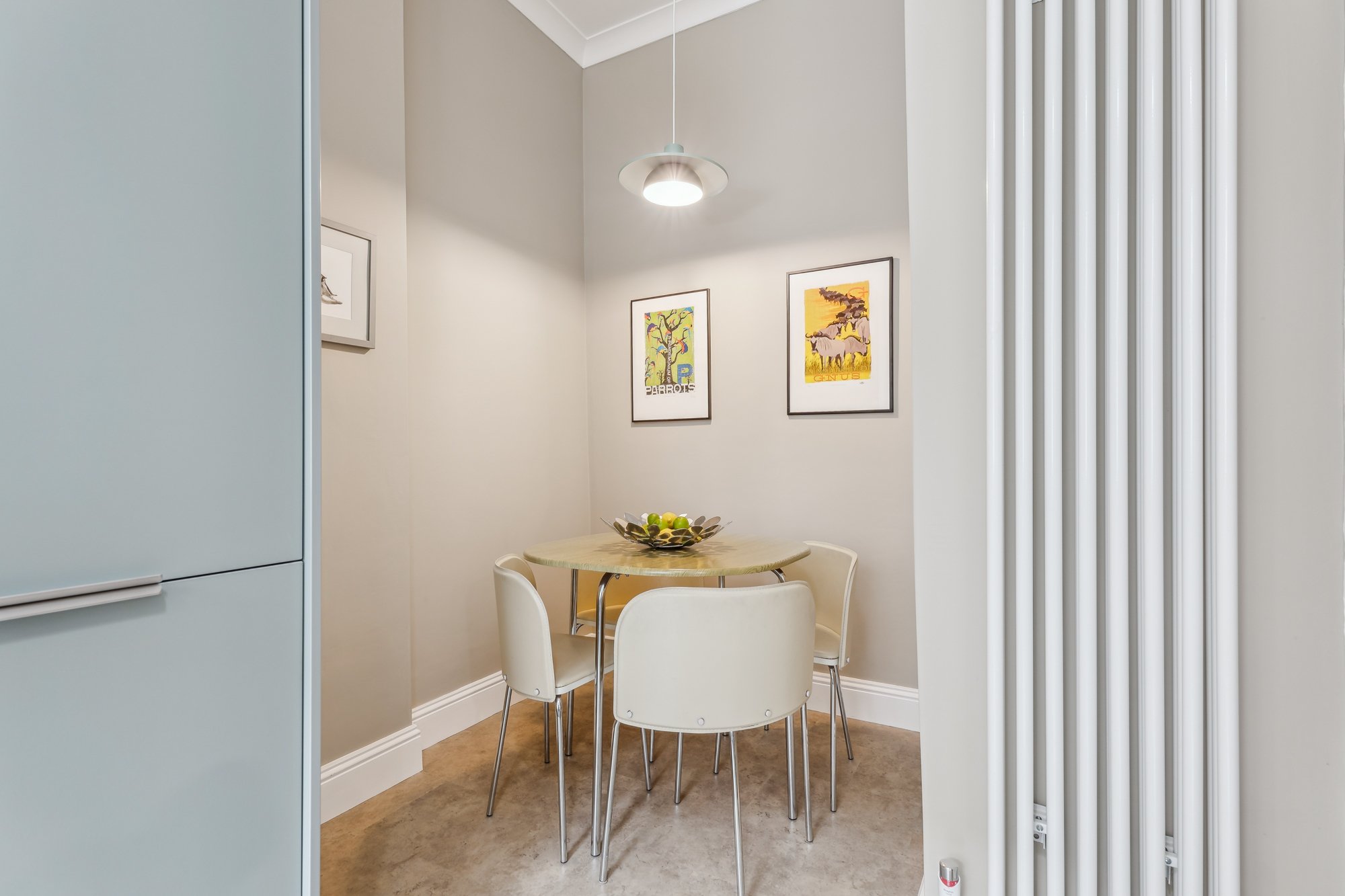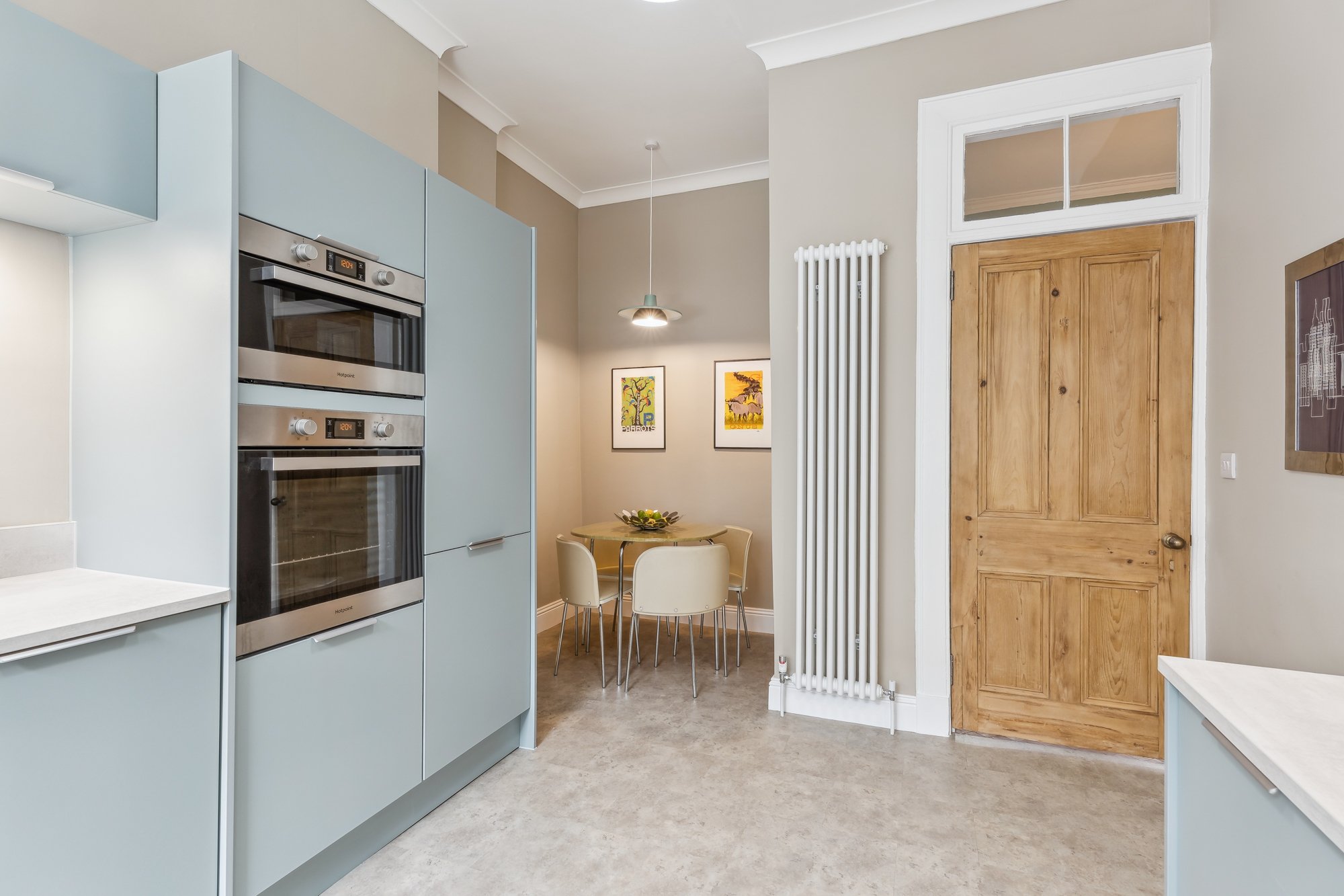 The accommodation of the flat itself comprises welcoming reception hallway with large cupboard off, delightful bay windowed lounge with cornicing and feature fireplace, gorgeous dining sized kitchen with a range of integrated appliances, base and wall mounted units and a dining recess. There is spacious bedroom to the front of the flat with cornicing, a second well-proportioned double bedroom, and a stunning tiled bathroom with high-quality three-piece suite, vanity unit, and heated towel rail.