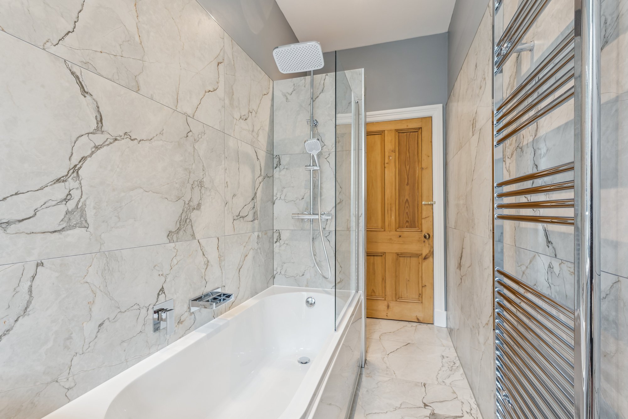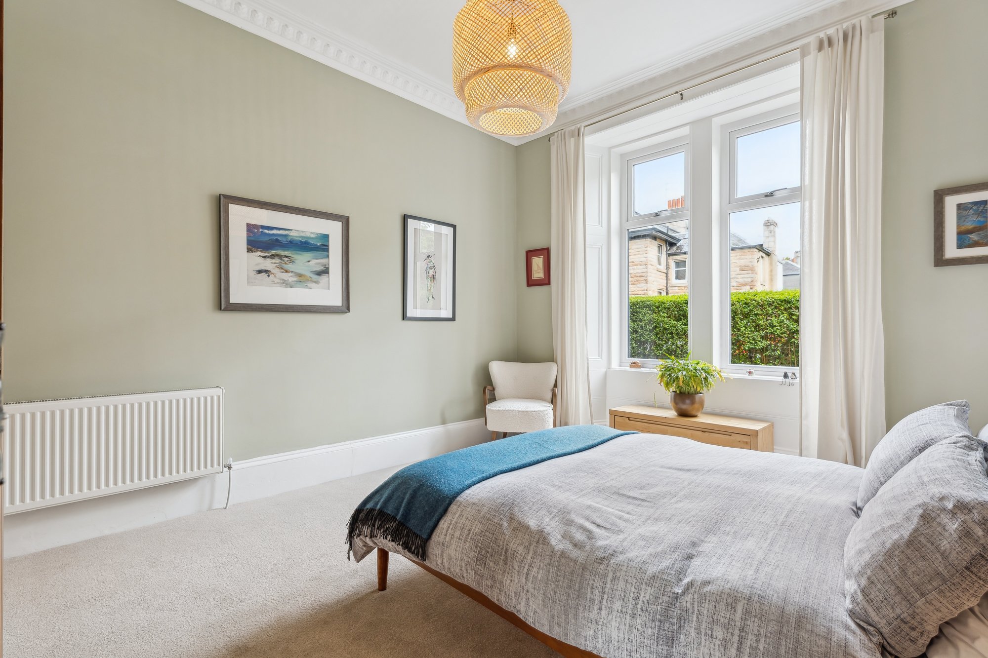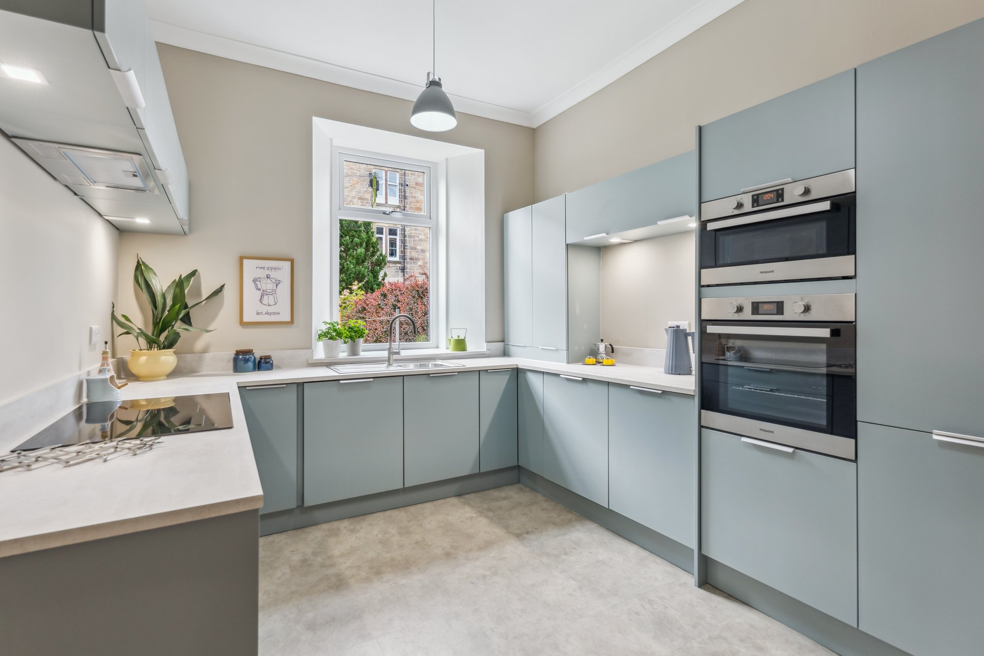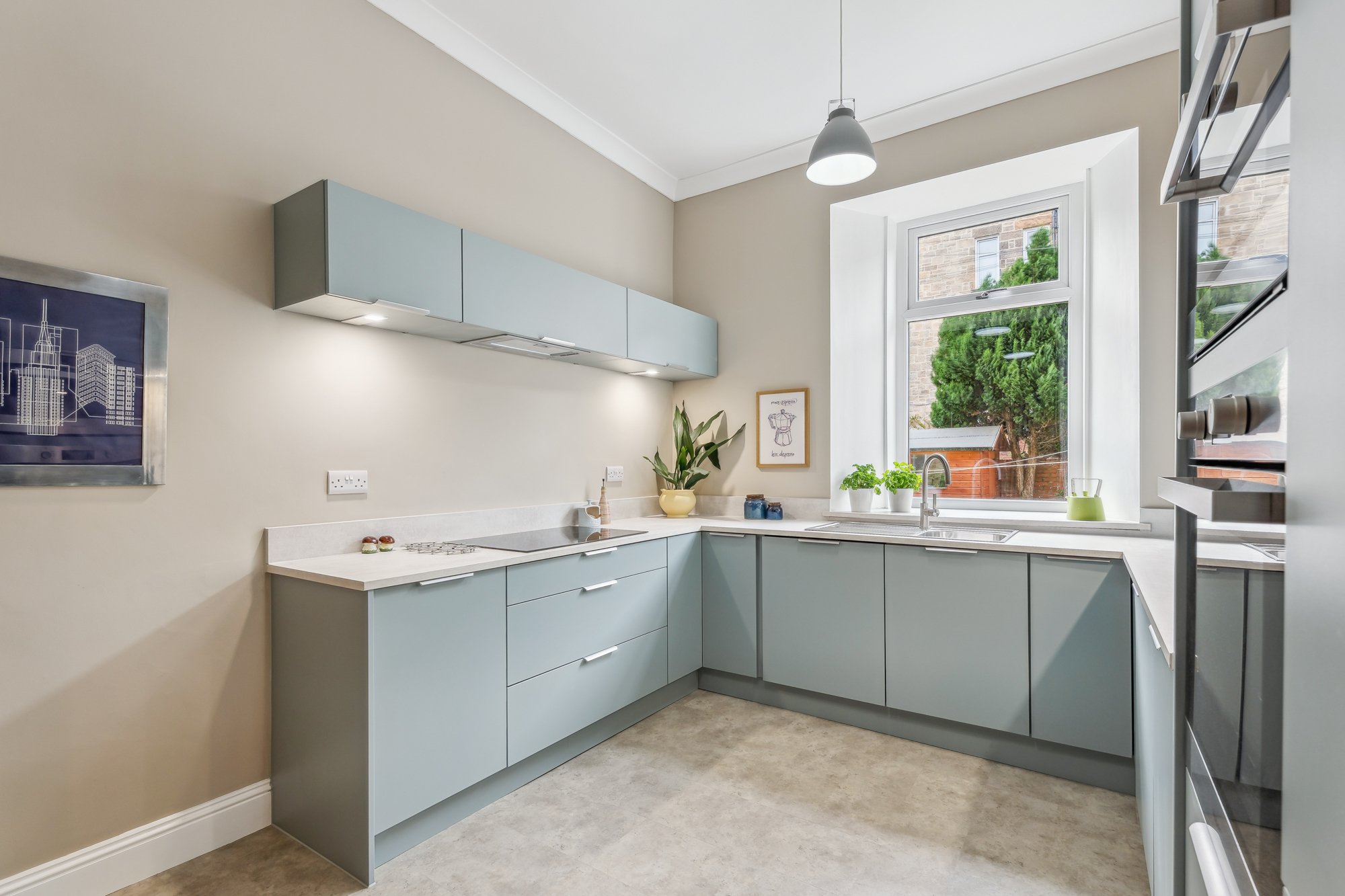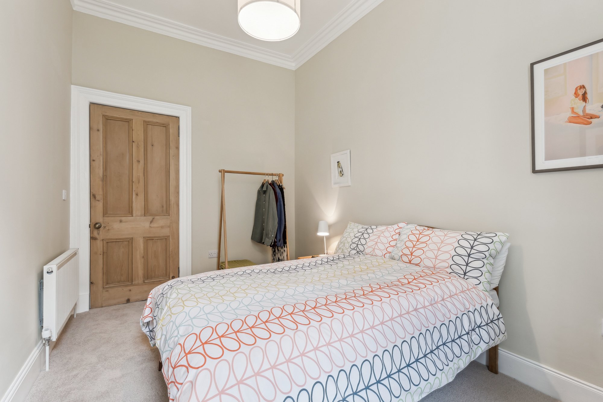 The accommodation of the flat itself comprises welcoming reception hallway with large cupboard off, delightful bay windowed lounge with cornicing and feature fireplace, gorgeous dining sized kitchen with a range of integrated appliances, base and wall mounted units and a dining recess. There is spacious bedroom to the front of the flat with cornicing, a second well-proportioned double bedroom, and a stunning tiled bathroom with high-quality three-piece suite, vanity unit, and heated towel rail.