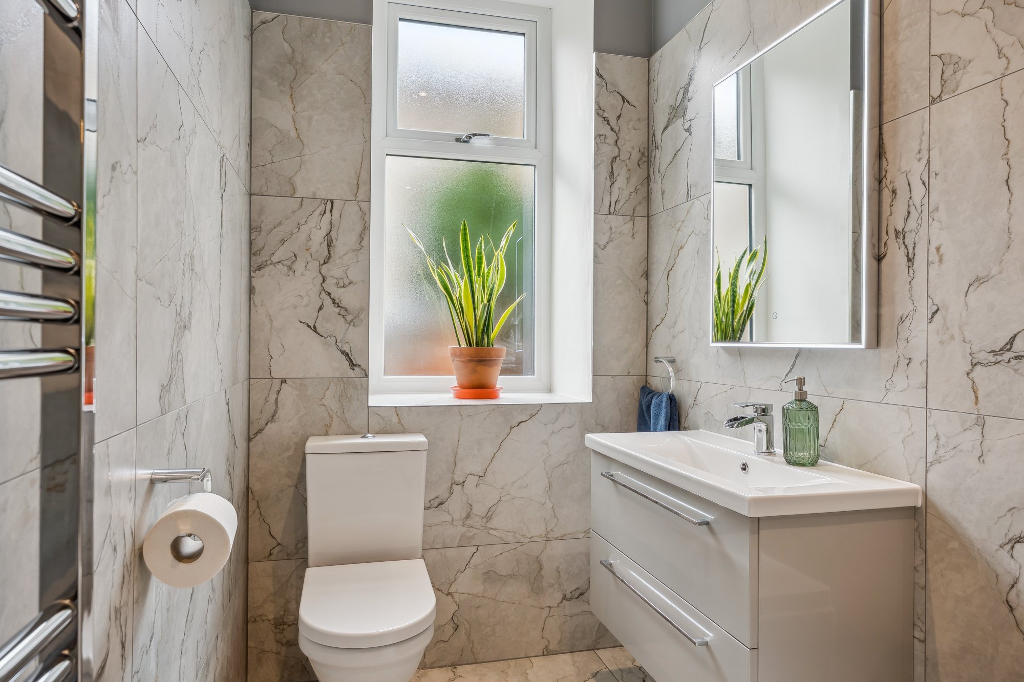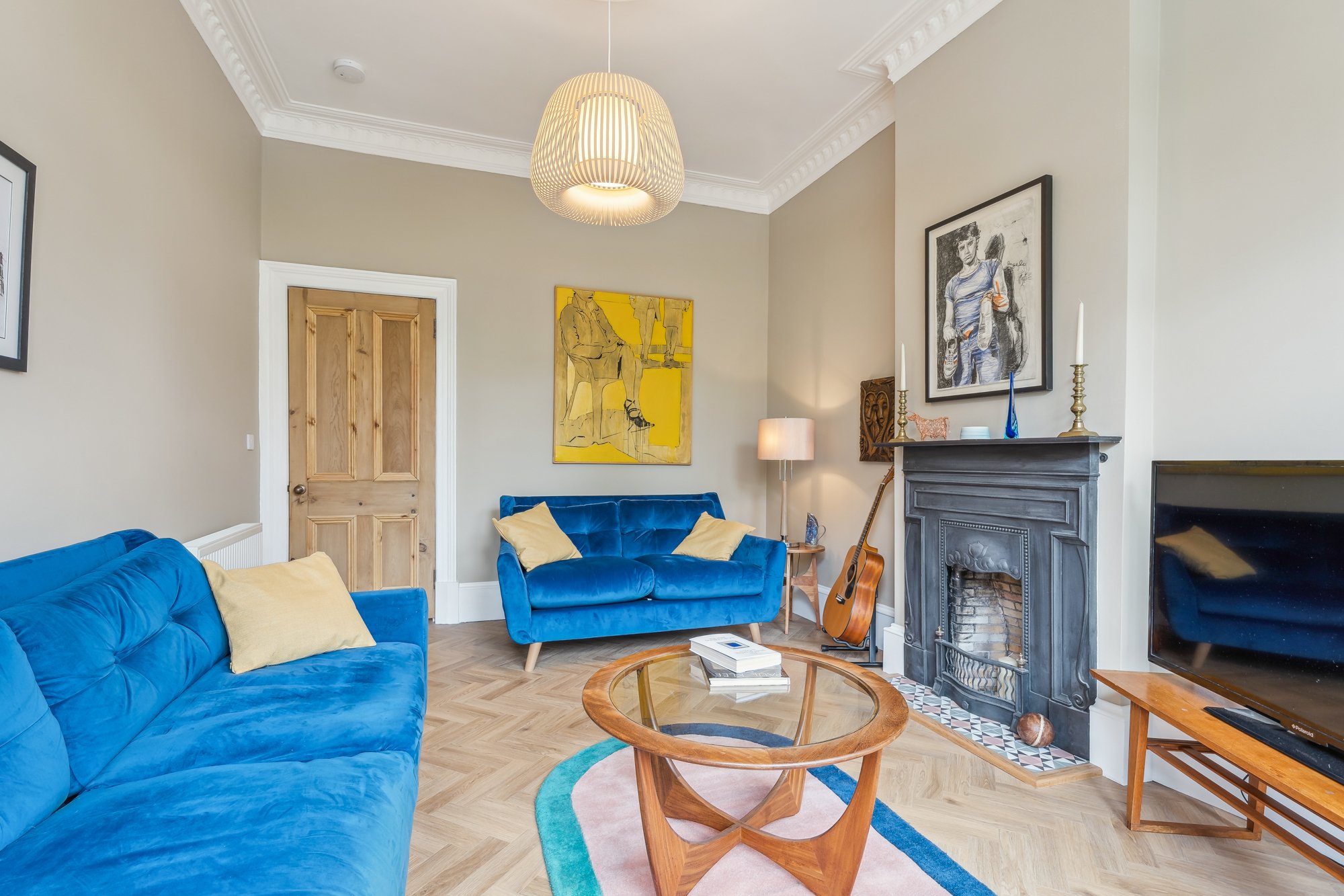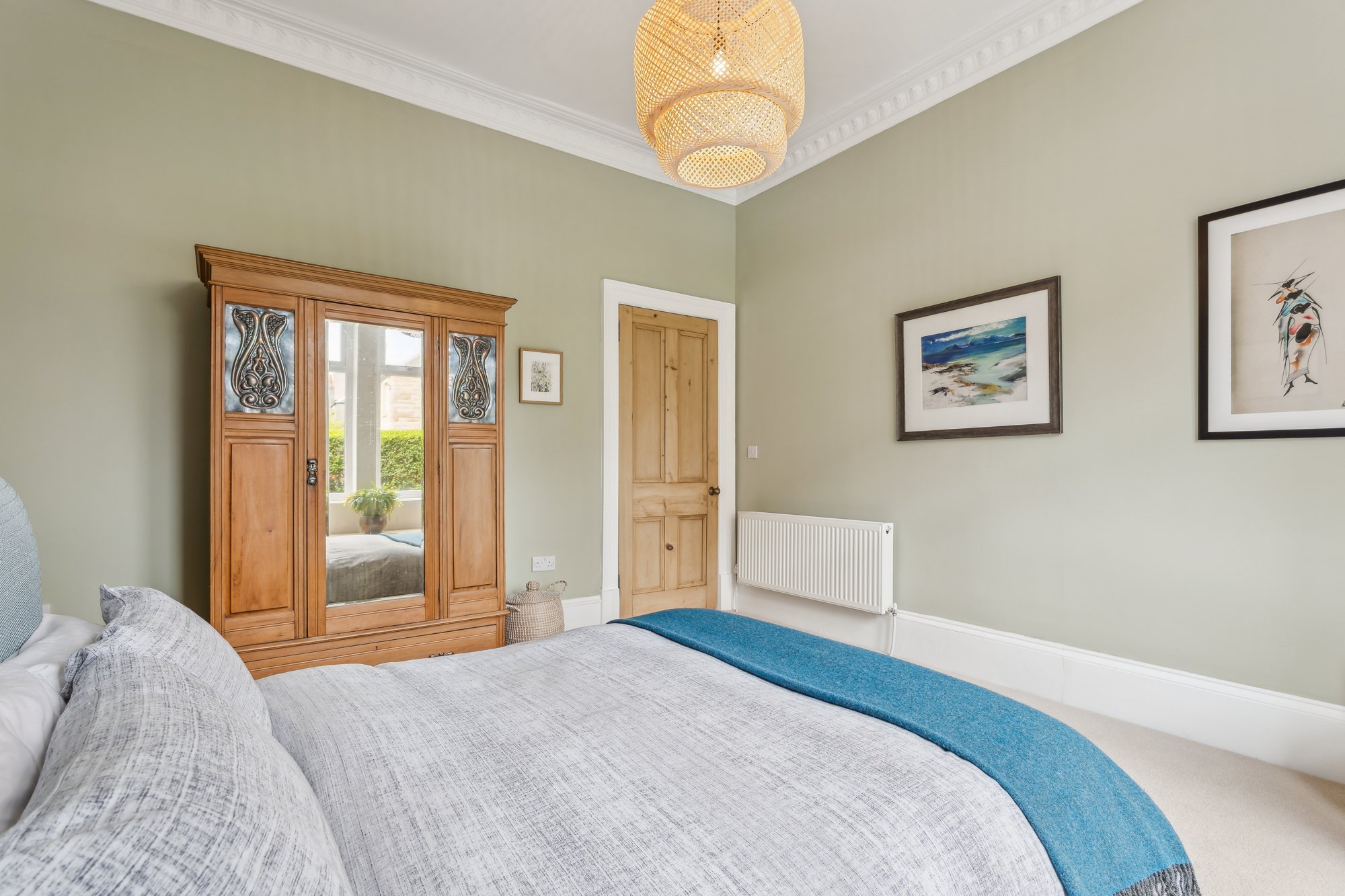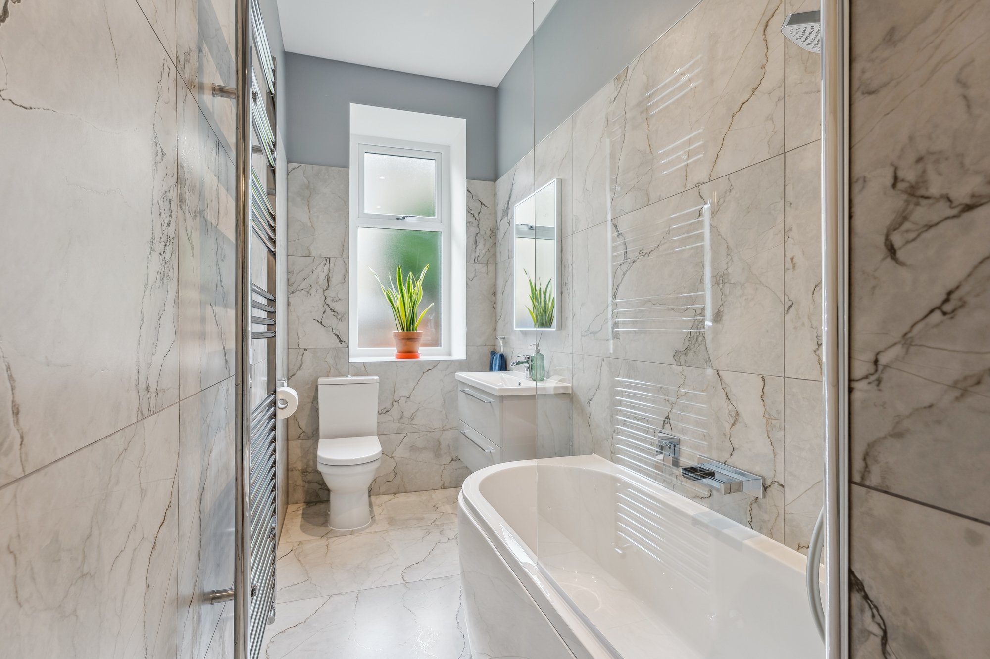 The accommodation of the flat itself comprises welcoming reception hallway with large cupboard off, delightful bay windowed lounge with cornicing and feature fireplace, gorgeous dining sized kitchen with a range of integrated appliances, base and wall mounted units and a dining recess. There is spacious bedroom to the front of the flat with cornicing, a second well-proportioned double bedroom, and a stunning tiled bathroom with high-quality three-piece suite, vanity unit, and heated towel rail.