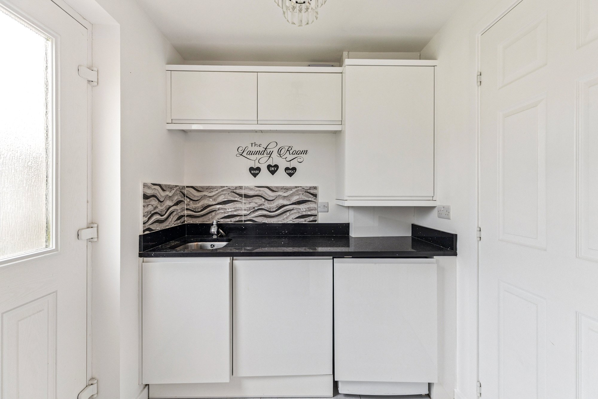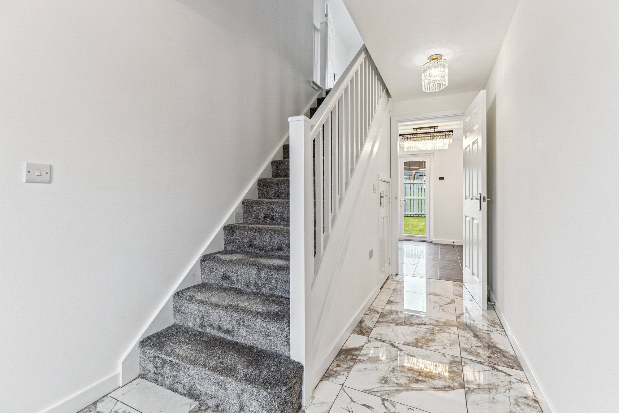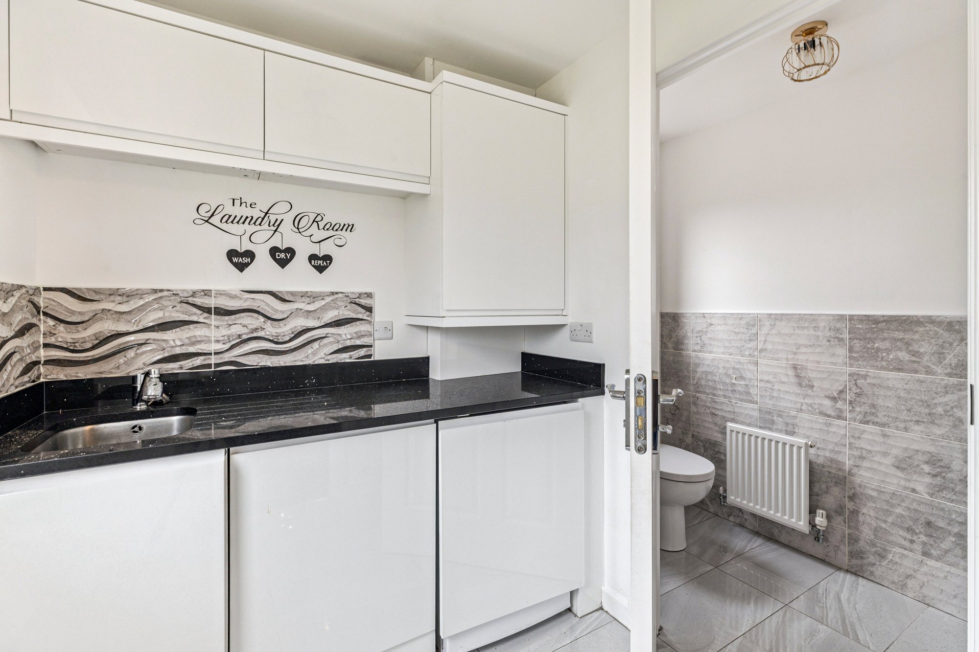 A welcoming reception hall leads into a bright and spacious front-facing lounge, enhanced by a stunning bespoke media wall. The open-plan dining kitchen is a true focal point of the home, featuring an extensive range of contemporary wall and base units, complementary work surfaces, and integrated appliances. French doors open out to the private rear garden, creating a perfect space for indoor-outdoor living and entertaining. A separate utility room offers further convenience with access to the garden, while a modern cloakroom/WC completes the ground floor layout.