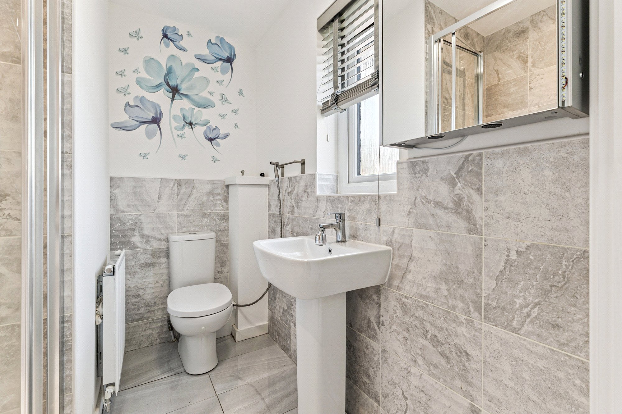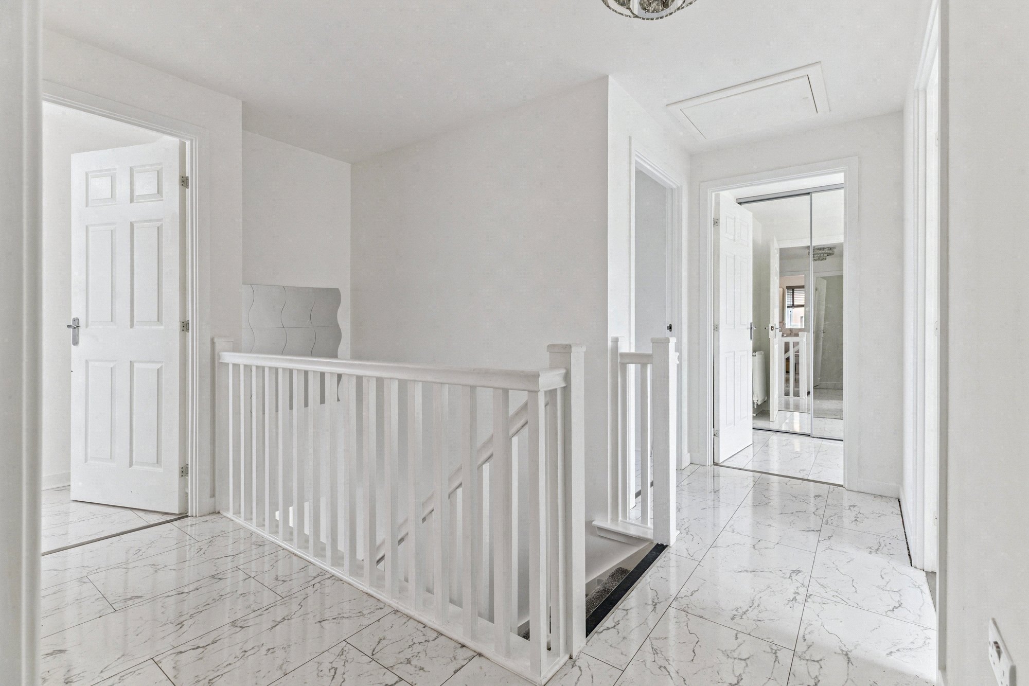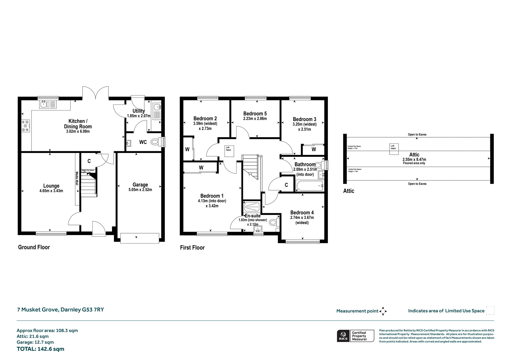 Upstairs, the home offers five bedrooms. The principal bedroom benefits from fitted wardrobes and an en-suite shower room. Bedrooms two and three also feature built-in storage, while bedrooms four and five are immaculately presented with ample space for freestanding or fitted furniture. A stylish family bathroom serves the remaining bedrooms.