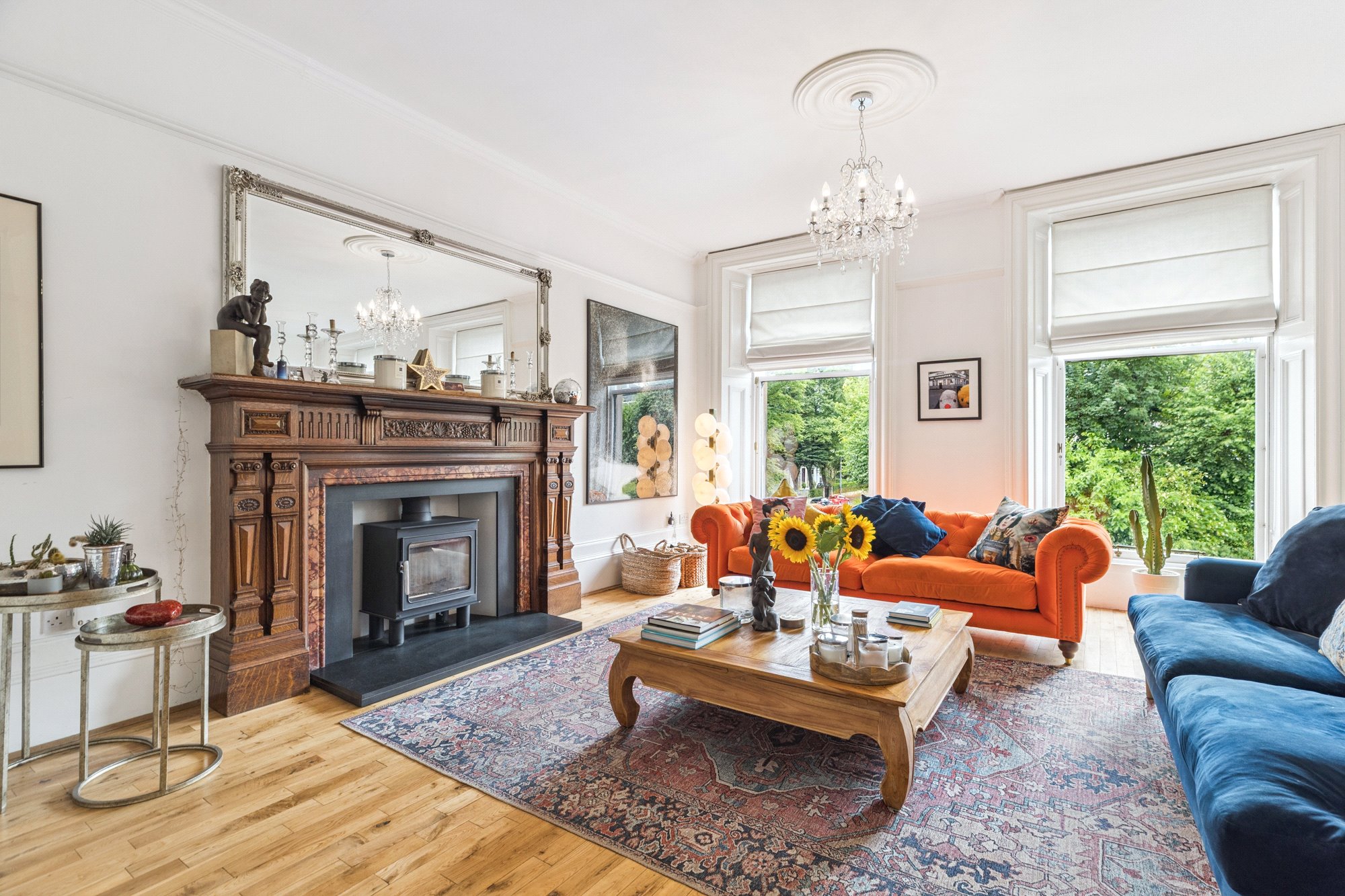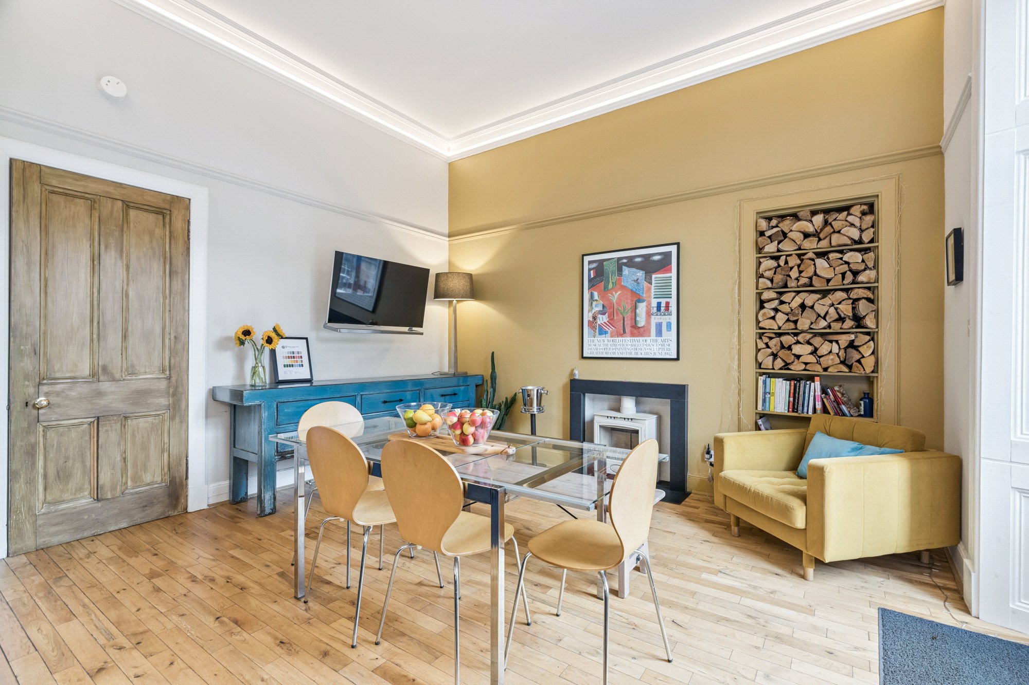 Located on the first floor of the apartment is the front facing formal drawing room, boasting a triple window formation and an absolutely stunning fireplace with woodburning fire. There is conveniently located WC which also accommodates a cleverly concealed utility area. Flowing on to the open plan dining kitchen and TV/dining room. The Kitchen is presented in modern, timeless décor with floor and wall mounted cabinets, completed with breakfast bar. The TV Lounge/Dining area is again tastefully presented with woodburning fireplace with Patio doors off, giving direct access to the shared garden area.