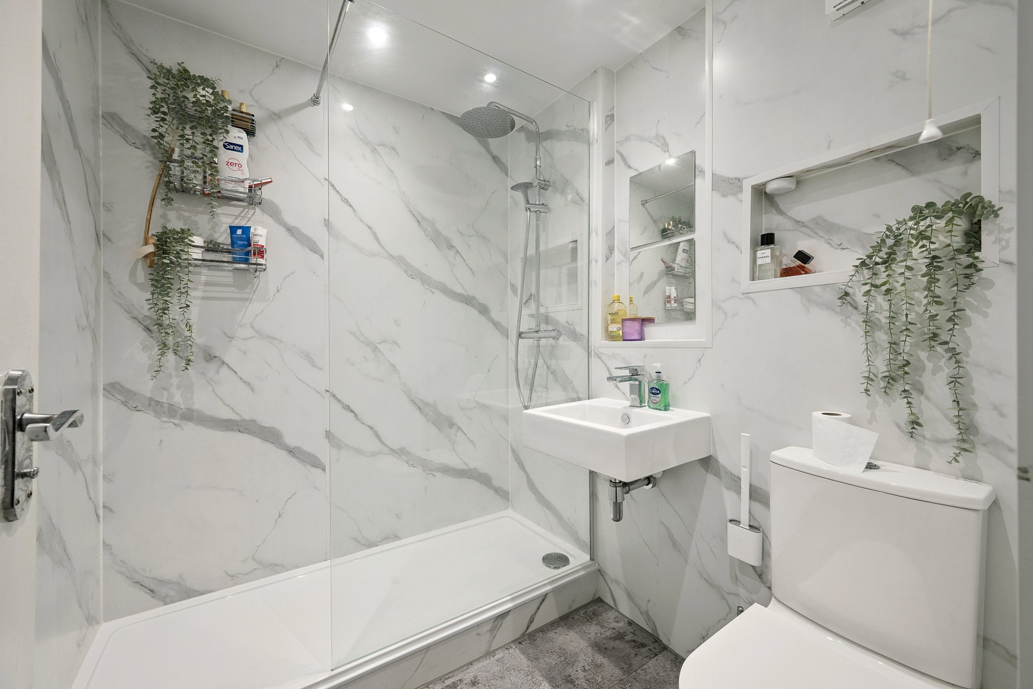 The double bedroom is well-proportioned and benefits from built in wardrobe space. The bathroom is a sleek contemporary shower room (with large walk in shower) and is presented with a light modern, white suite and completes the overall accommodation.
