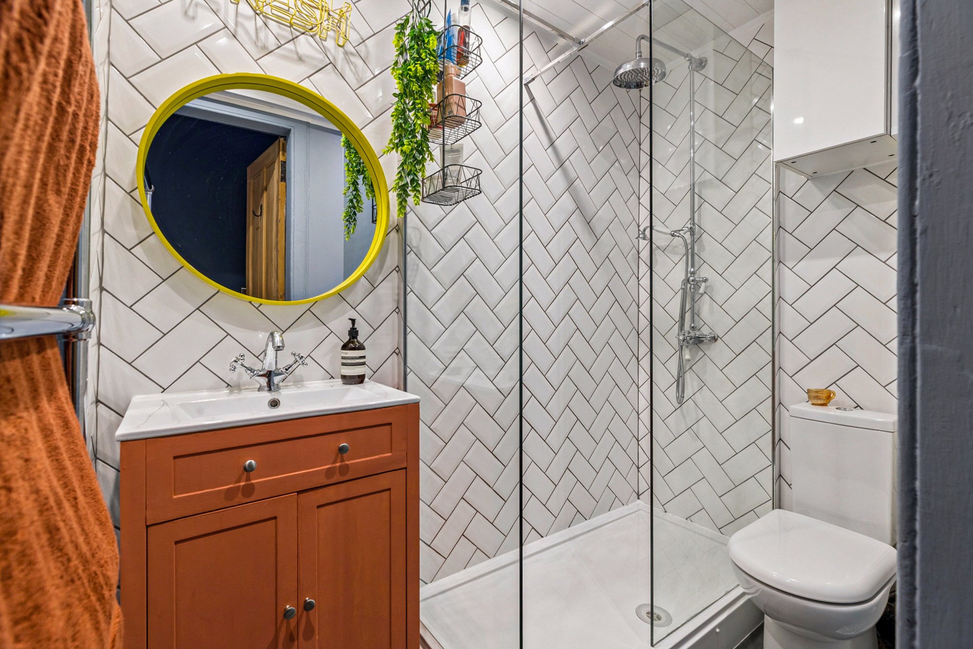 Both bedrooms are generous doubles, each featuring large windows that flood the rooms with natural light, creating a warm and inviting atmosphere. The shower room has been stylishly finished with a modern glass-enclosed shower, tiled walls, and quality fittings.