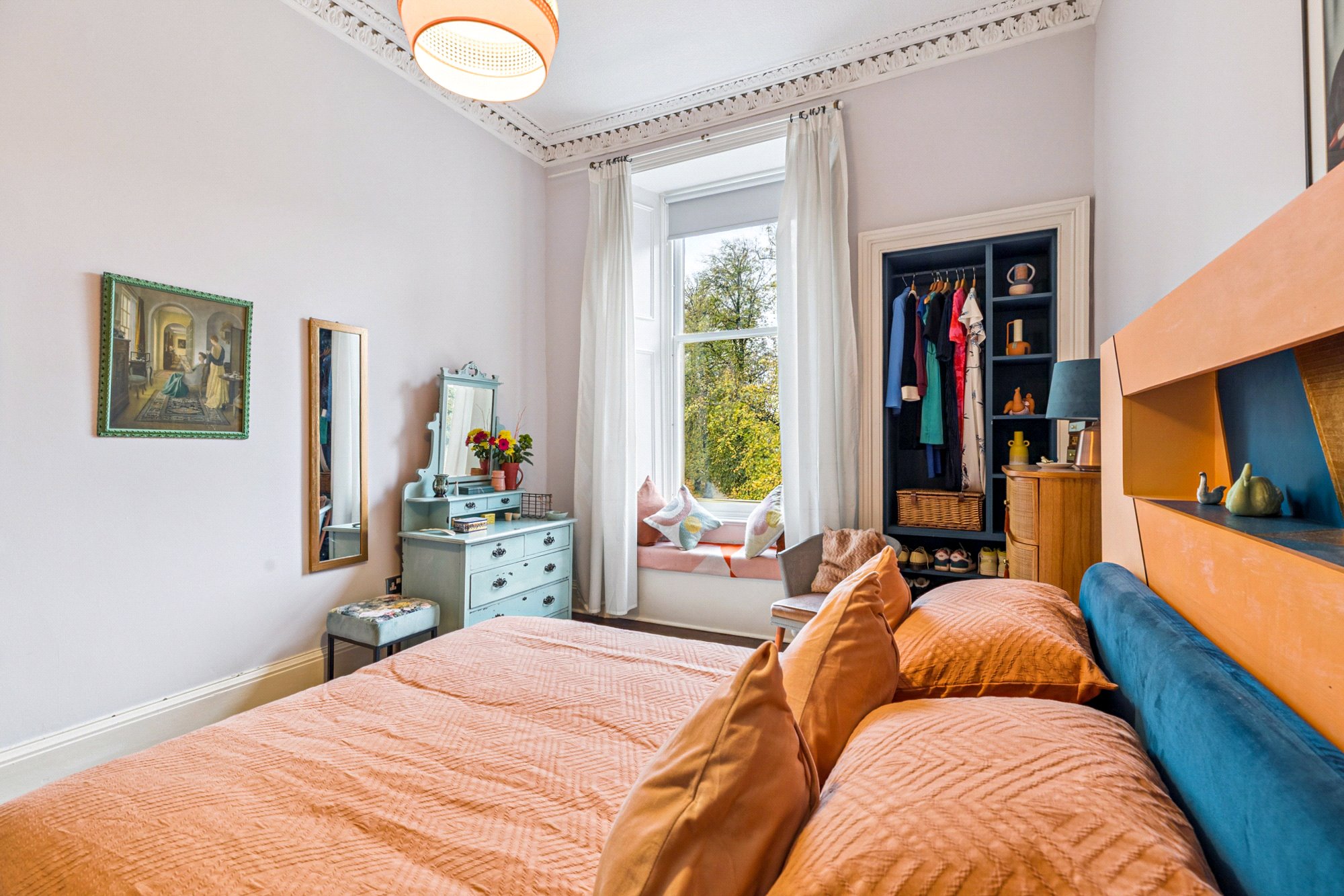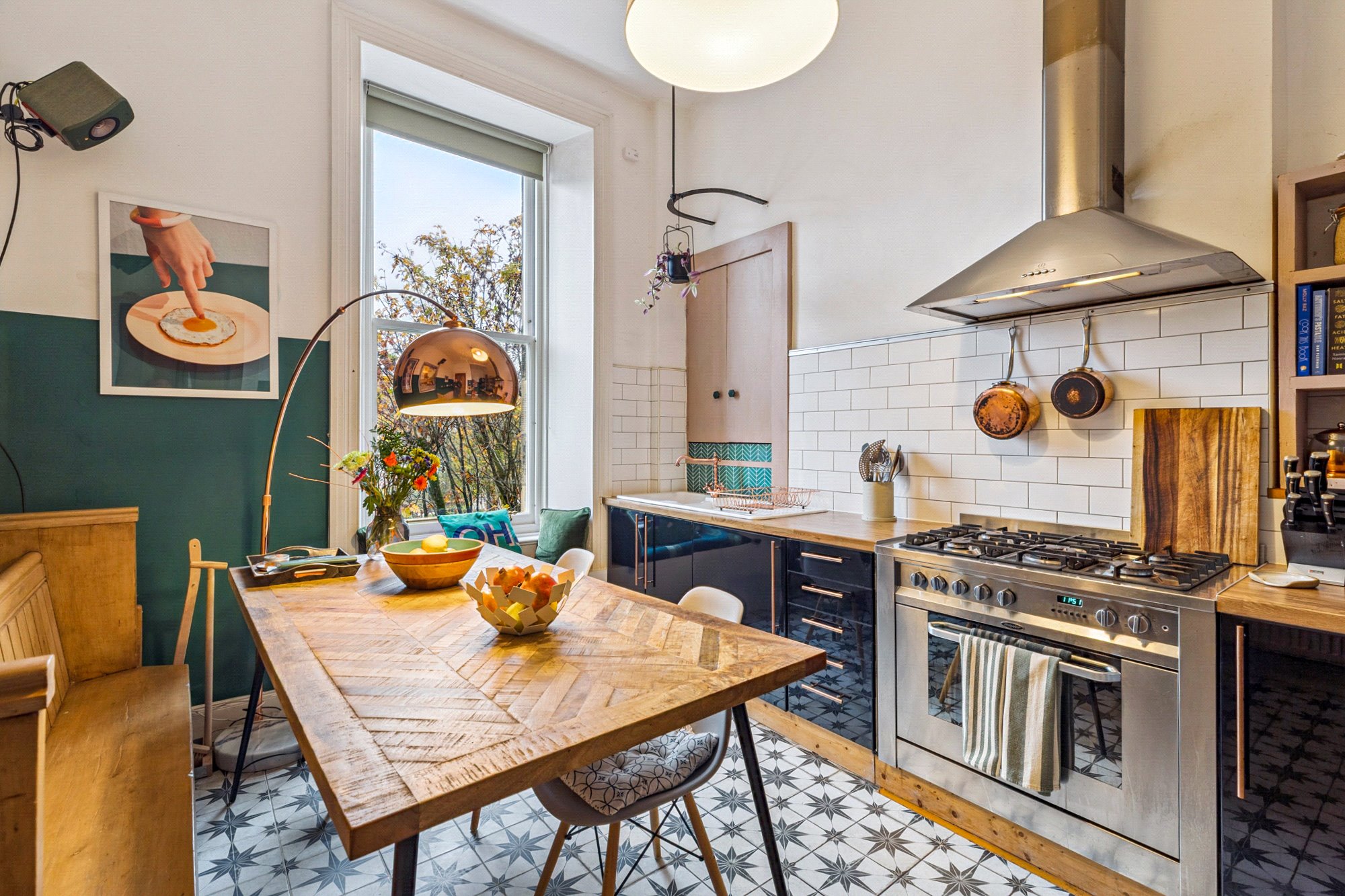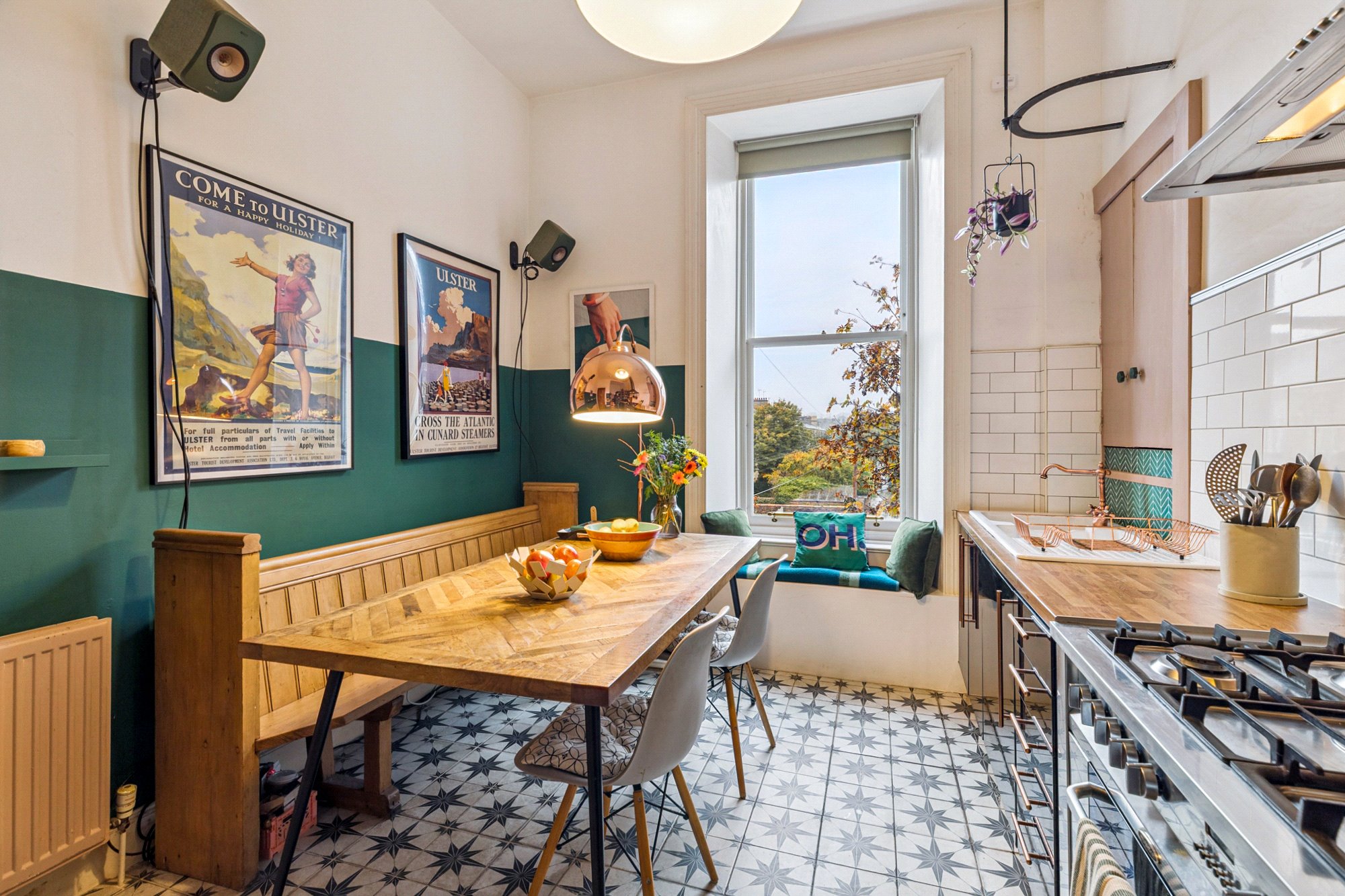 The lounge is an impressive focal point of the home; a bright, airy space enhanced by beautiful tall windows, high ceilings, and views over the park. A generous storage cupboard has been thoughtfully converted into a practical home office space. The dining kitchen is equally appealing, offering plenty of room for both cooking and entertaining, complete with a range of modern wall and floor-mounted units and ample worktop space.