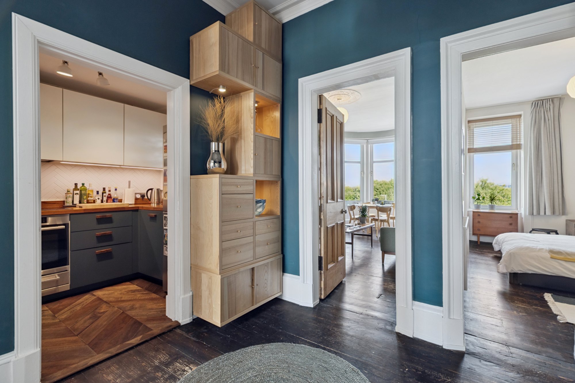 The accommodation of the flat itself comprises welcoming reception hallway with useful cupboard off, beautiful bay windowed lounge with feature fireplace and fabulous open aspect, modern kitchen with a range of base and wall mounted units, hardwood worktop and tiled splashback, two double sized bedrooms, with bedroom two currently utilised as a home office space and a tiled bathroom with white three piece suite and electric shower.