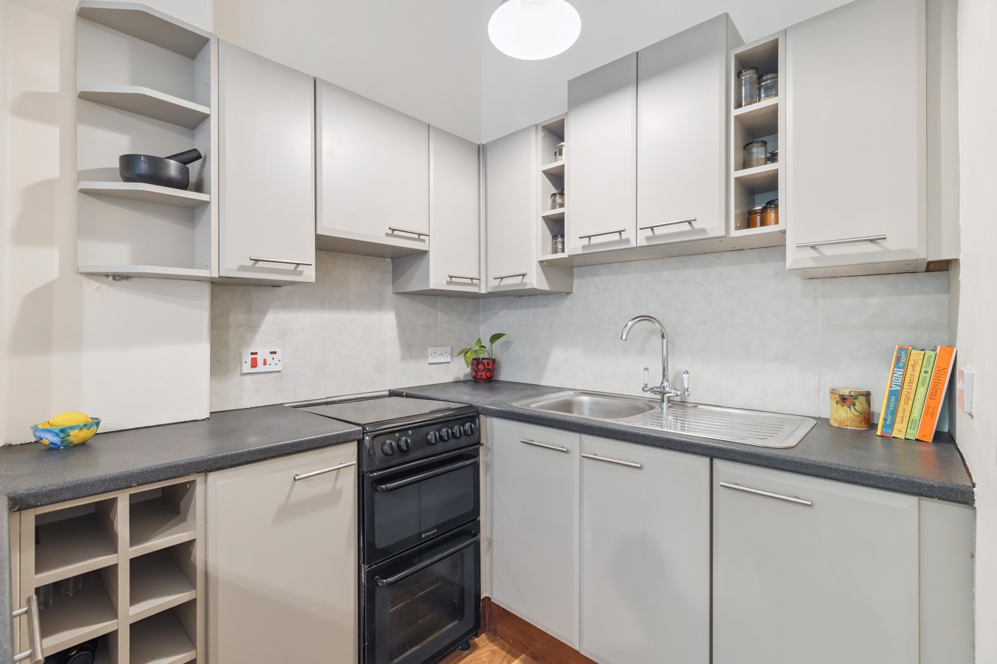 The accommodation of the flat itself comprises welcoming reception hallway with two cupboards off, bay windowed lounge with cornicing, refurbished floorboards and feature fireplace, dining sized kitchen with a range of base and wall mounted units, breakfast bar, ample space for dining table and chairs and utility cupboard off, double sized bedroom with refurbished floorboards and cornicing and tiled bathroom with white three piece suite and heated towel rail.