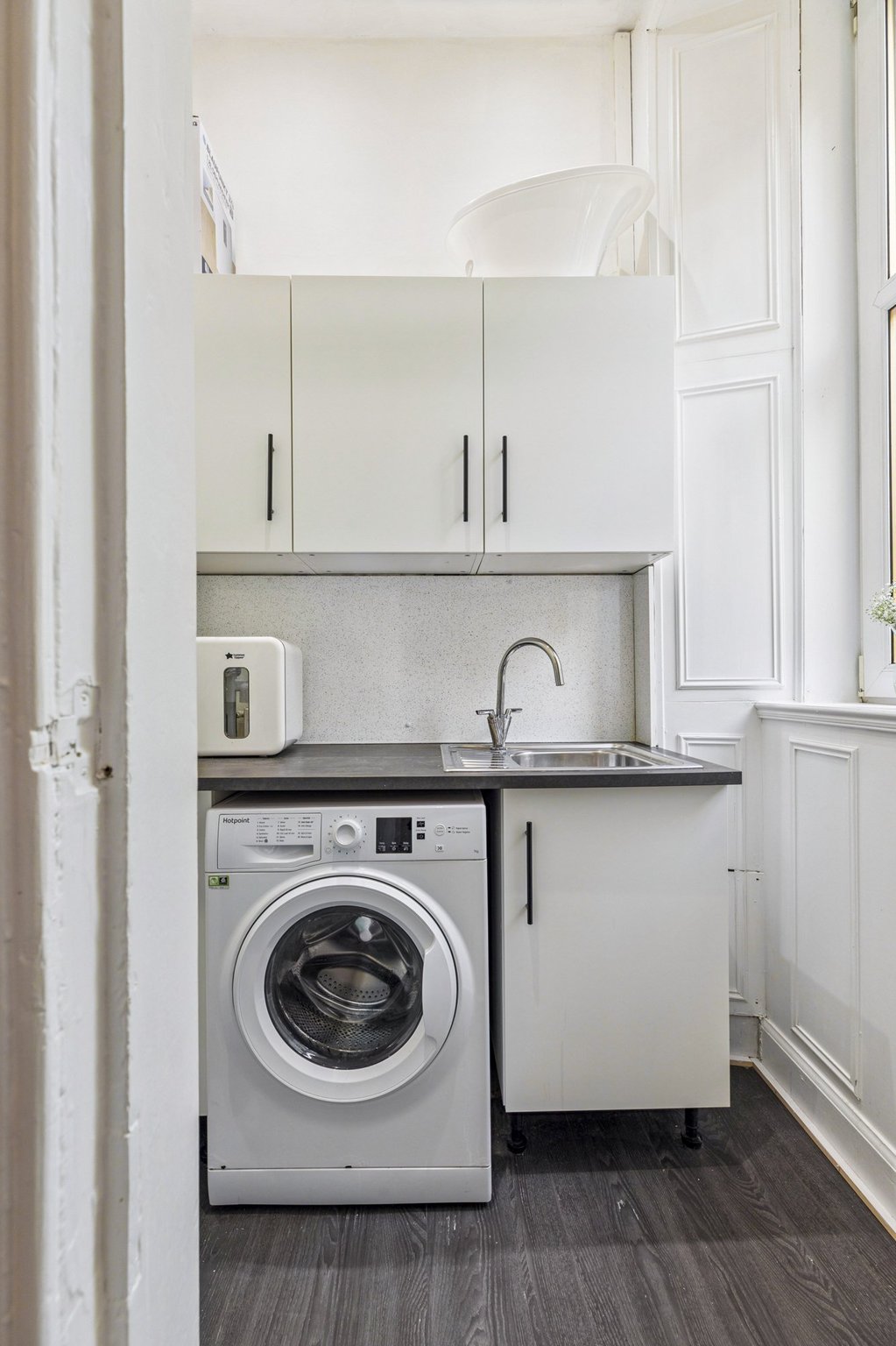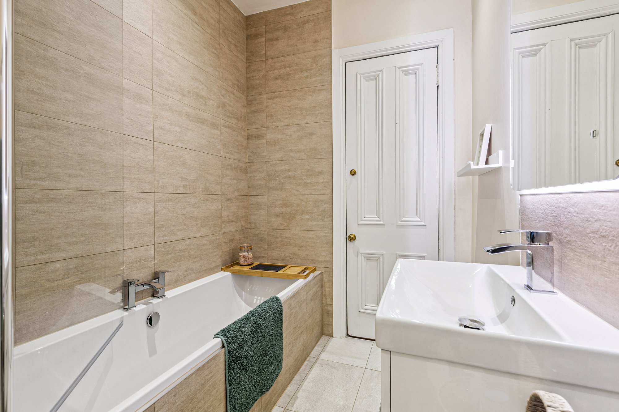 The accommodation of the flat itself comprises welcoming reception hallway with two cupboards off, gorgeous bay windowed lounge with cornicing, feature fireplace and refurbished floorboards, kitchen with a range of base and wall mounted and hardwood worktop, double sized bedroom one to the front of the flat with cornicing, second double sized bedroom to the rear of the flat which can be utilised very flexibly and a useful utility room off and a stunning tiled bathroom with white three piece suite, heated towel rail and vanity unit.