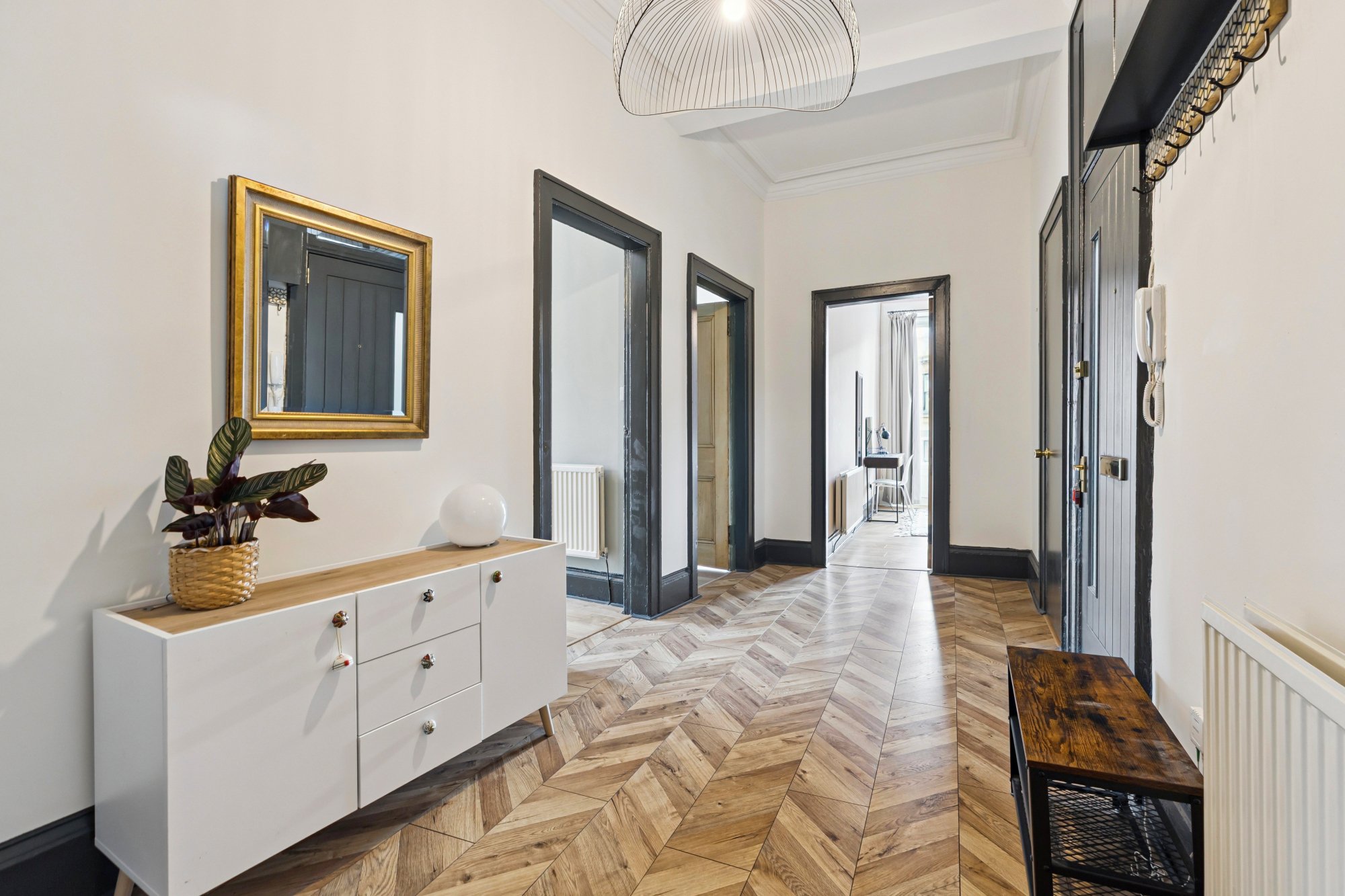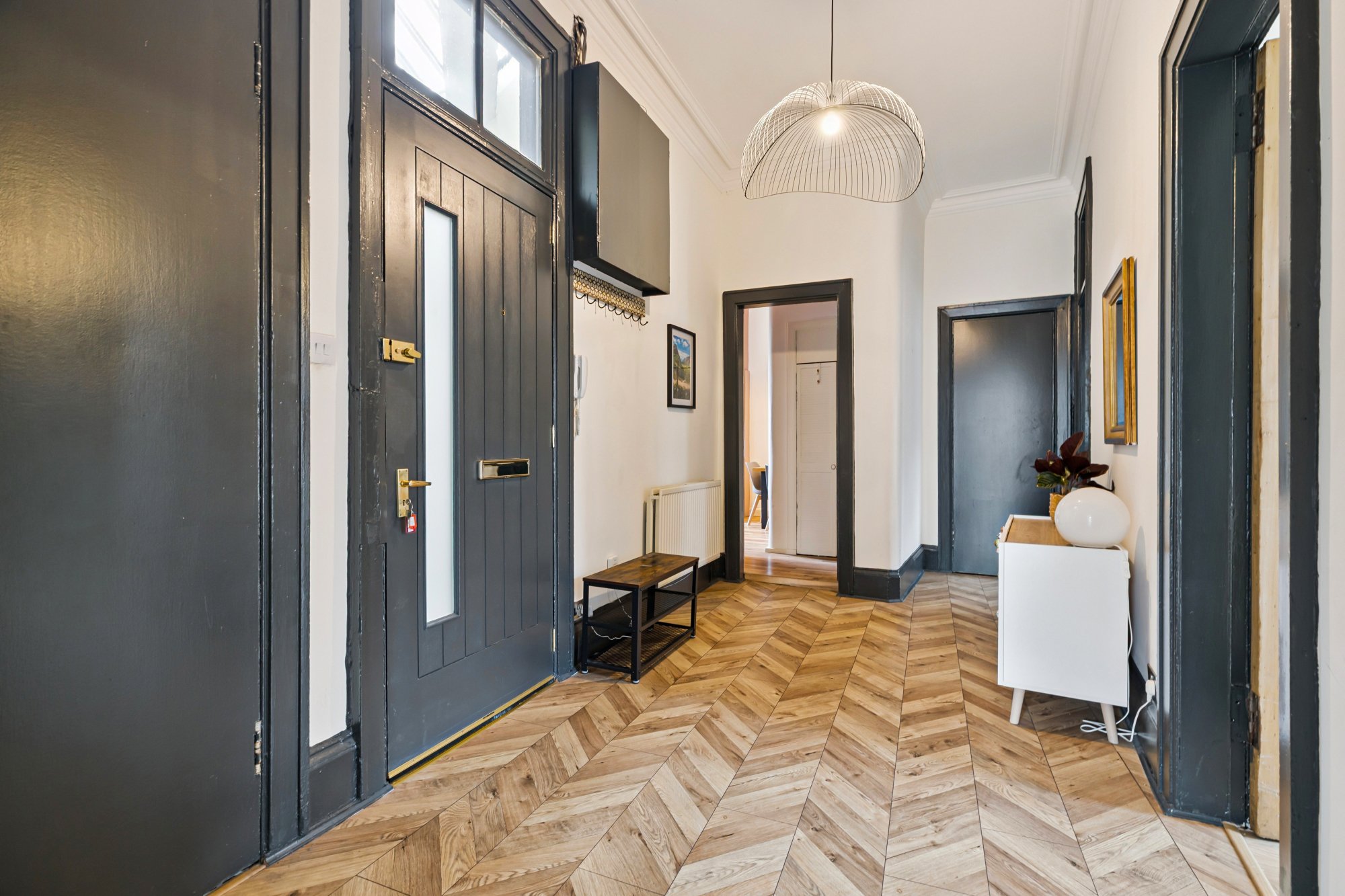 The accommodation of the flat itself comprises spacious reception hallway with large cupboard off, impressive corner lounge with fabulous dual aspect and cornice, gorgeous dining sized kitchen with a range of integrated appliances, base and wall mounted units, ample space for dining table and chairs and pantry cupboard off, three double sized bedrooms, all of which can be utilised very flexibly and a stunning tiled shower room with white two piece suite, vanity unit and walk-in shower.