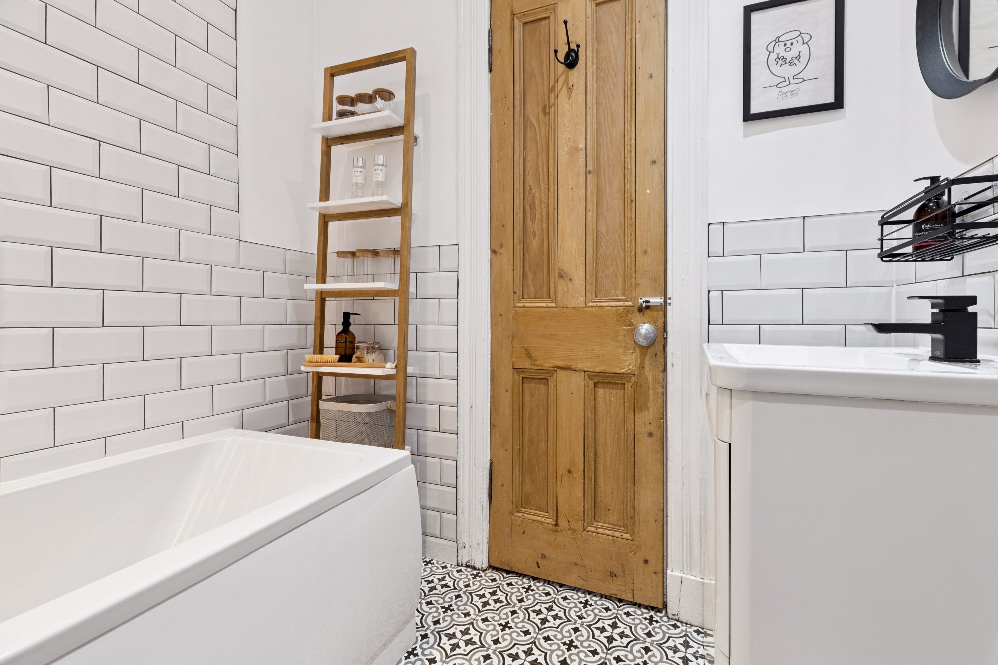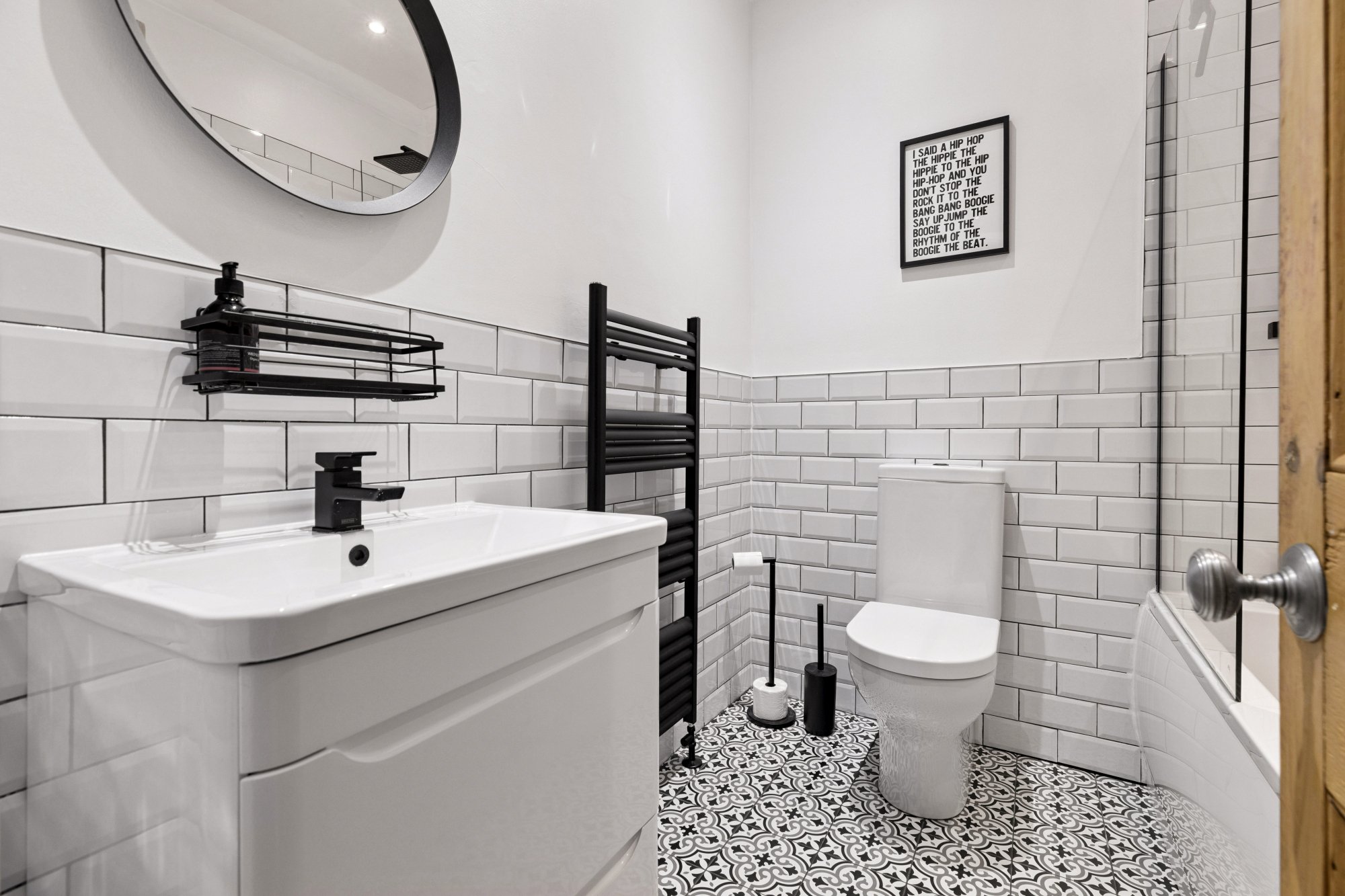 There are two well-proportioned double bedrooms. The principal bedroom benefits from a sleek en-suite shower room, finished with contemporary tiling and a walk-in shower. The second bedroom is equally generous and features built-in storage, offering flexibility for use as a guest bedroom or home office. Completing the accommodation is a stylish, fully tiled main bathroom, finished to a modern standard and fitted with a bath with shower over.