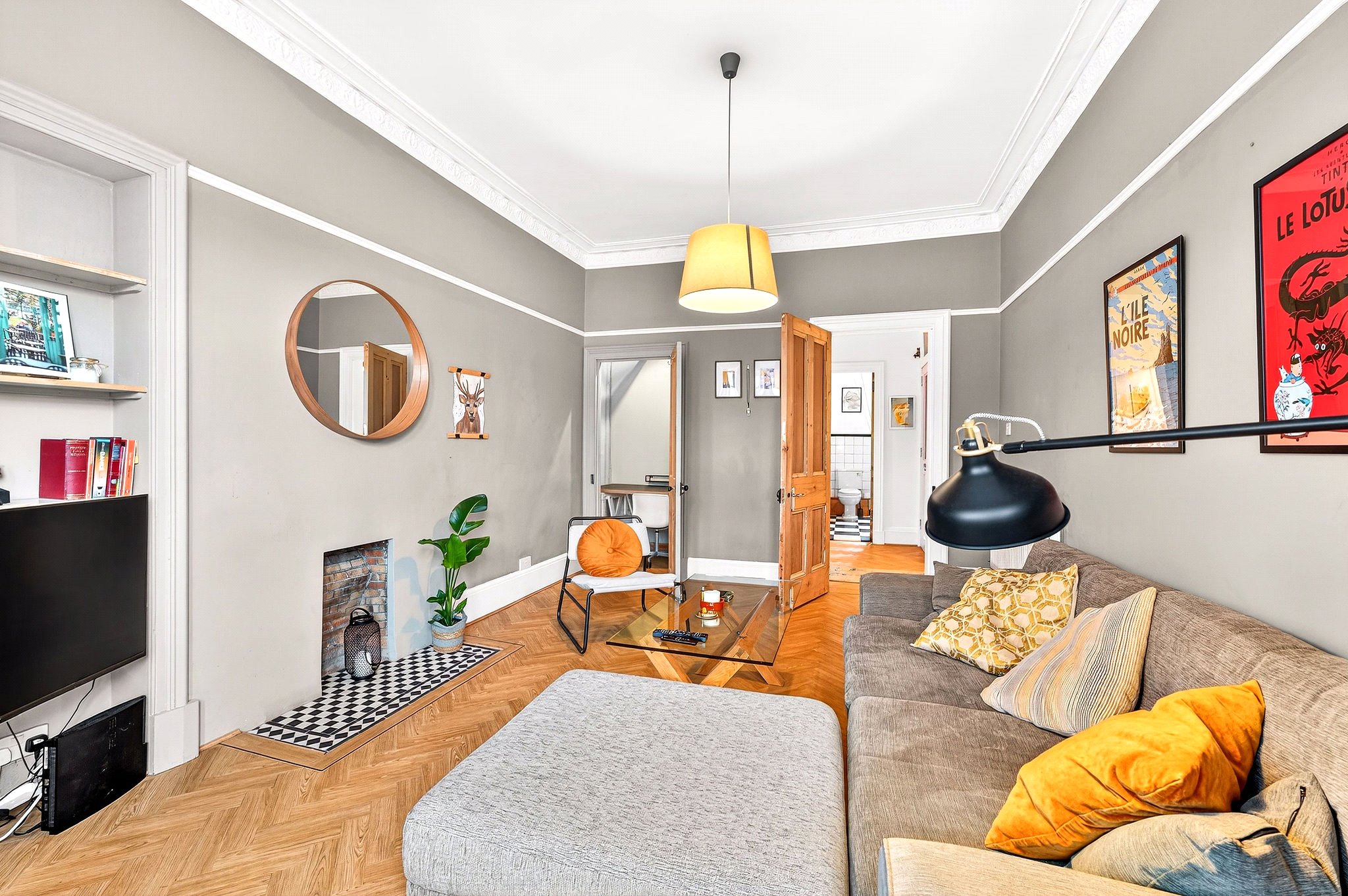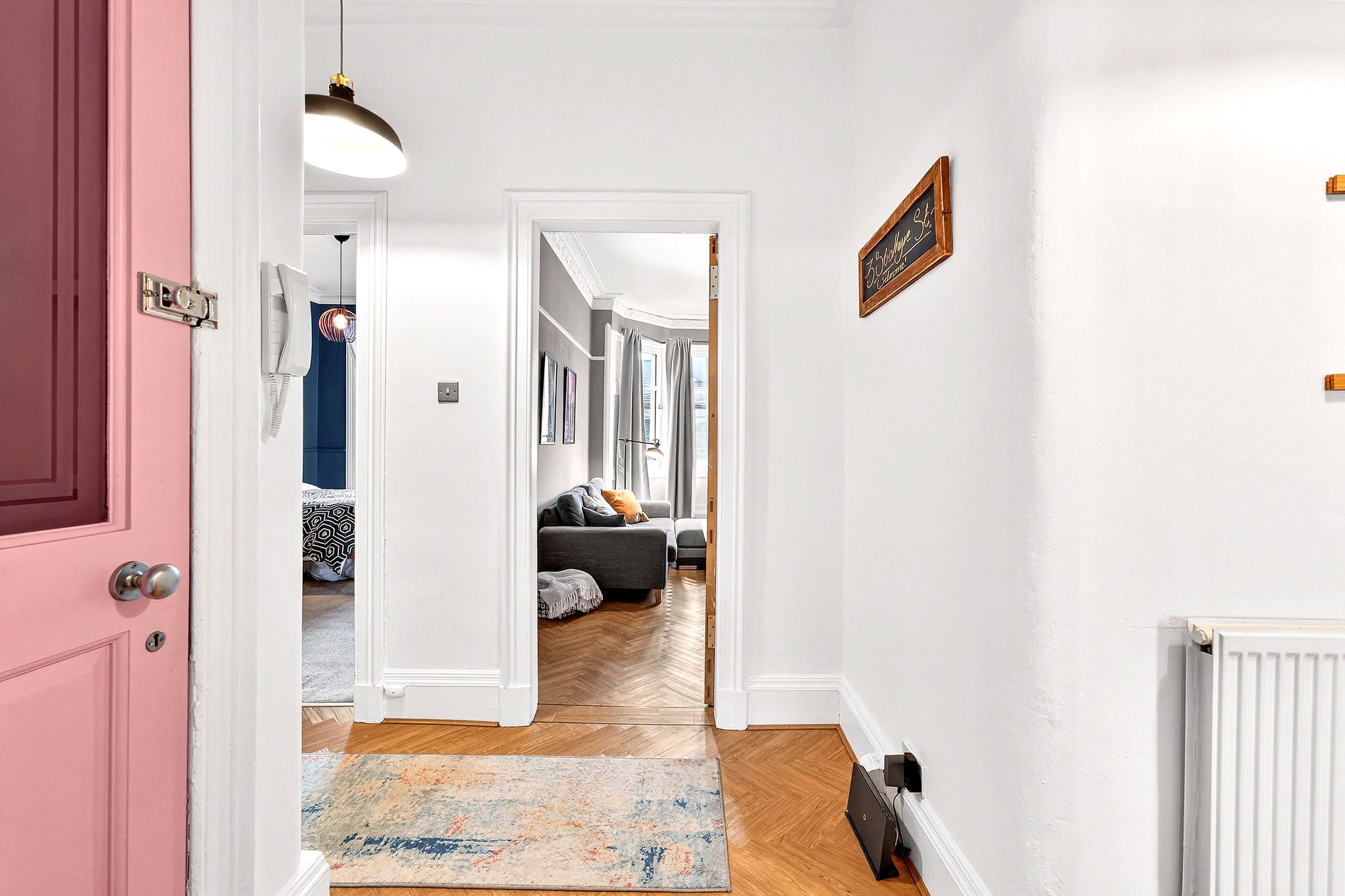 Throughout, traditional features such as high ceilings, detailed cornicing, and large sash windows blend beautifully with neutral décor to create a home of warmth and character.