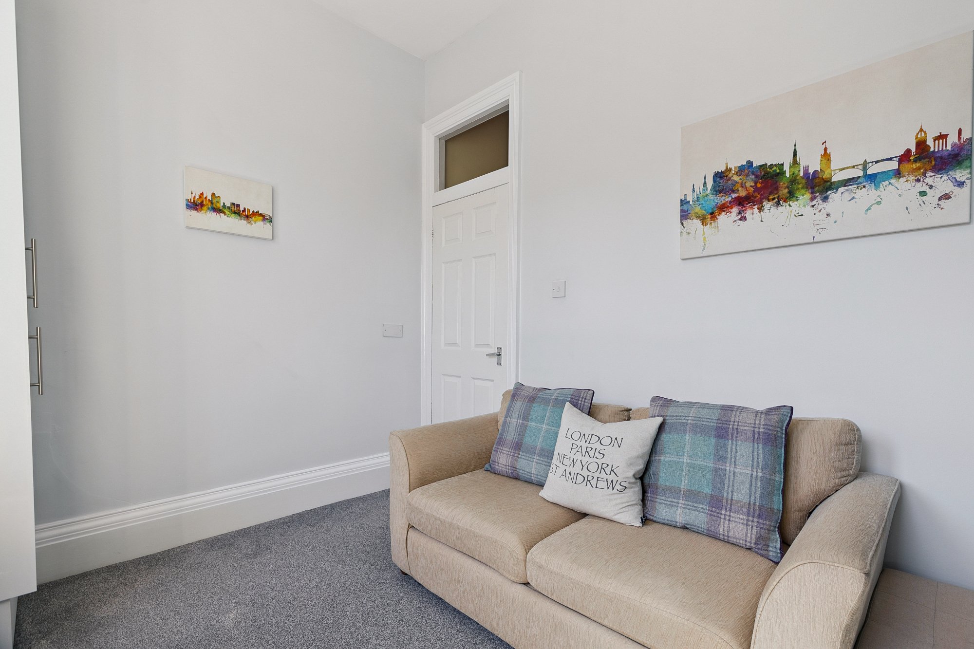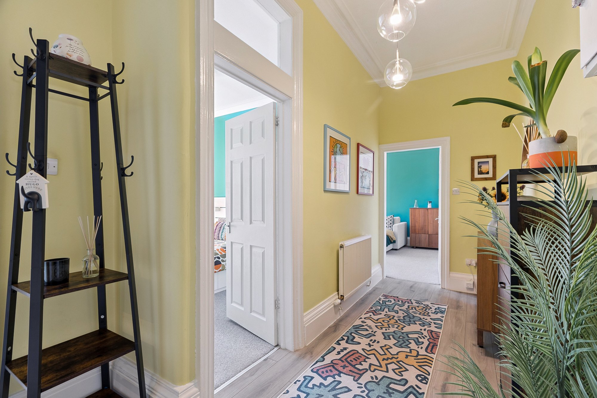 The accommodation of the flat itself comprises welcoming reception hallway, beautiful bay windowed lounge with cornicing, modern kitchen with a range of base and wall mounted units and worktop with matching splashback, spacious bedroom one with cornice plaster, second bedroom that is currently utilised as a home office/study and gorgeous tiled bathroom with white two piece suite, vanity unit, heated towel rail and separate walk-in shower.