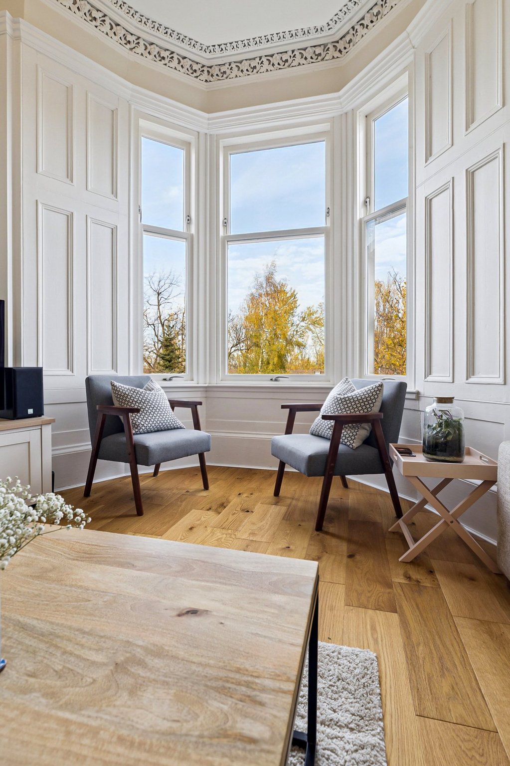 A fabulous and quite unique main door upper conversion with private garden space to the front and rear, situated in this quiet yet convenient pocket of Mount Florida.