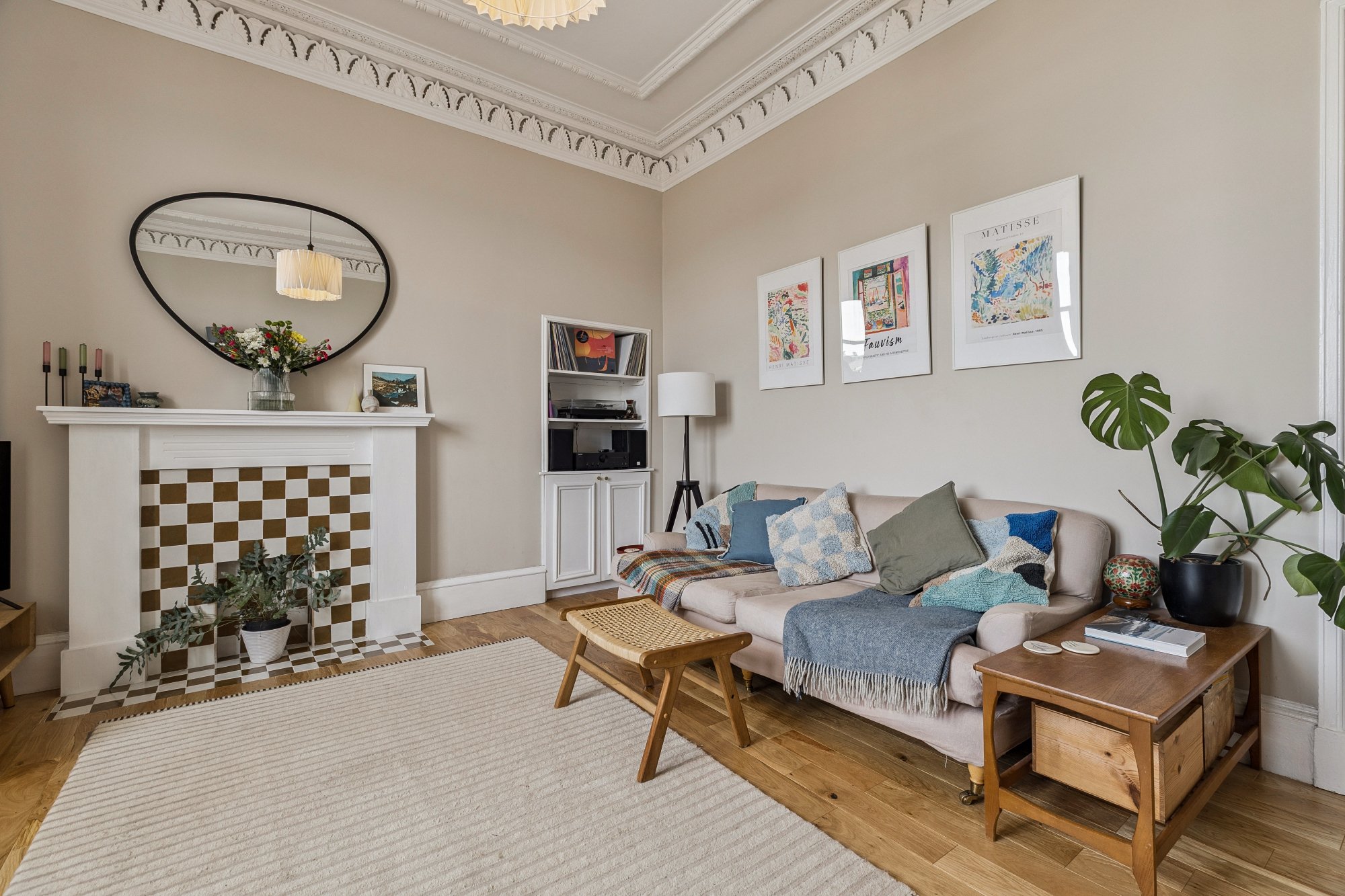 Set within a handsome blonde sandstone tenement in the heart of Strathbungo, this bright and beautifully proportioned two-bedroom first floor flat offers an appealing blend of period character and modern comfort.