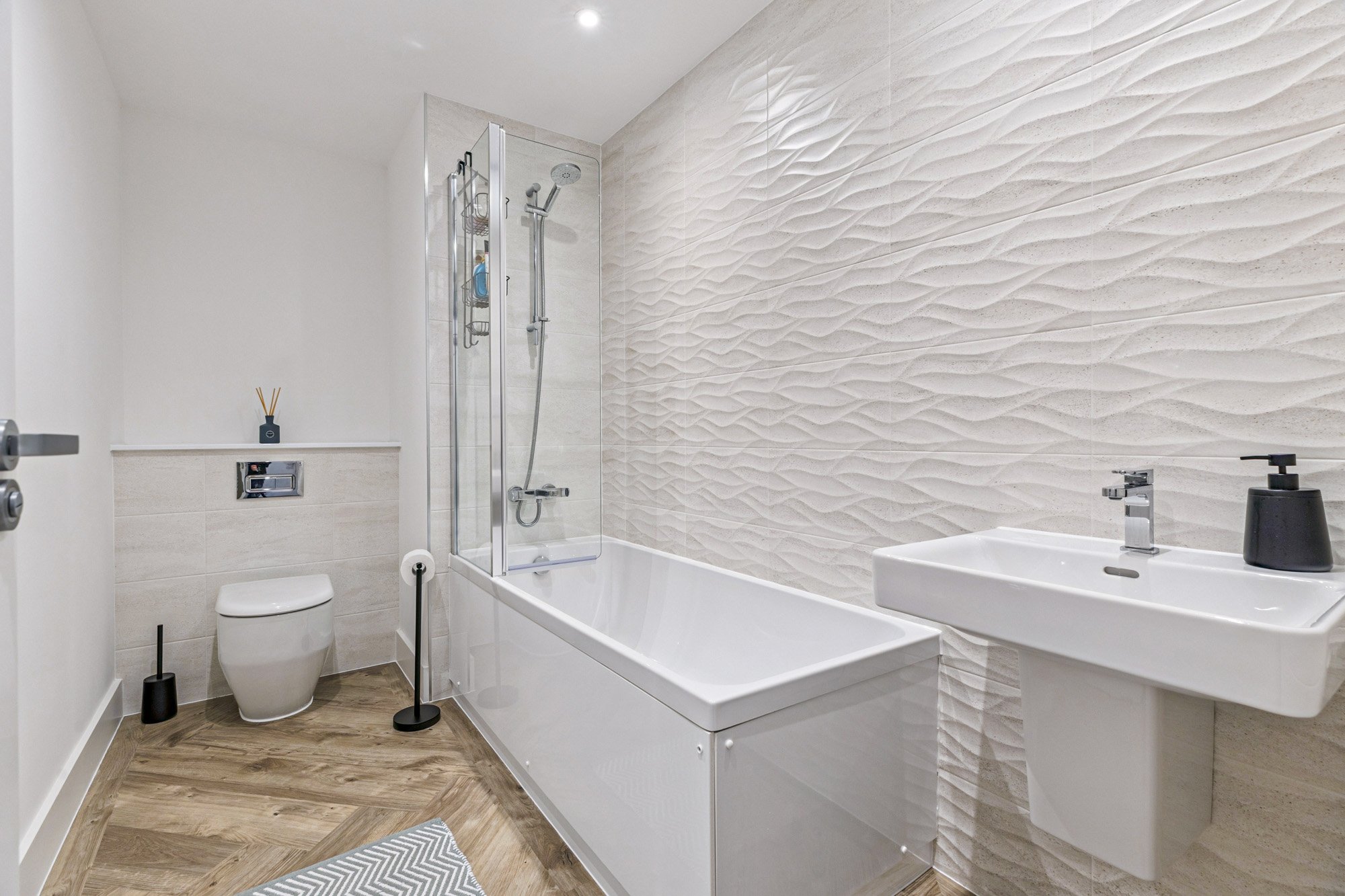 The double bedroom is generously proportioned and features integrated wardrobes along with large windows providing excellent natural light. A well-appointed, contemporary bathroom fitted with a white three-piece suite and shower over the bath completes the accommodation.
