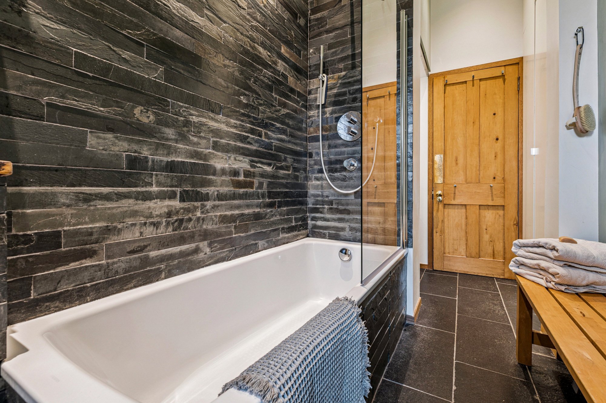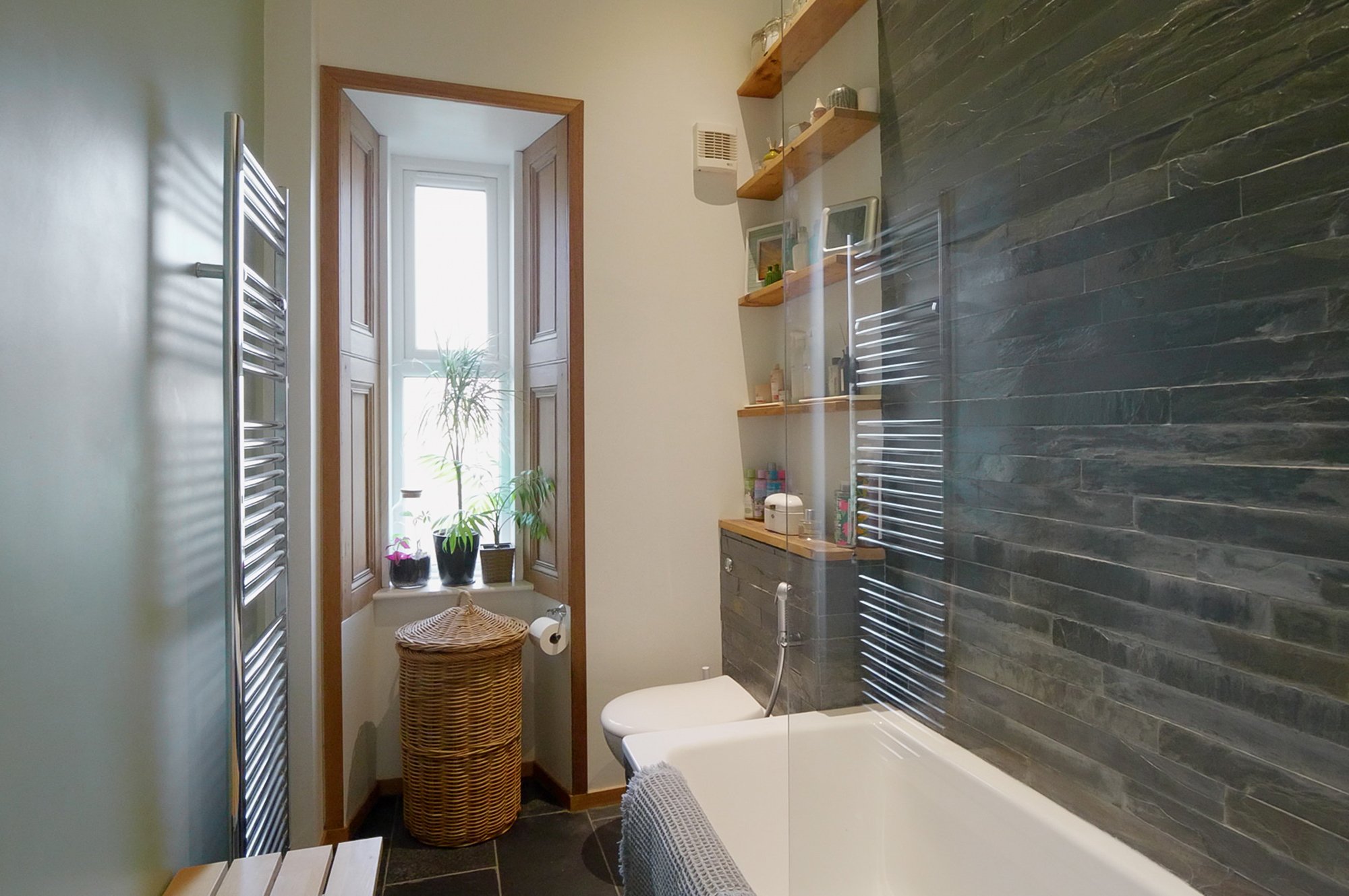The bathroom features underfloor heating, slate tiling on the floor and walls, bespoke wash hand basin area, over bath shower, quality German fittings and floor-to-ceiling concealed storage.
