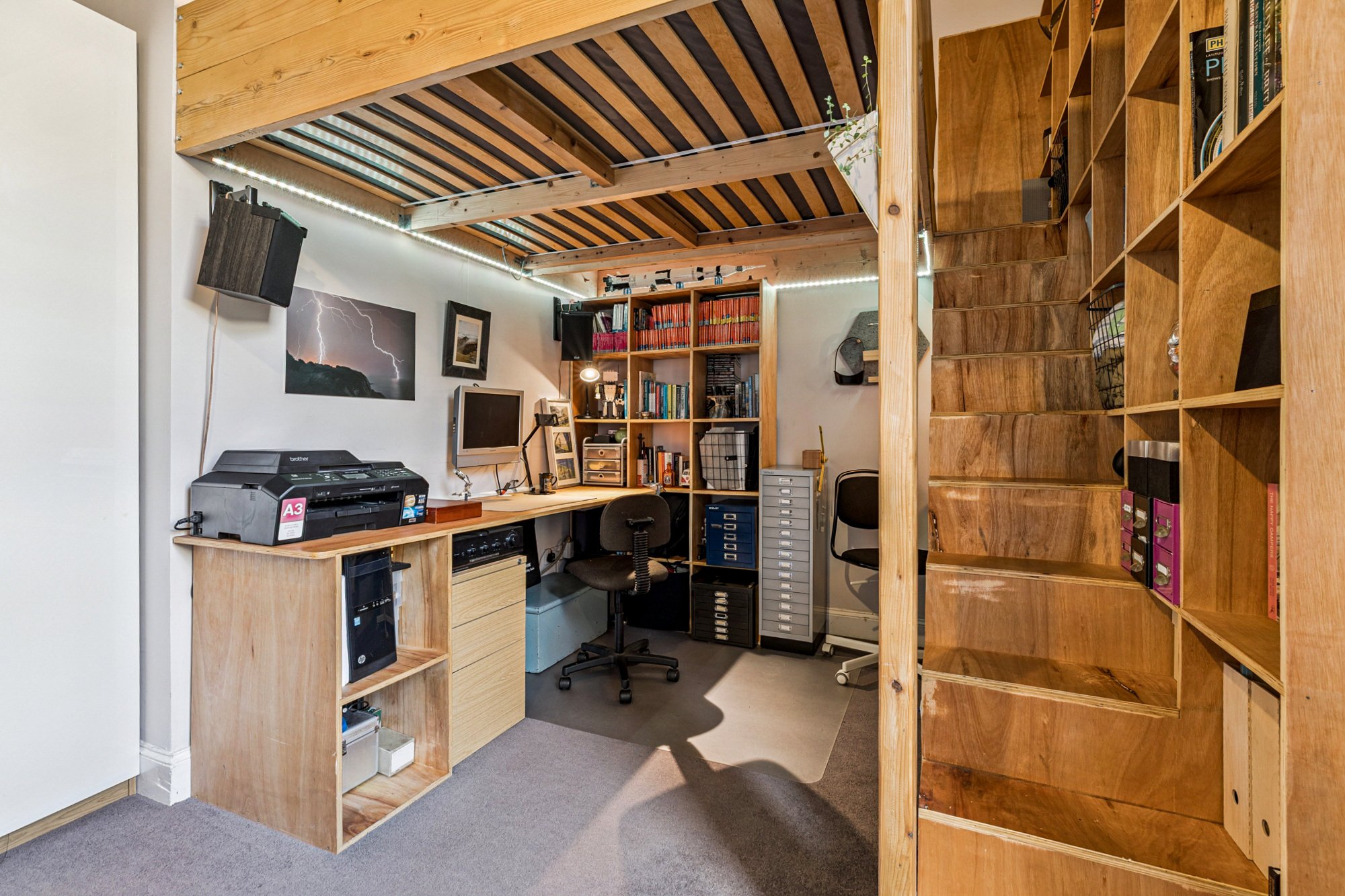 There are three double-sized bedrooms, the master bedroom featuring an intricate cast iron fireplace. The rear bedroom has an architect-designed mezzanine with a king-sized bed reached by stairs stretching out from shelving built around a study area.