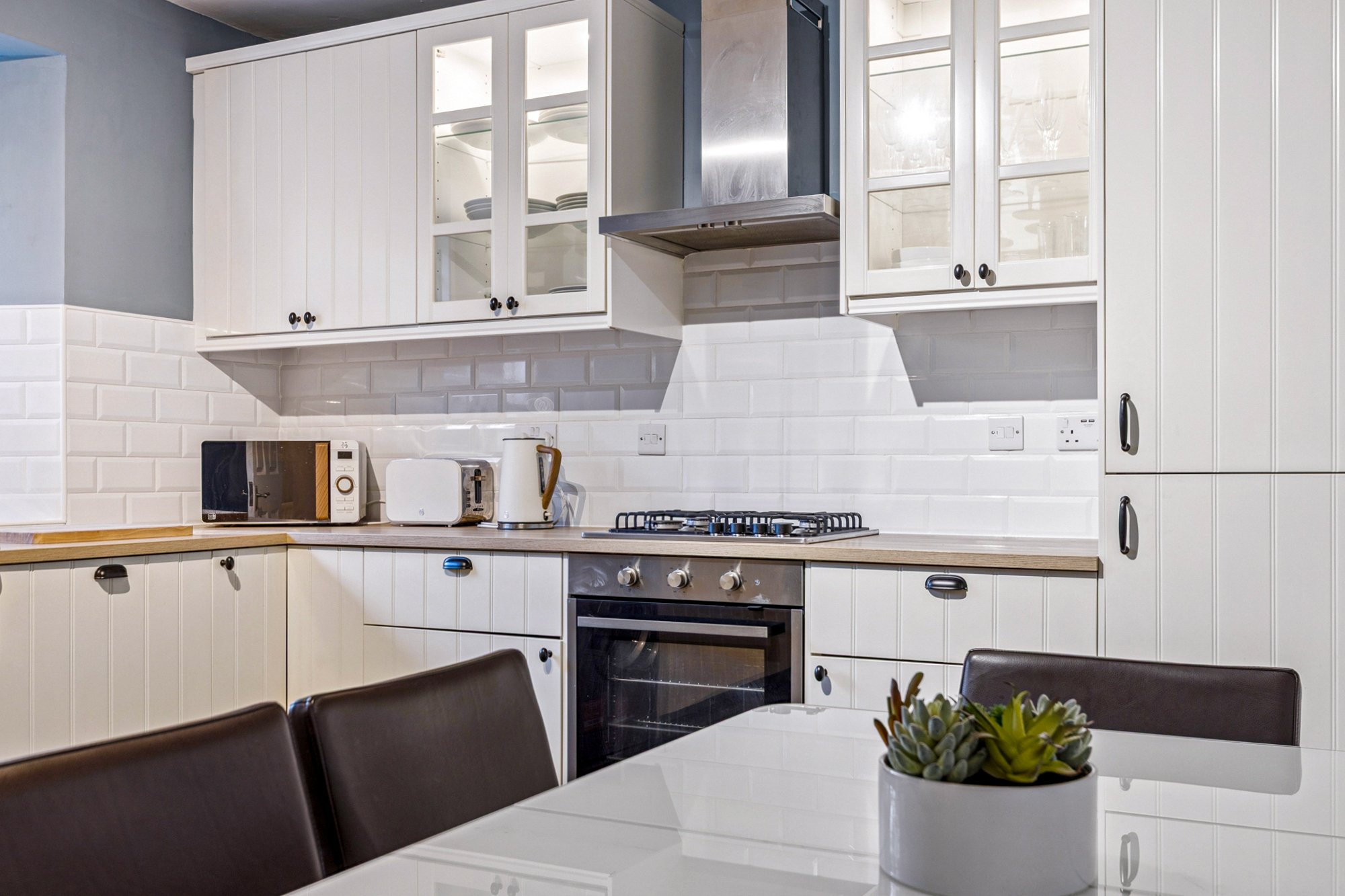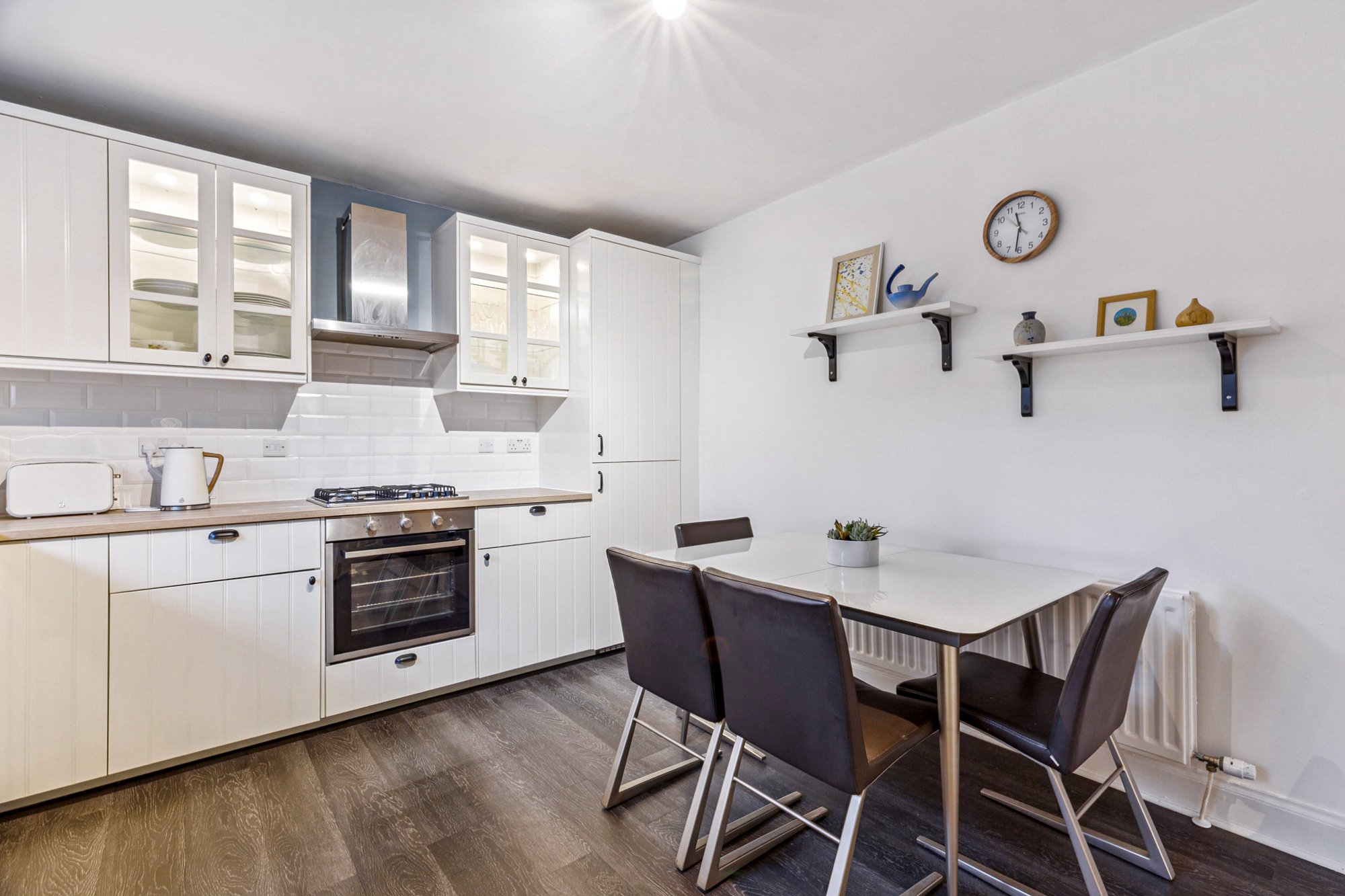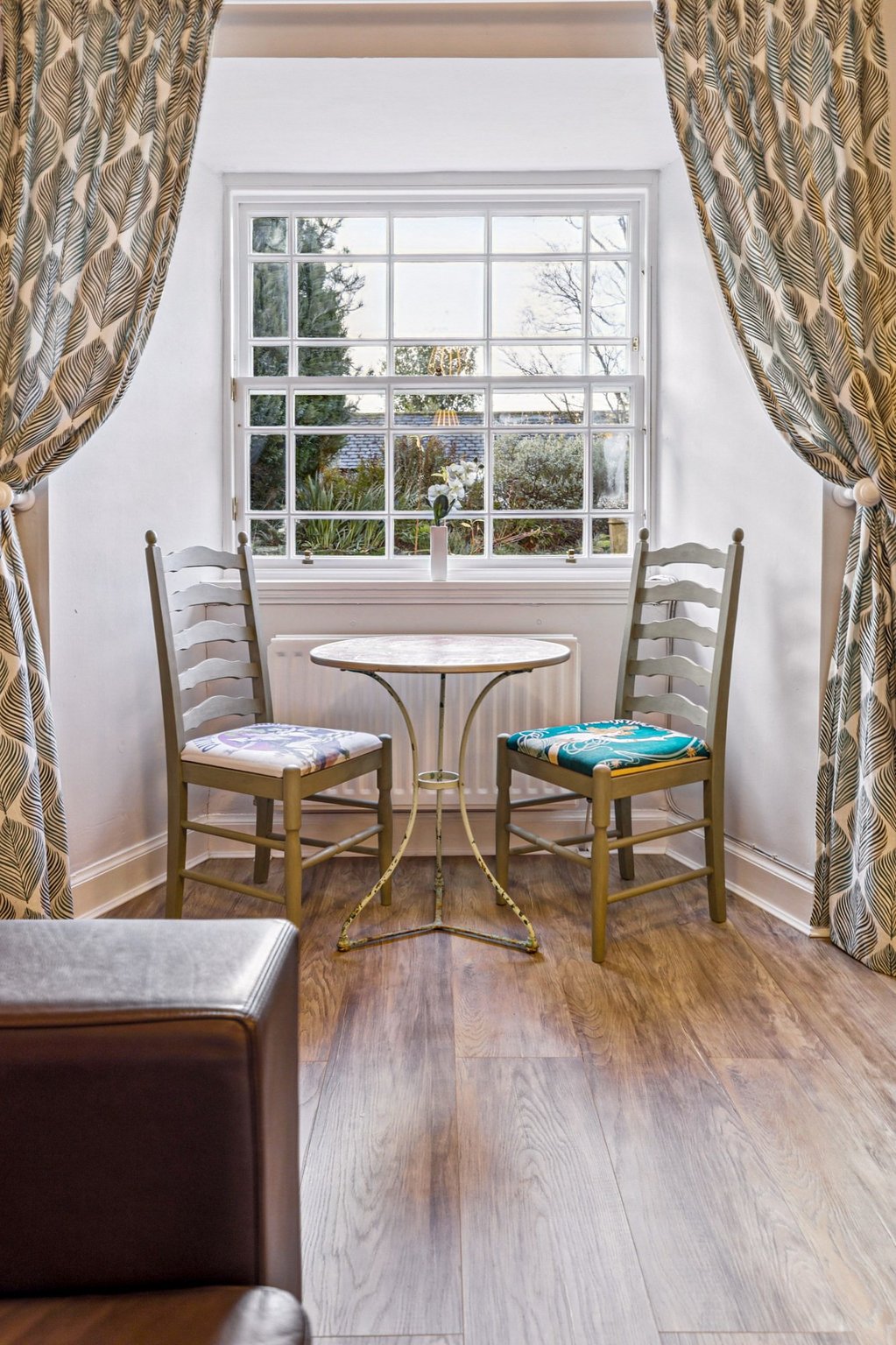 The lounge/dining room provides an impressive setting for both relaxing and entertaining, while the dining kitchen offers ample space for cooking and dining. The property boasts large windows, which fill the rooms with natural light, creating a bright and spacious home. The bedroom is notably generous in scale, and the additional smaller room offers flexible use as a study, dressing room, or occasional guest space.