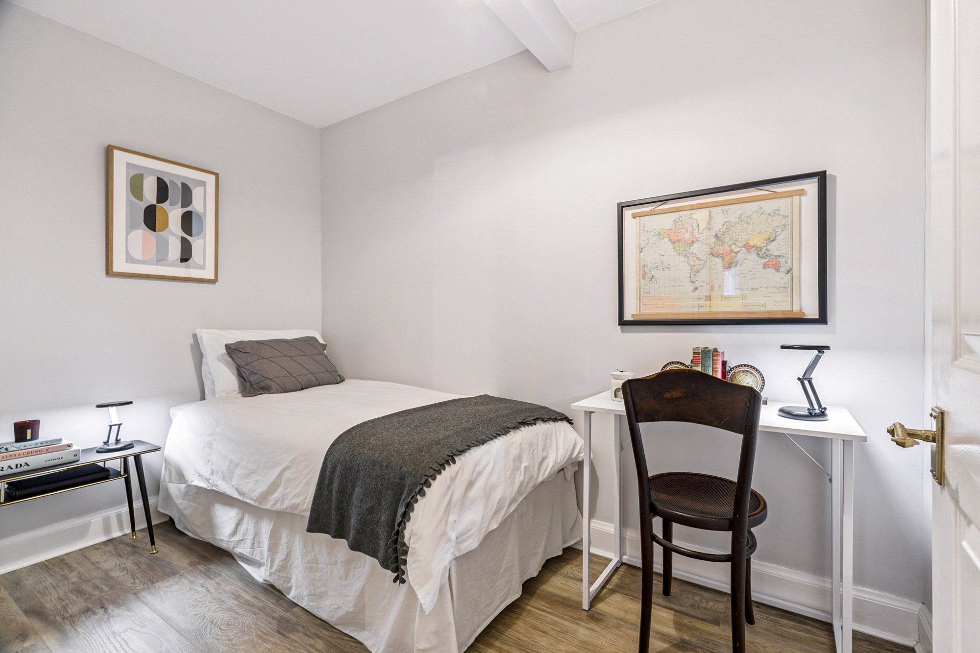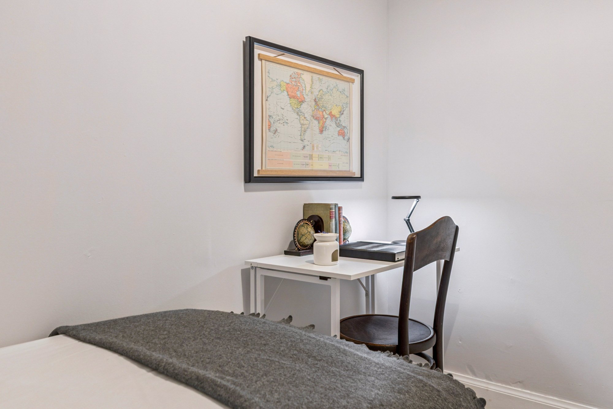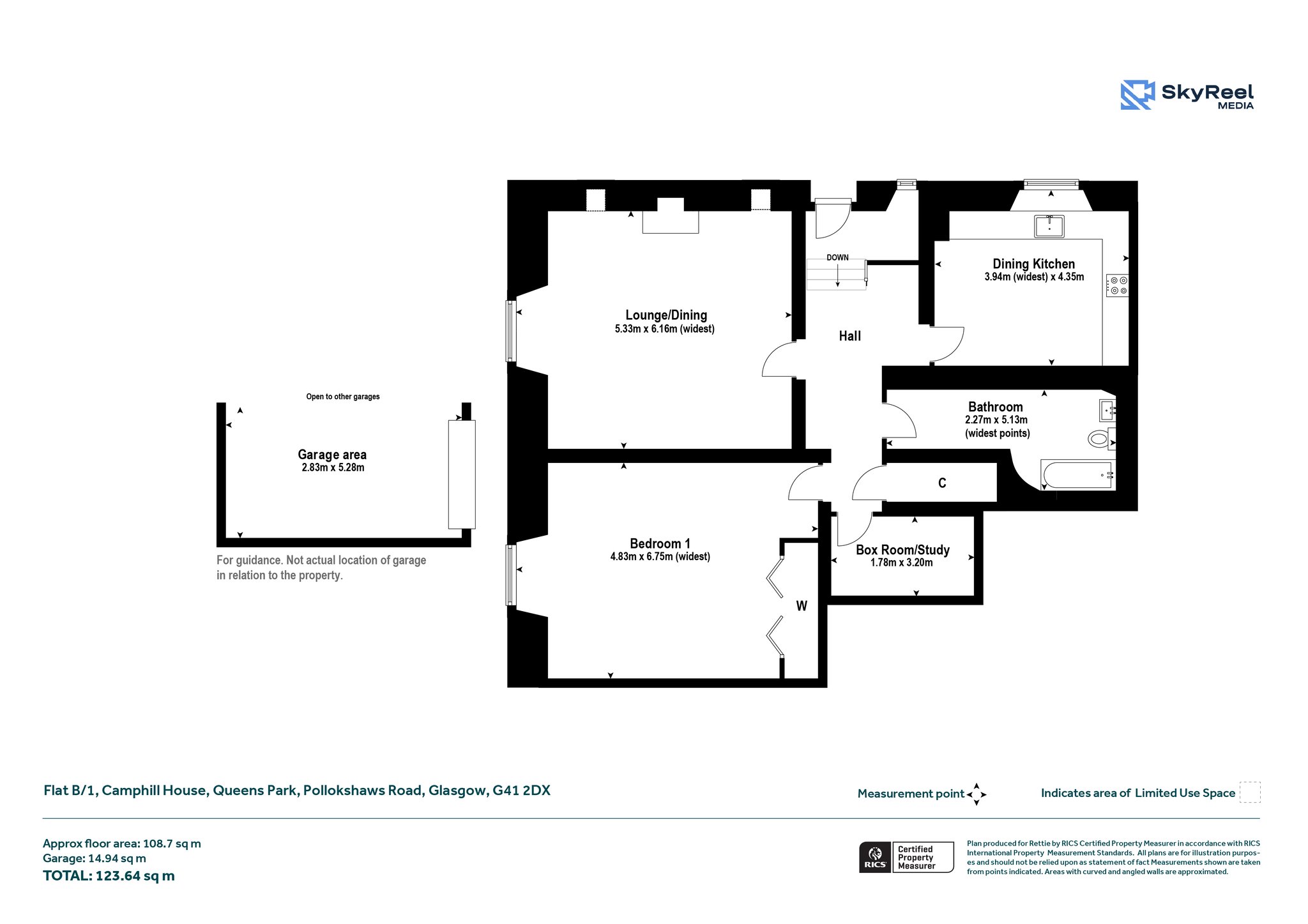 The lounge/dining room provides an impressive setting for both relaxing and entertaining, while the dining kitchen offers ample space for cooking and dining. The property boasts large windows, which fill the rooms with natural light, creating a bright and spacious home. The bedroom is notably generous in scale, and the additional smaller room offers flexible use as a study, dressing room, or occasional guest space.