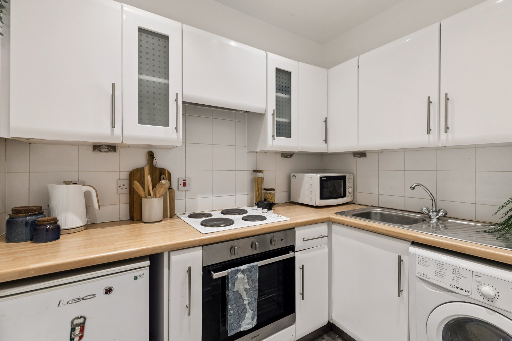The accommodation of the flat itself comprises welcoming reception hallway with cupboard off, bay windowed lounge with cornicing and feature fireplace, two double sized bedrooms, both of which can be utilised as home office or study space, kitchen with a range of base and wall mounted units and tiled splashback and tiled bathroom with white three piece suite and over bath shower.